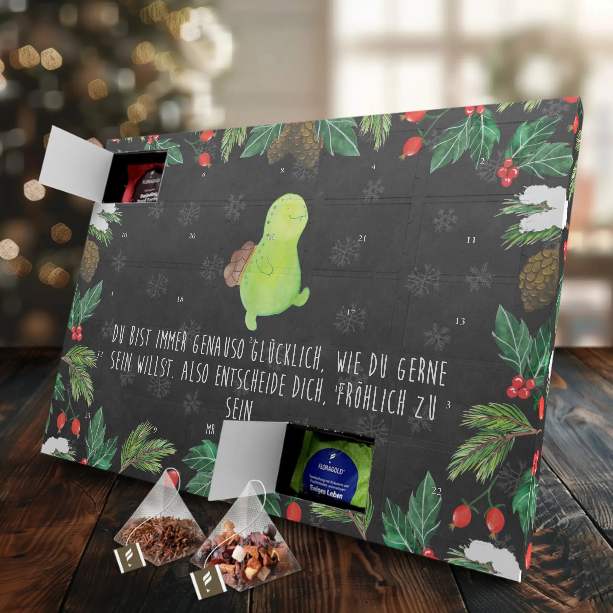 Der Tee Adventskalender mit dem fröhlichen Motiv "Schildkröte pfeift" von Mr. & Mrs. Panda ist das perfekte Geschenk für alle, die Lebensfreude und kleine Glücksmomente schätzen. Mit seiner liebevollen Gestaltung und dem inspirierenden Text "Du bist immer genauso glücklich, wie du gerne sein willst. Also entscheide dich, fröhlich zu sein." zaubert dieser Kalender ein Lächeln auf jedes Gesicht.