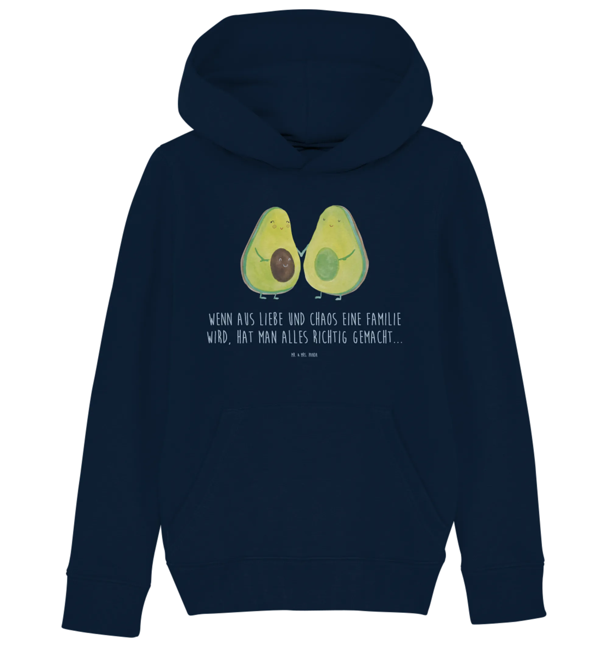 Unser liebevoll gestalteter Kinder Hoodie aus der Avocado Kollektion von Mr. & Mrs. Panda zeigt ein niedliches Avocado Pärchen, das sich an den Händen hält und verliebt anschaut. Der Hoodie trägt den warmen Spruch: „Wenn aus Liebe und Chaos eine Familie wird, hat man alles richtig gemacht...“ – perfekt als Geschenk zur Geburt, Babyparty oder zum Geburtstag.