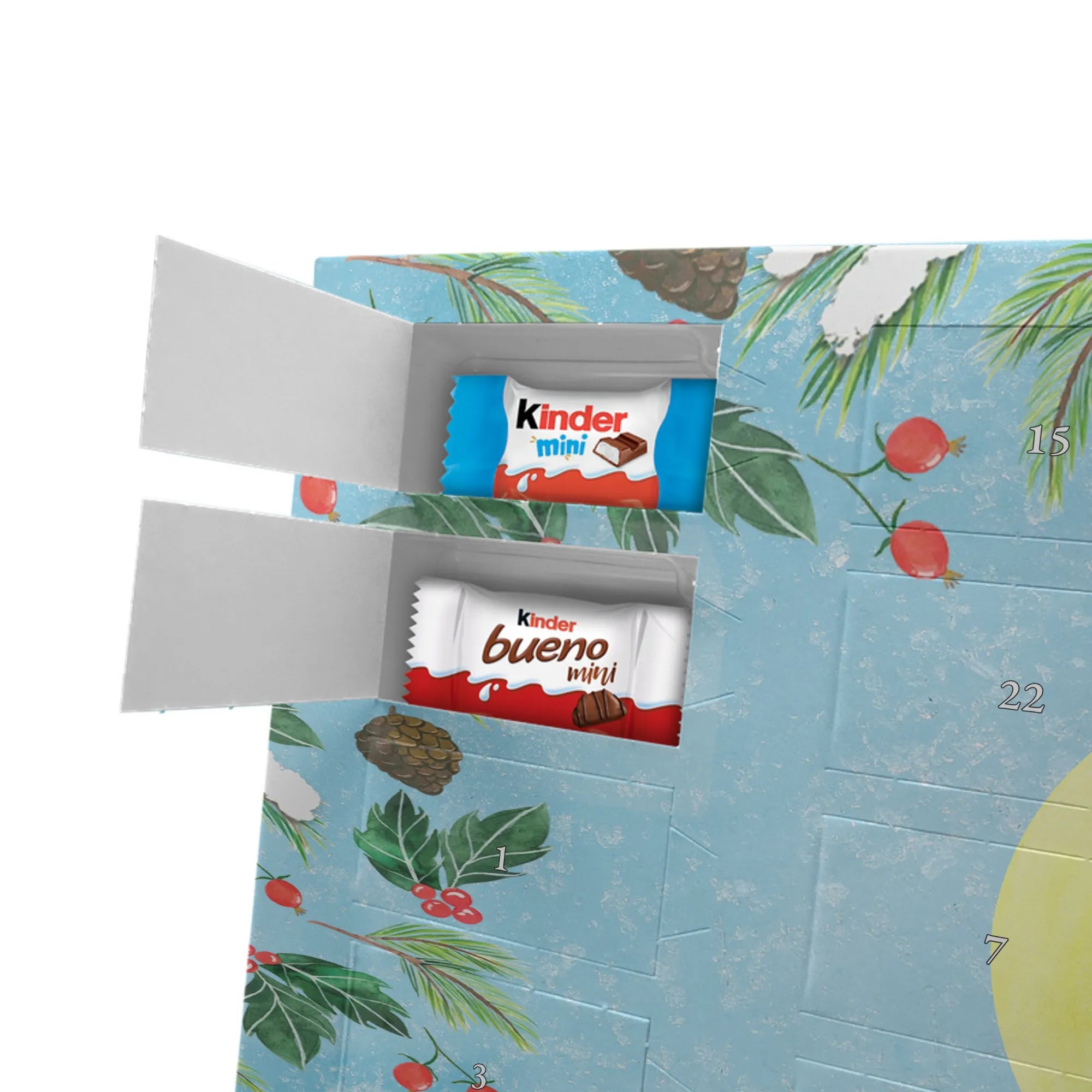 Fröhlich, persönlich und süß – unser Personalisierter Schoko Adventskalender von Mr. & Mrs. Panda bringt Wärme in die Adventszeit. Der Kalender ist liebevoll bedruckt mit wunderschönen Motiven & Sprüchen von Mr. & Mrs. Panda und lässt sich mit deinem Wunschnamen oder Wunschtext personalisieren, sodass jedes Türchen eine kleine, persönliche Überraschung wird. Die brillante Druckqualität in Kombination mit seidenmatter Oberflächenveredelung verleiht dem Kalender eine hochwertige Haptik. Auch die Seitenflächen sind bedruckt, damit dein Geschenk von allen Seiten überzeugt. Maße: 355 mm x 245 mm x 11 mm – praktisch und stilvoll. Besonderheit: kann aufgehängt oder aufgestellt werden, perfekt für Fensterbank, Kommode oder als Dekoration an der Wand. Gefüllt mit kinder® Schokolade: Adventskalender gefüllt mit kinder® Schokolade; Inhalt: kinder® Schoko-Bons, kinder® Bueno mini und kinder® Schokolade mini. Ob als Geschenk für die Liebsten oder als süße Belohnung für dich selbst – dieser Adventskalender verbindet tolles Design mit leckerem Inhalt und persönlicher Note.