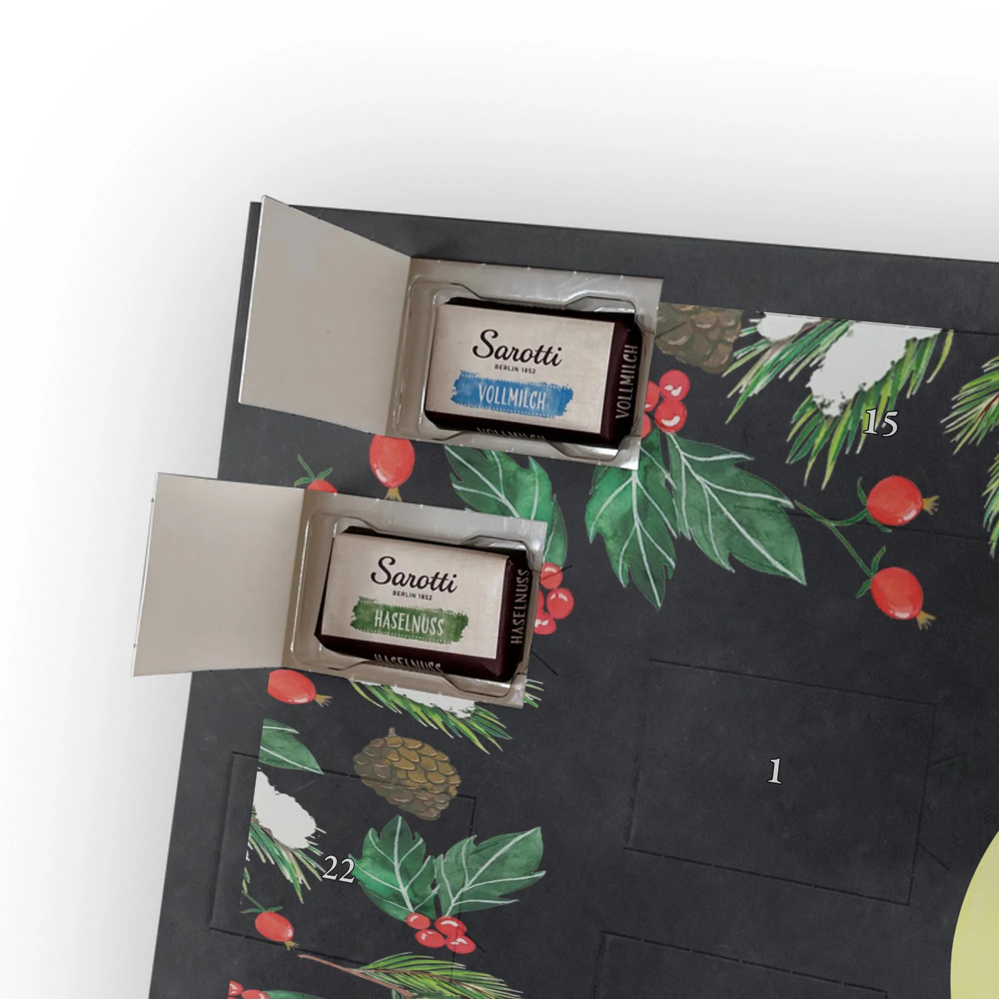 Mach die Adventszeit persönlich mit unserem Personalisierter Adventskalender mit Schokolade von Mr. & Mrs. Panda. Jeder Kalender ist liebevoll illustriert und bedruckt mit charmanten Sprüchen und Motiven – perfekt als Geschenk oder Deko für dein Zuhause. Du kannst deinen Wunschname oder einen kurzen Text hinzufügen, damit der Kalender ganz individuell wird. Die brillante Druckqualität und die seidenmatte Oberflächenveredelung sorgen für eine edle Optik, und auch die Seitenflächen sind komplett bedruckt. Maße: 233 mm x 178 mm x 24 mm. Die clevere Konstruktion erlaubt es, den Kalender aufzuhängen oder aufzustellen – flexibel und dekorativ zugleich. Gefüllt mit MARKENNAMEN Schokolade sowie köstlichen Schokoladenkugeln ist jeder Tag im Advent eine süße Überraschung. Wichtiger Hinweis: (Kann Spuren von Haselnüssen, Mandeln, Gluten und Soja enthalten!), kühl und trocken lagern! Egal ob für Kinder, Partner oder beste Freundin – dieser personalisierte Adventskalender bringt ein Lächeln und zaubert gemütliche Vorfreude. Bestell jetzt und gestalte deine Adventszeit mit einem Hauch Mr. & Mrs. Panda.