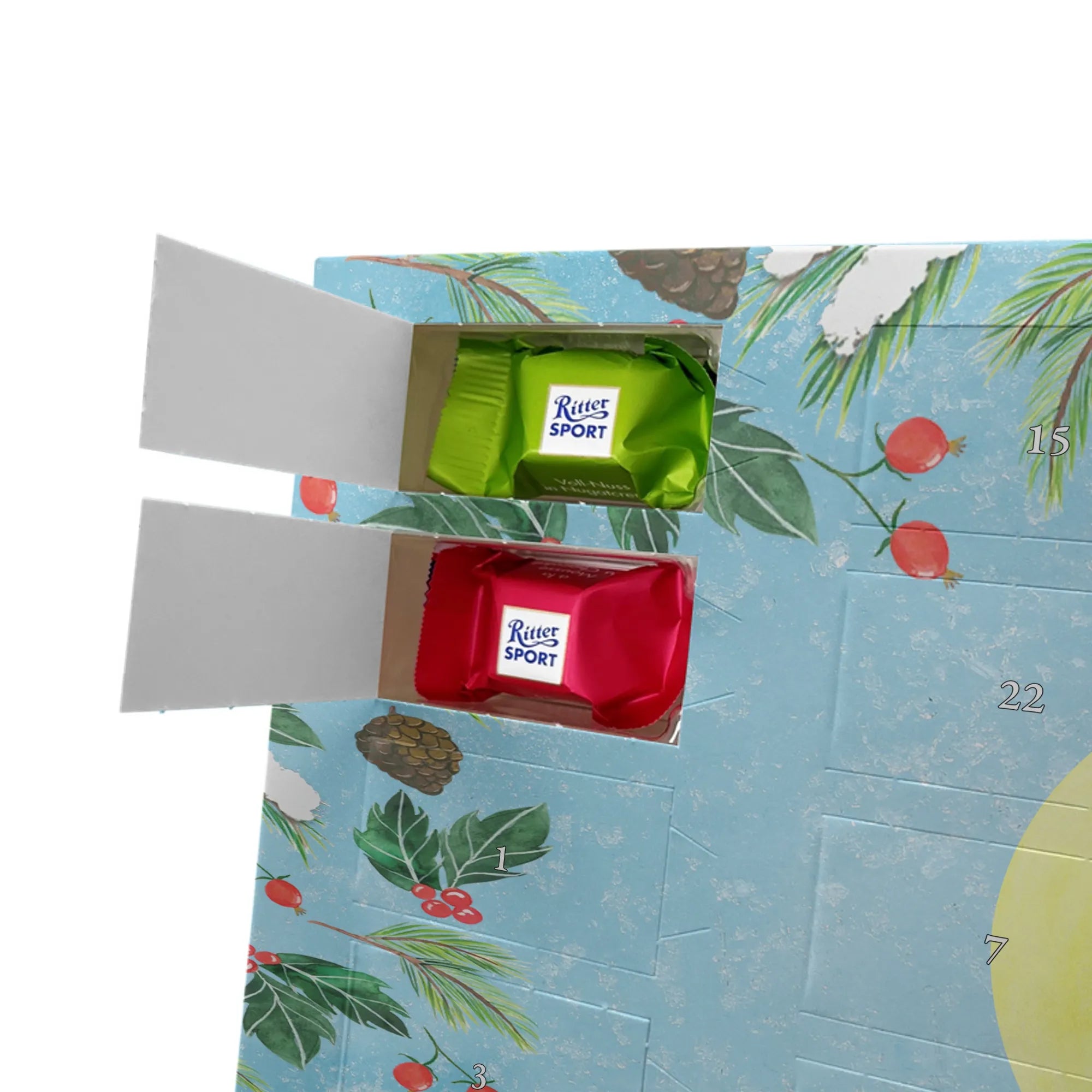 🐼 24 Türchen mit Ritter Sport Schokowürfeln in beliebten Sorten.