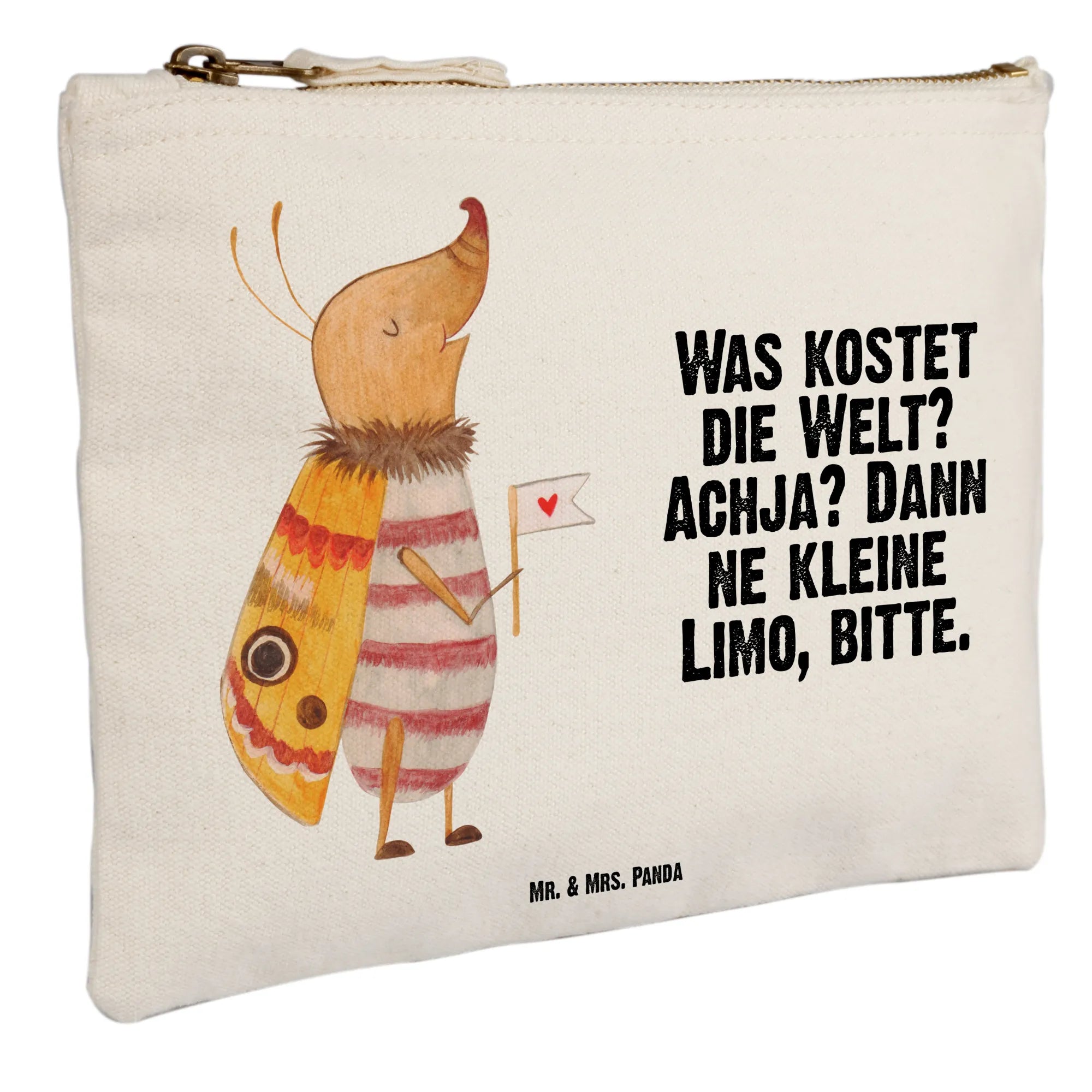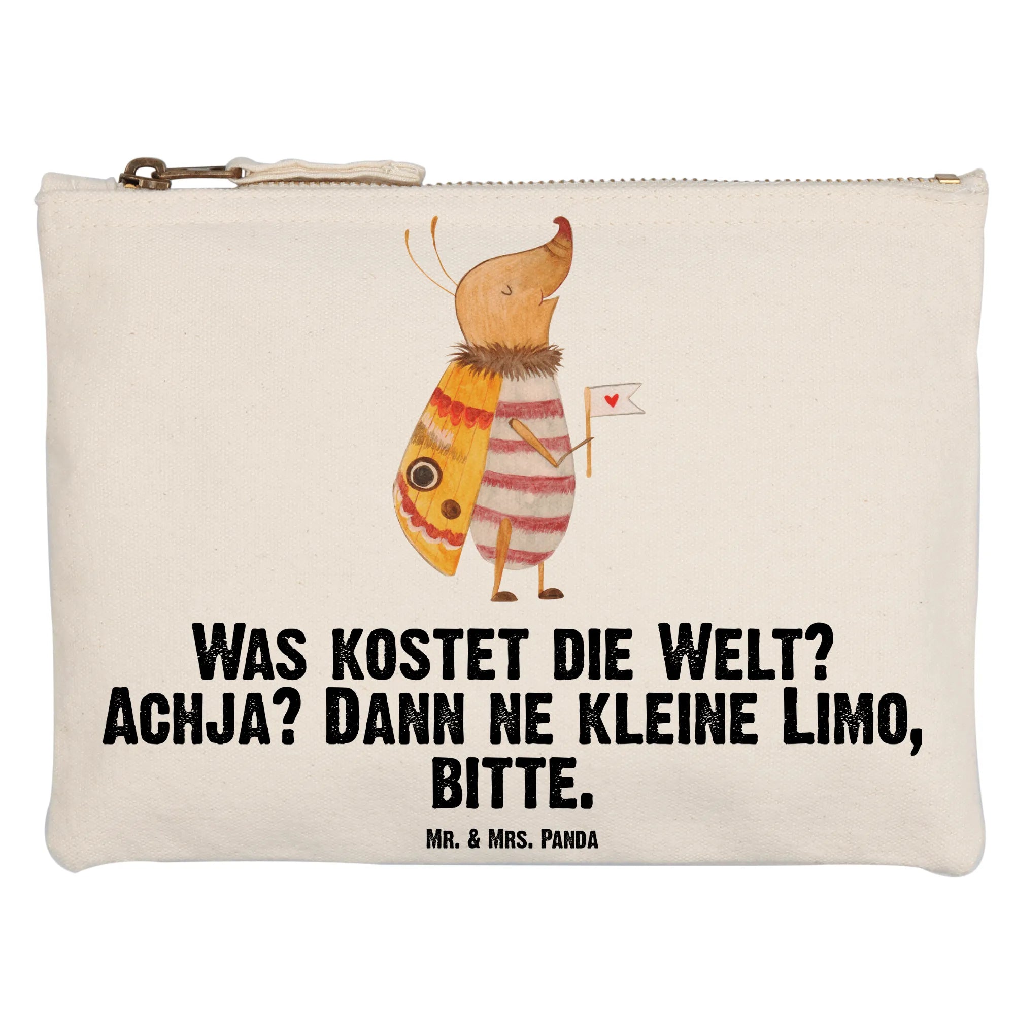 Komm mit auf Entdeckungsreise! Unsere Schminktasche „Nachtfalter mit Fähnchen“ aus der Small World-Kollektion von Mr. & Mrs. Panda vereint praktischen Alltagsschutz mit einem zauberhaften Design. Der winzige Nachtfalter hält sein Fähnchen mit Herz und trägt den frechen Spruch: „Was kostet die Welt? Achja? Dann ne kleine Limo, bitte.“ – eine niedliche Erinnerung daran, das Leben mit einem Augenzwinkern zu nehmen. 🦋