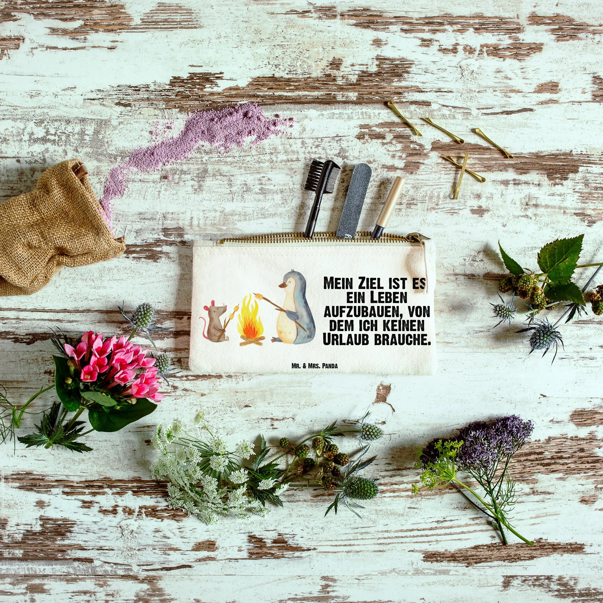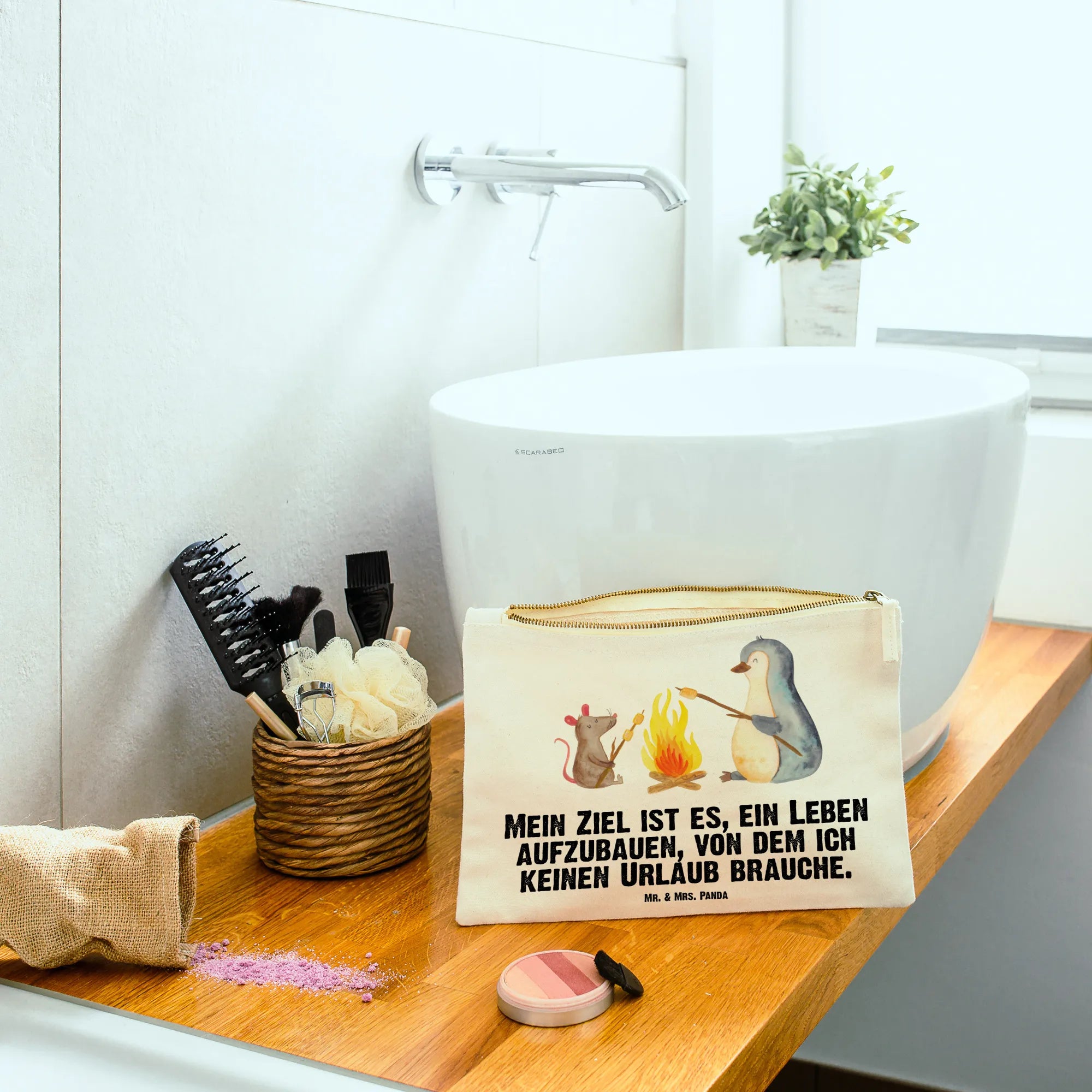 Entdecke die bezaubernde Schminktasche von Mr. & Mrs. Panda im einzigartigen Pinguin Lagerfeuer Design! Diese hochwertige Kosmetiktasche ist nicht nur ein praktisches Accessoire für all deine Makeup-Produkte, sondern auch ein wahrer Blickfang. Der niedliche Pinguin und die Maus, die fröhlich gemeinsam am Lagerfeuer sitzen und Marshmallows rösten, bringen Freude in deinen Alltag. Mit dem Spruch „Mein Ziel ist es, ein Leben aufzubauen, von dem ich keinen Urlaub brauche.“ wird diese Schminktasche zu einer wundervollen Motivationsquelle. Ob für dich selbst oder als Geschenk für Freunde, Kollegen oder deine Liebsten, sie eignet sich perfekt zu Anlässen wie Geburtstagen, Jubiläen oder einfach als kleine Aufmerksamkeit zwischendurch.