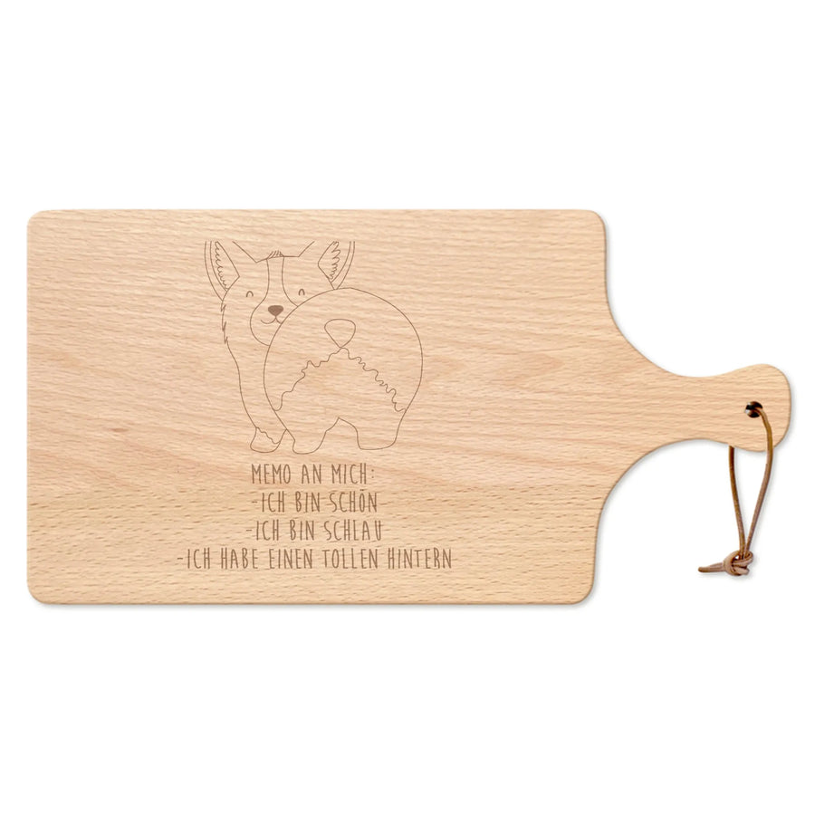 Die liebevoll gestaltete Lasergravur zeigt einen fröhlichen Corgi, der seinen Po in die Kamera hält - ein ideales Geschenk für jeden Hundeliebhaber! Das Schneidebrett kommt mit dem Slogan "Memo an mich: - ich bin schön - ich bin schlau - ich habe einen tollen Hintern" und bringt zum Schmunzeln.