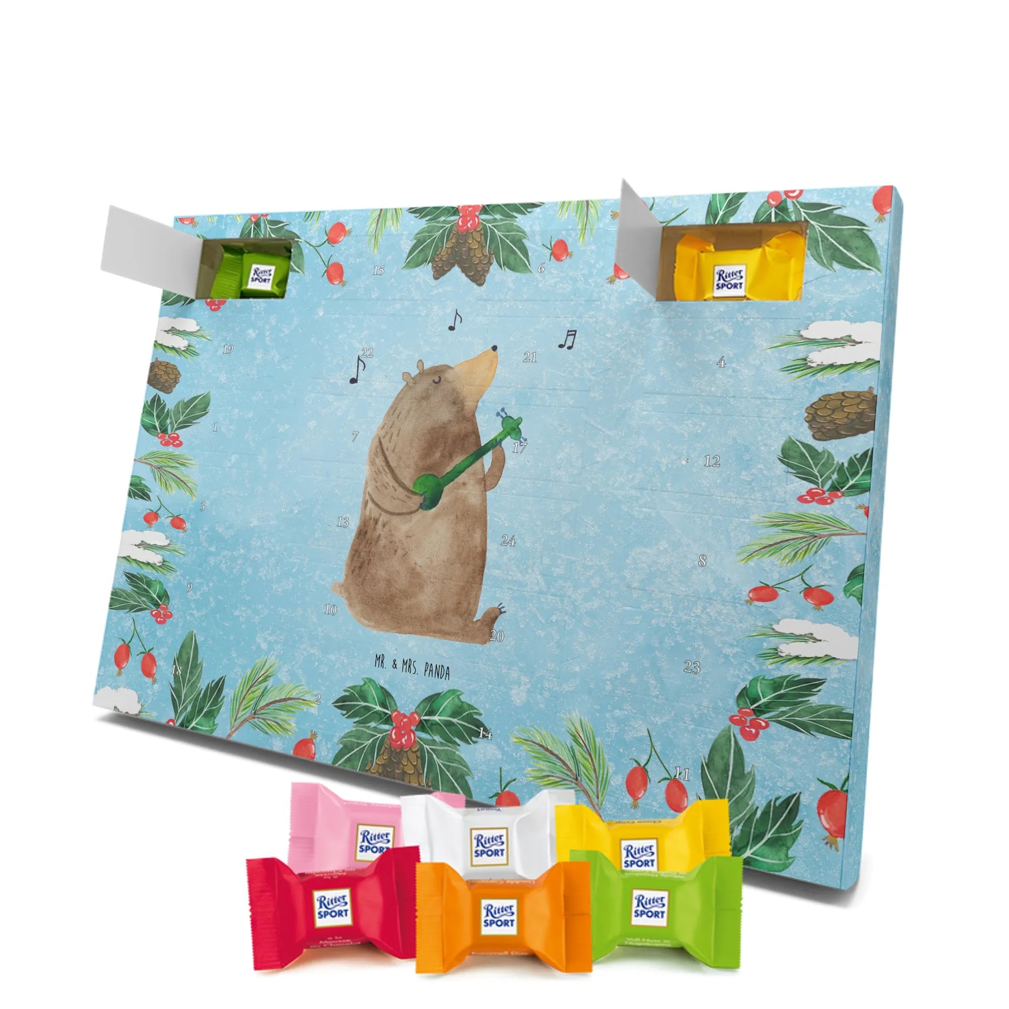 Unser entzückender Schokoladen Adventskalender von Mr. & Mrs. Panda ist das perfekte Highlight für die Adventszeit. Bedruckt mit wunderschönen Motiven & Sprüchen von Mr. & Mrs. Panda zaubert er dir ein Lächeln an jedem Tag im Dezember. Der Kalender ist nicht personalisierbar, überzeugt aber durch brillante Druckqualität mit seidenmatter Oberflächenveredelung und sorgsame bedruckte Seitenflächen. Die stabile Verarbeitung macht ihn zu einem dekorativen Hingucker. Maße: 325 mm x 225 mm x 27 mm. Besonders praktisch: Er kann aufgehängt oder aufgestellt werden, ganz nach deinem Geschmack und Platzangebot. Gefüllt ist der Adventskalender mit Ritter Sport Schokowürfeln – in verführerischen Sorten wie Mousse au Chocolat, Schoko Crisp, Voll-Nuss in Nougatcreme, Karamell Duo, Joghurt und Erdbeer-Joghurt. Wichtiger Hinweis: Es handelt sich um einen Kalender gefüllt mit Ritter Sport Schokolade, nicht um einen Kalender der Marke Ritter Sport. Schenk ihn Freunden, der Familie oder gönn dir selbst eine süße Vorfreude: kleine Schokoladenmomente, liebevoll verpackt von Mr. & Mrs. Panda.