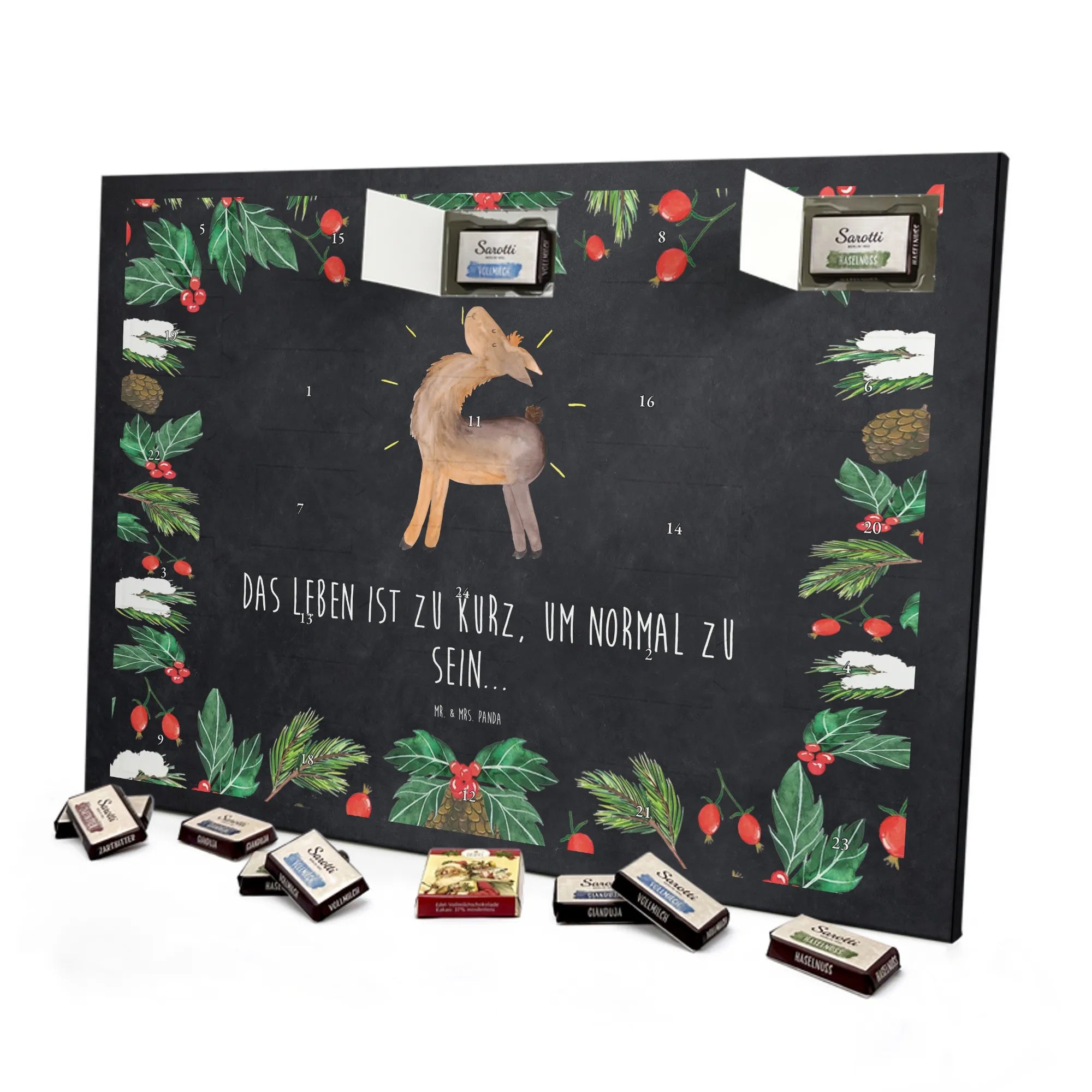 Wunderschöner Schokoladen-Adventskalender von Mr. & Mrs. Panda – süßes Design trifft hochwertige Verarbeitung. Unser Schokoladen-Adventskalender ist bedruckt mit wunderschönen Motiven & Sprüchen von Mr. & Mrs. Panda und nicht personalisierbar, dafür aber mit liebevollen Details gestaltet. Die brillante Druckqualität mit seidenmatter Oberflächenveredelung verleiht dem Kalender ein edles Finish, und auch die Seitenflächen sind bedruckt für einen rundum stimmigen Look. Maße: 233 mm x 178 mm x 24 mm. Die Konstruktion erlaubt sowohl das Aufstellen als auch das Aufhängen – Besonderheit: kann aufgehängt oder aufgestellt werden. Gefüllt mit MARKENNAMEN Schokolade und mit leckeren Schokoladenkugeln bestückt, ist jeder Dezembertag eine kleine Belohnung. Bitte lies die besonderen Hinweise: (Kann Spuren von Haselnüssen, Mandeln, Gluten und Soja enthalten!), kühl und trocken lagern. Ideal als Geschenk, Adventsdekoration oder süße Überraschung für Freunde und Familie. Mr. & Mrs. Panda wünscht dir eine gemütliche und genussvolle Adventszeit!