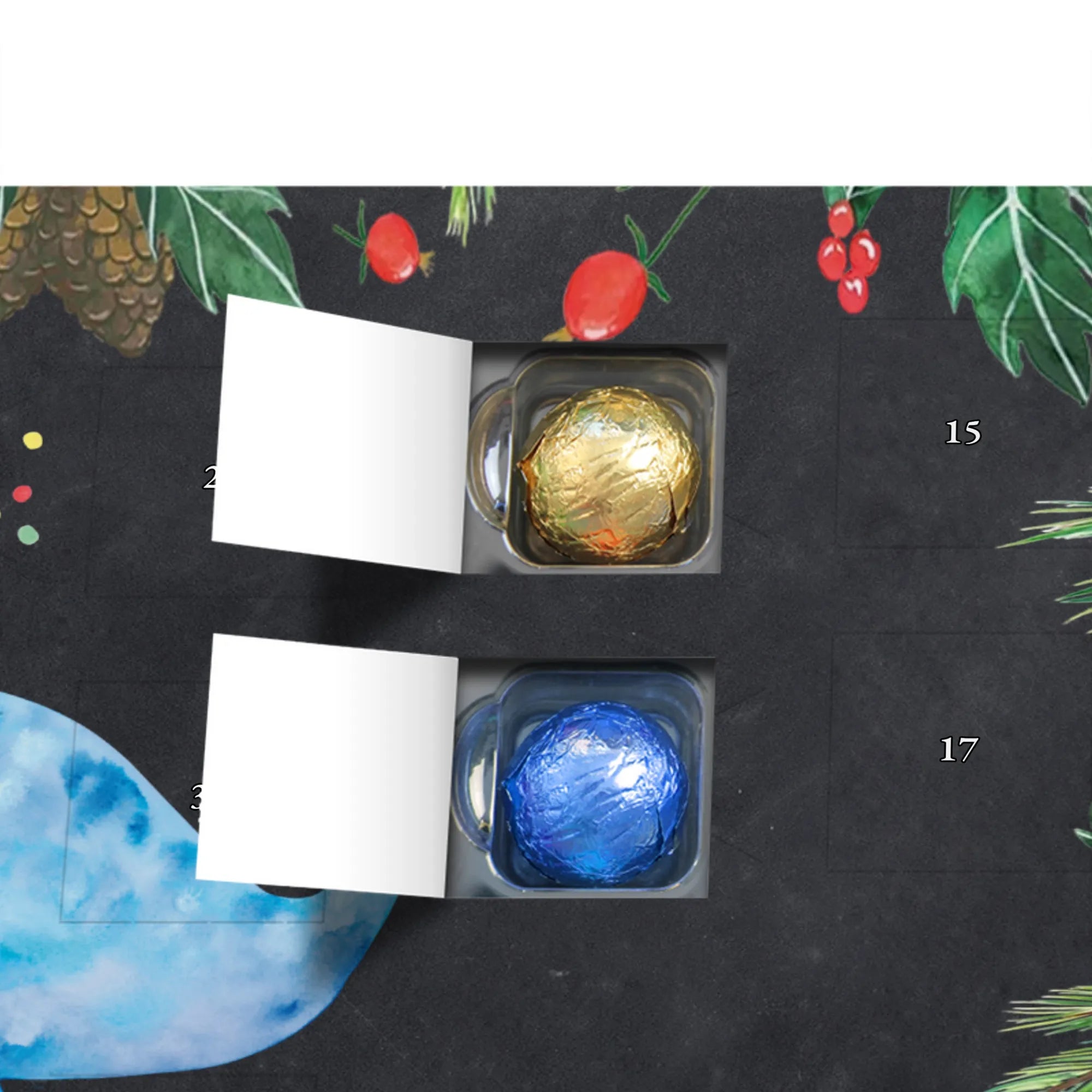 Wunderschöner Schokoladen-Adventskalender von Mr. & Mrs. Panda – süßes Design trifft hochwertige Verarbeitung. Unser Schokoladen-Adventskalender ist bedruckt mit wunderschönen Motiven & Sprüchen von Mr. & Mrs. Panda und nicht personalisierbar, dafür aber mit liebevollen Details gestaltet. Die brillante Druckqualität mit seidenmatter Oberflächenveredelung verleiht dem Kalender ein edles Finish, und auch die Seitenflächen sind bedruckt für einen rundum stimmigen Look. Maße: 233 mm x 178 mm x 24 mm. Die Konstruktion erlaubt sowohl das Aufstellen als auch das Aufhängen – Besonderheit: kann aufgehängt oder aufgestellt werden. Gefüllt mit MARKENNAMEN Schokolade und mit leckeren Schokoladenkugeln bestückt, ist jeder Dezembertag eine kleine Belohnung. Bitte lies die besonderen Hinweise: (Kann Spuren von Haselnüssen, Mandeln, Gluten und Soja enthalten!), kühl und trocken lagern. Ideal als Geschenk, Adventsdekoration oder süße Überraschung für Freunde und Familie. Mr. & Mrs. Panda wünscht dir eine gemütliche und genussvolle Adventszeit!
