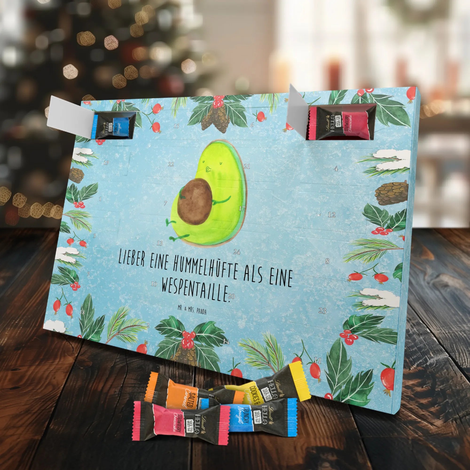 Entdecke den charmanten Schokoladen Adventskalender von Mr. & Mrs. Panda – ein kleines Kunstwerk für alle Schoko-Liebhaber. Der Schoko-Adventskalender ist mit liebevollen Illustrationen und kurzen Sprüchen bedruckt und verbreitet gemütliche Vorfreude auf Weihnachten. Er ist nicht personalisierbar, aber durch die brillante Druckqualität und die seidenmatte Oberflächenveredelung ein echtes Hingucker-Produkt. Auch die Seitenflächen sind bedruckt, was dem Kalender ein rundum schönes Erscheinungsbild verleiht. Maße: 325 mm x 225 mm x 27 mm. Das praktische Design erlaubt es, den Kalender aufzuhängen oder aufzustellen. Gefüllt mit Lindt Hello Schokolade: 24 einzeln verpackte Mini Sticks in vier leckeren Sorten – Karamell-Schokoladenkuchen, Kekse, Knuspriger Nougat und Erdbeer-Cheesecake. Zutaten sind u. a. Zucker, Kakaobutter, Vollmilchpulver, Haselnüsse und weitere Zutaten; Allergene: Milcheiweiß, Milchzucker, Soja, Weizen, Haselnüsse; kann Spuren von Mandeln und anderen Schalenfrüchten enthalten. Ideal als Geschenk oder zum Selbernaschen – einfach jeden Tag ein Türchen öffnen und genießen.