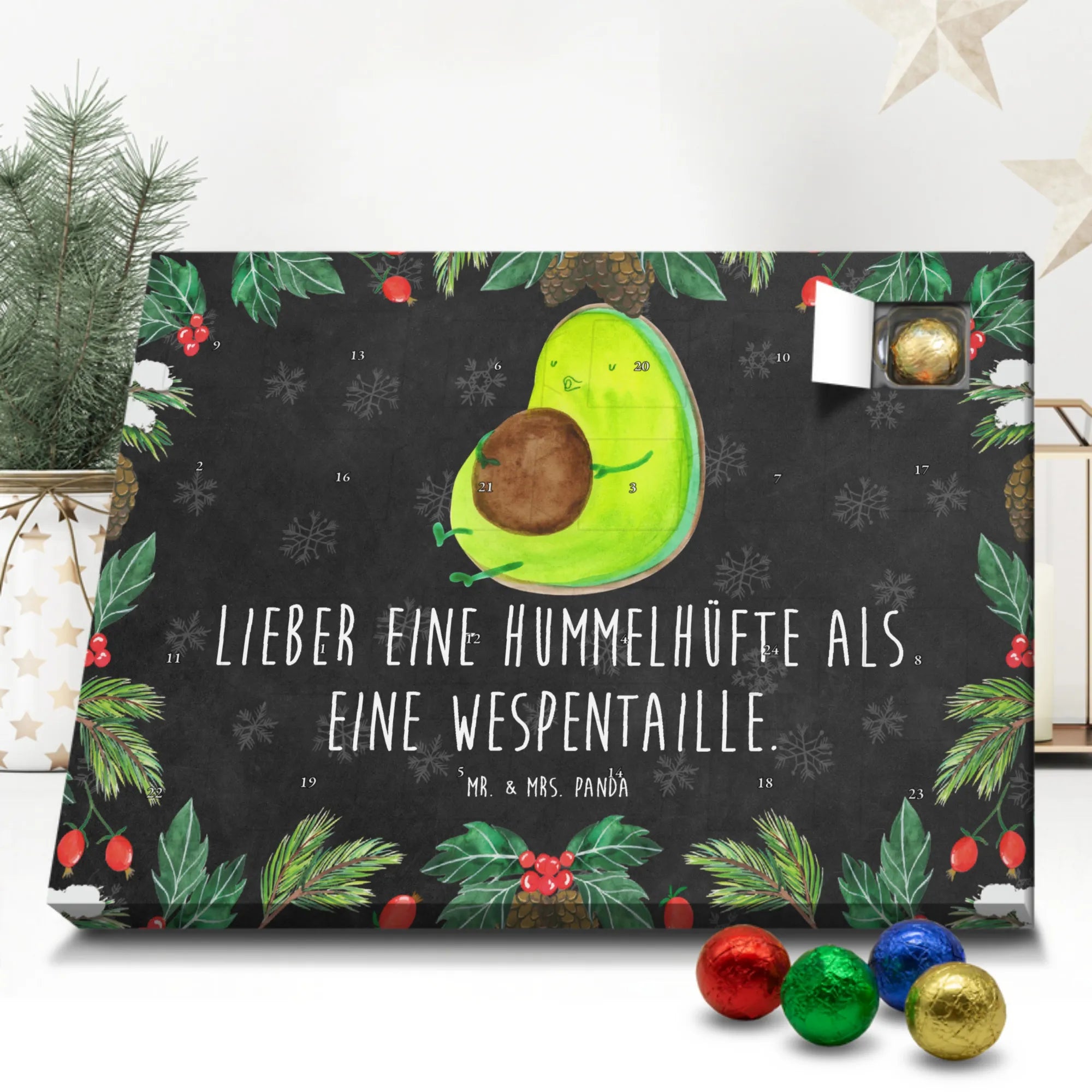 Wunderschöner Schokoladen Adventskalender von Mr. & Mrs. Panda – ein kleines Kunstwerk für deine Adventszeit. Dieser Schokoladen Adventskalender ist mit liebevollen Illustrationen und positiven Sprüchen bedruckt und macht jeden Morgen im Dezember zu einem kleinen Freudenmoment. Der Kalender ist nicht personalisierbar, aber durch die hochwertigen Motive ein persönlicher Ausdruck von Gemütlichkeit. Er überzeugt durch brillante Druckqualität mit seidenmatter Oberflächenveredelung und bedruckte Seitenflächen für einen rundum schönen Look. Maße: 233 mm x 178 mm x 24 mm und das praktische Design erlaubt das Aufhängen oder Aufstellen – Besonderheit: kann aufgehängt oder aufgestellt werden. Gefüllt mit MARKENNAMEN Schokolade und gefüllt mit leckeren Schokoladenkugeln, sorgt er für süße Augenblicke. Bitte achte auf die besonderen Hinweise: (Kann Spuren von Haselnüssen, Mandeln, Gluten und Soja enthalten!), kühl und trocken lagern. Egal ob als Geschenk für Freunde, Familie oder als hübsche Deko für dein Zuhause – dieser Adventskalender bringt Vorfreude und süßen Genuss in den Dezember. Mr. & Mrs. Panda grüßen dich herzlich und wünschen eine zauberhafte Adventszeit!