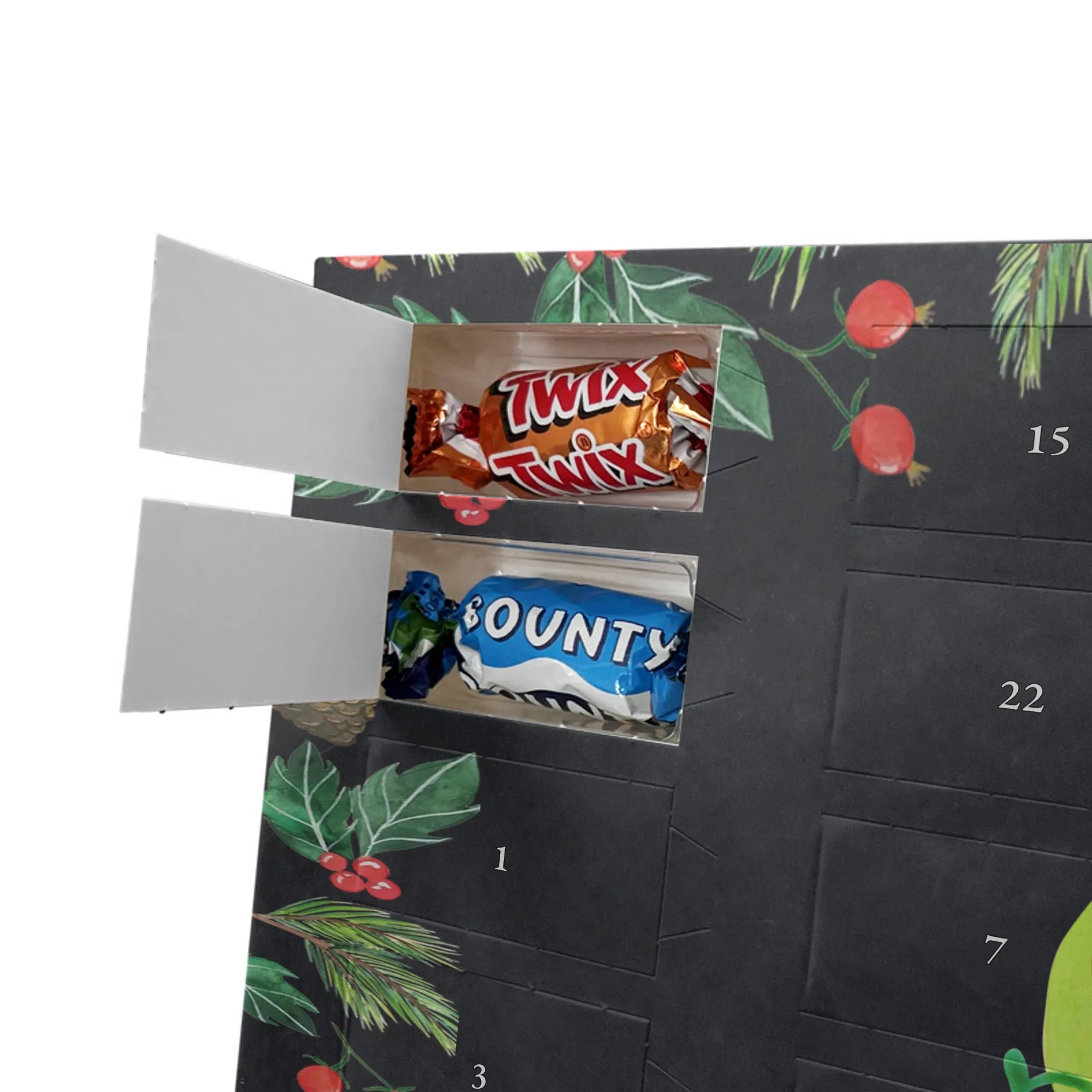 Unser Celebrations Adventskalender von Mr. & Mrs. Panda ist die süße Art, die Tage bis Weihnachten zu zählen. Liebevoll gestaltete Motive und herzliche Sprüche machen jeden Öffnungsmoment besonders. Die brillante Druckqualität zusammen mit einer seidenmatten Oberflächenveredelung sorgt für strahlende Farben und eine angenehme Haptik; auch die Seitenflächen sind bedruckt, damit alles rundum hübsch aussieht. Der Kalender ist nicht personalisierbar. Innen erwarten dich 24 hochwertige Celebrations-Füllungen in acht verschiedenen Sorten: Maltesers, Mars, Snickers, Twix, Milky Way, Bounty, Galaxy und Galaxy Caramel — abwechslungsreicher Genuss für jeden Tag. Als Extra kannst du den Kalender entweder einfach hinstellen oder an die Wand hängen. Maße: 325 mm x 225 mm x 27 mm. Ein ideales Geschenk für alle, die Freude an schönen Details und kleinen Süßigkeiten haben.