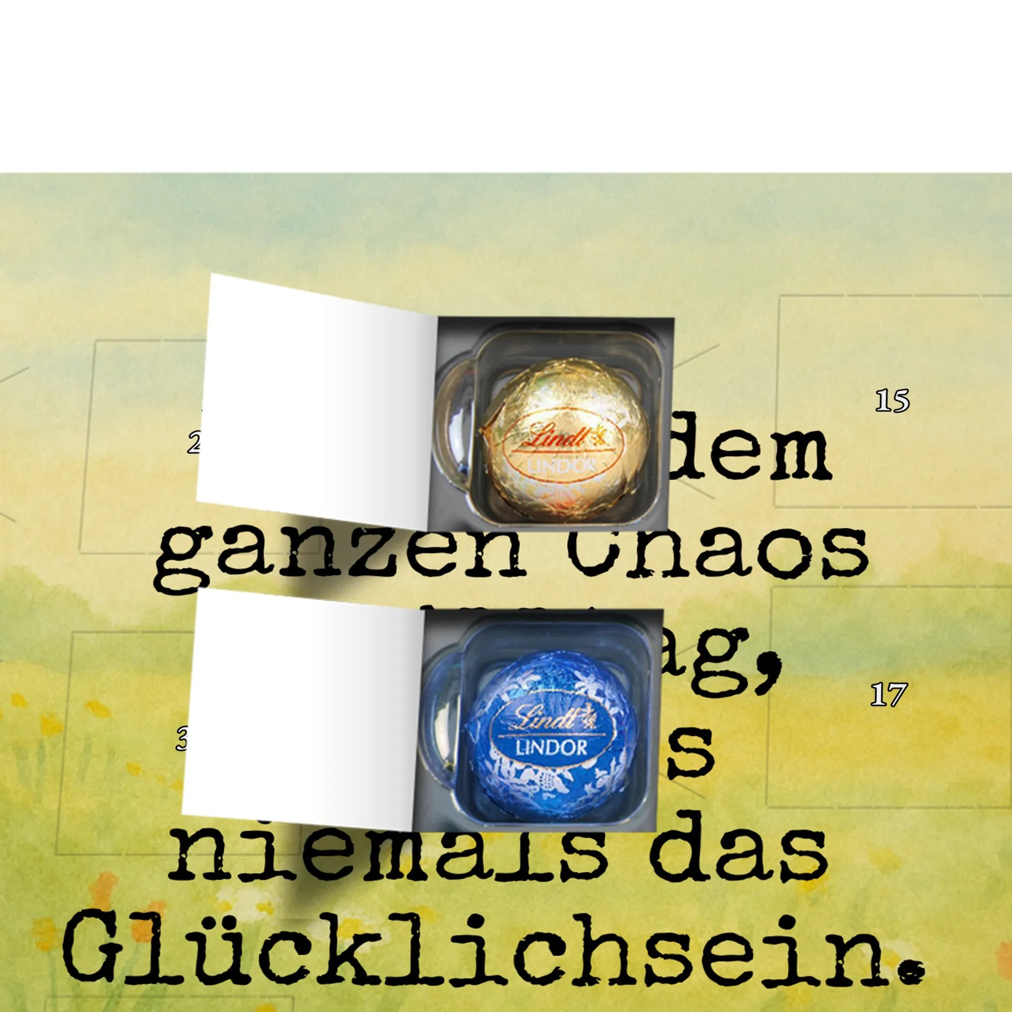 Der Adventskalender mit Schokolade von Mr. & Mrs. Panda ist ein echter Blickfang und eine köstliche Überraschung für die Vorweihnachtszeit. Er ist bedruckt mit wunderschönen Motiven & Sprüchen von Mr. & Mrs. Panda und nicht personalisierbar – deshalb perfekt als unkompliziertes Geschenk. Die brillante Druckqualität und die seidenmatte Oberflächenveredelung sorgen für eine hochwertige Optik, ergänzt durch bedruckte Seitenflächen. Maße: 233 mm x 178 mm x 24 mm. Besonderheit: kann aufgehängt oder aufgestellt werden, ganz wie es dir gefällt. Gefüllt mit Lindt Lindor: 24 einzeln verpackte Markenschokoladen Kugeln in den Sorten Vollmilch, Feinherb und Weiße Schokolade bieten täglich neue Geschmackserlebnisse. Zutaten: Zucker, pflanzliches Fett (Kokosnuss, Palmkern), Kakaobutter, Vollmilchpulver, Kakaomasse, Milchzucker, Magermilchpulver, Butterreinfett, Emulgator (Sojalecithin), Gerstenmalzextrakt, Aromen. Besondere Hinweise: Kann Haselnüsse und Mandeln enthalten. Ob als Mitbringsel, Geschenk oder zum Selbstverwöhnen – dieser Adventskalender vereint schönes Design mit zarter Markenschokolade.