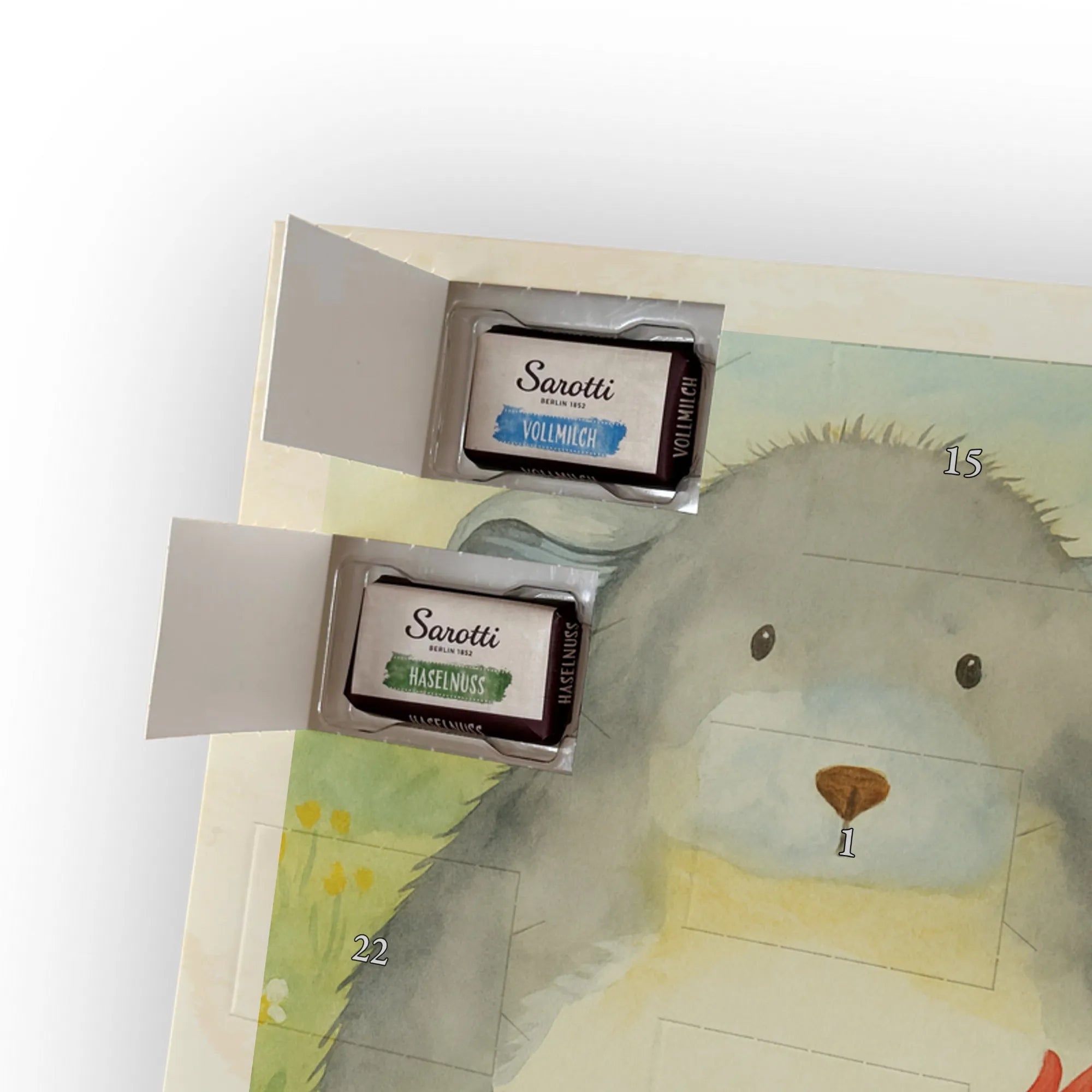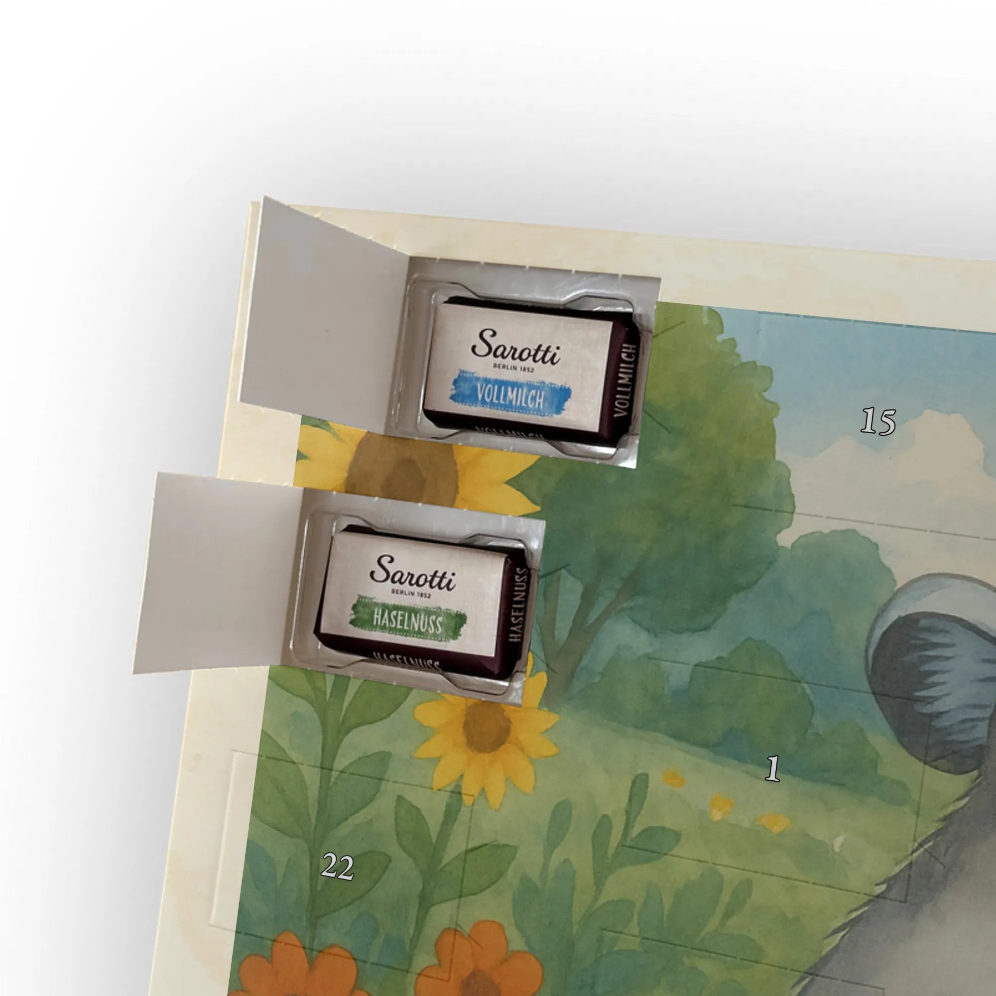 🐼 SCHOKOLADEN-ADVENTSKALENDER: Edler, seidenmatter Druck mit liebevollen Illustrationen.