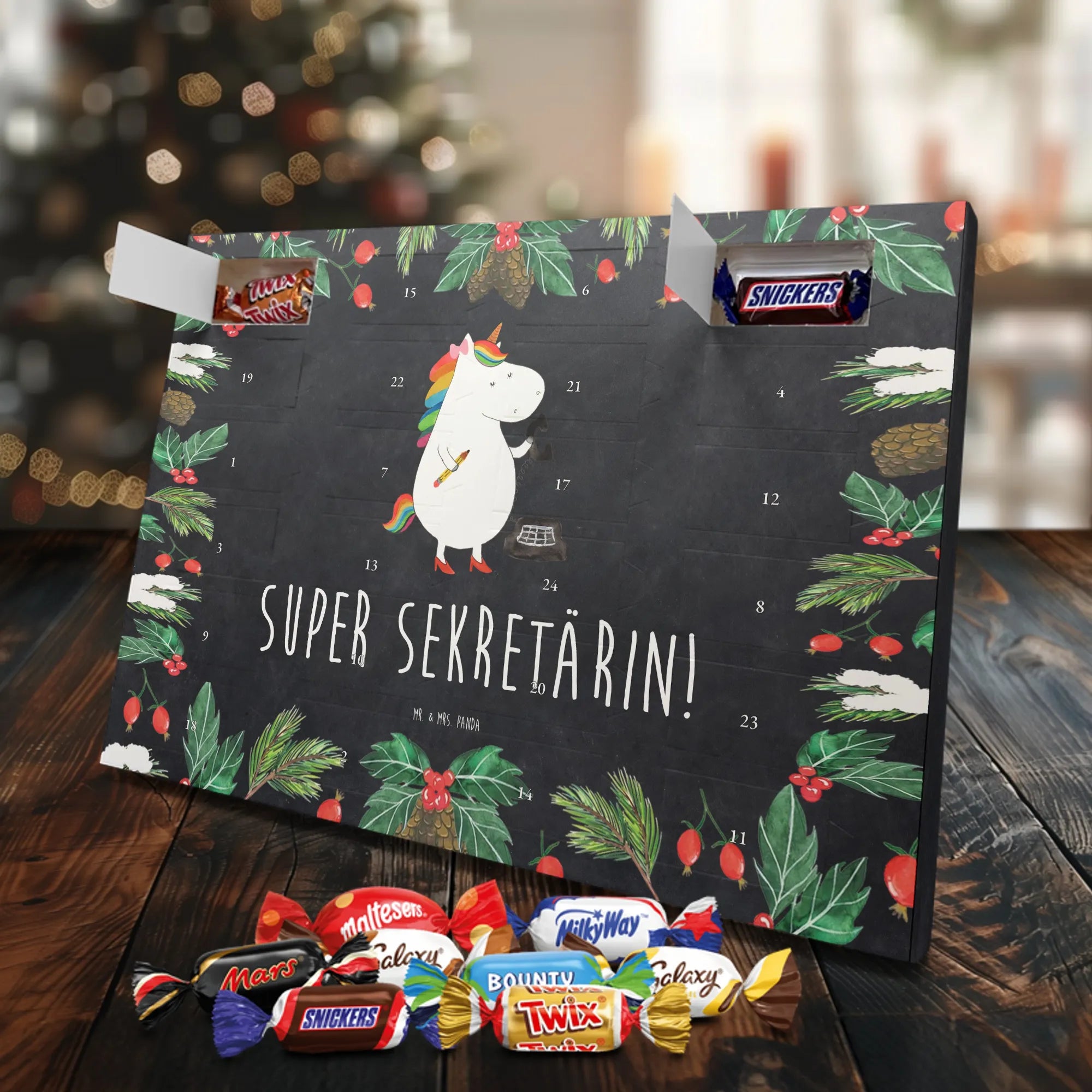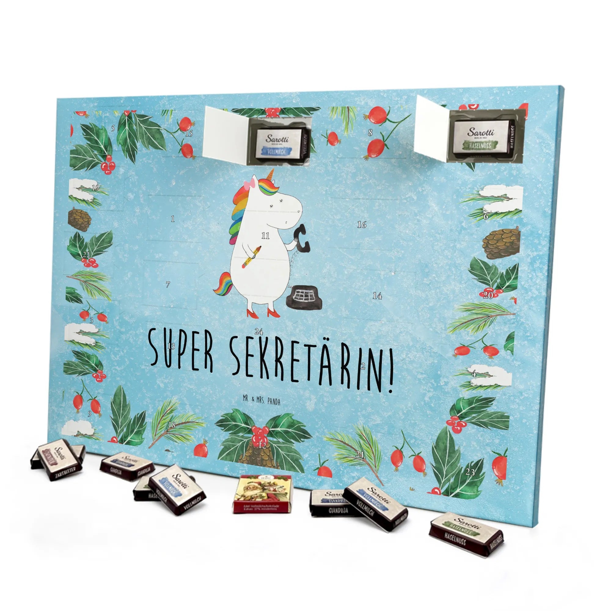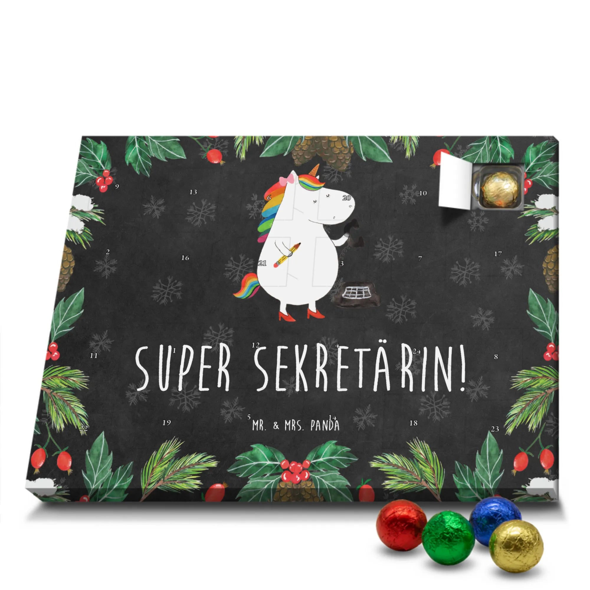 Suchst du ein Geschenk, das Herzlichkeit, Humor und süßen Genuss vereint? Unser Schokoladen Adventskalender aus der Einhorn - Kollektion von Mr. & Mrs. Panda ist genau das! Das liebevoll handgezeichnete Einhorn trägt die stolze Aufschrift „Super Sekretärin!“ – perfekt für Sekretärinnen, Assistentinnen, Rechtsanwaltsgehilfinnen und alle, die im Büro Großartiges leisten. 🎁🦄