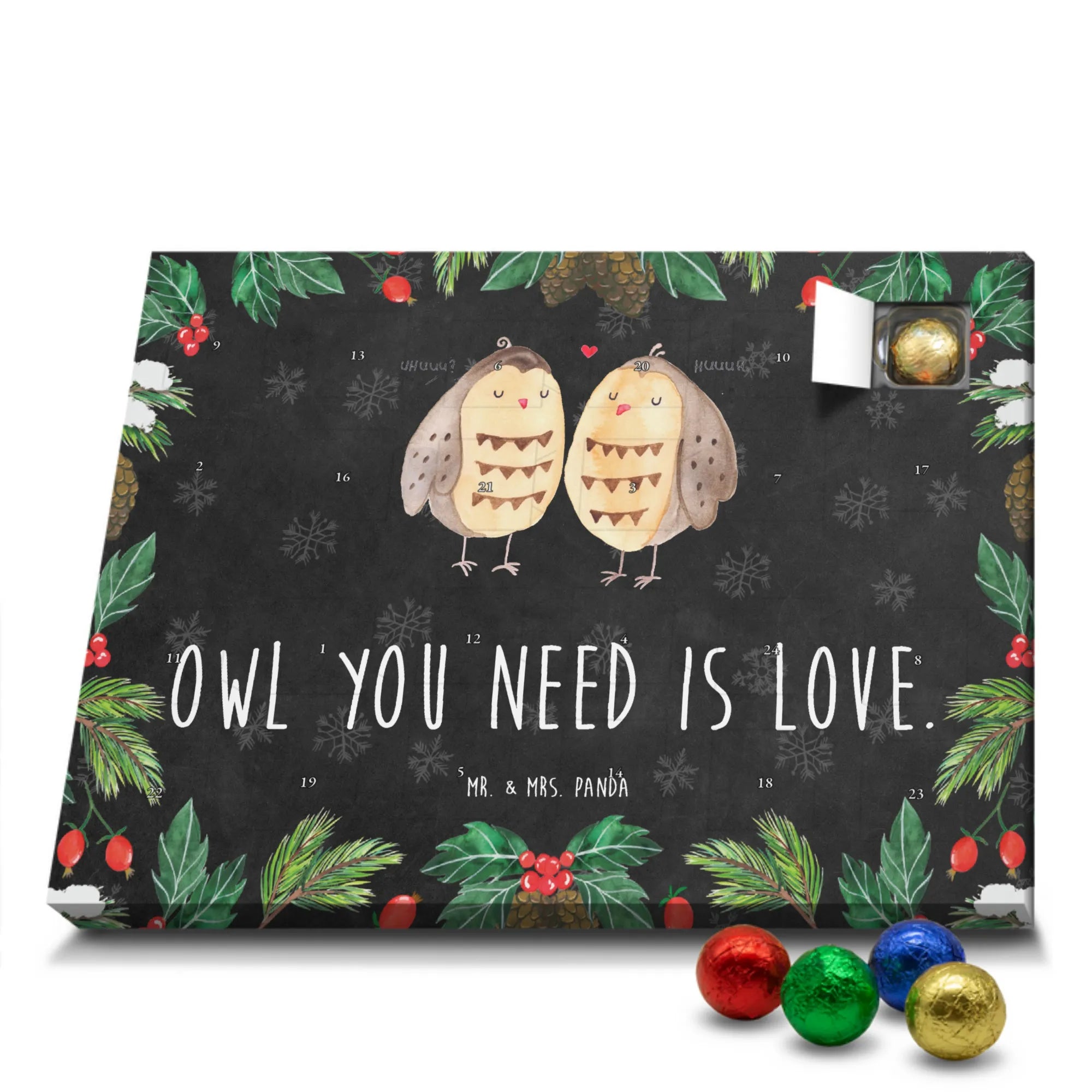 Wunderschöner Adventskalender mit Schokolade von Mr. & Mrs. Panda – für alle, die Advent und Design lieben. Dieser Adventskalender mit Schokolade ist liebevoll bedruckt mit wunderschönen Motiven & Sprüchen von Mr. & Mrs. Panda und ist nicht personalisierbar, aber mit viel Liebe zum Detail gefertigt. Brillante Druckqualität mit seidenmatter Oberflächenveredelung sorgt für einen edlen Look, und die bedruckten Seitenflächen geben dem Kalender eine besondere Optik. Maße: 233 mm x 178 mm x 24 mm. Dank seiner stabilen Verarbeitung kannst du ihn aufstellen oder ganz einfach aufhängen – Besonderheit: kann aufgehängt oder aufgestellt werden. Gefüllt mit MARKENNAMEN Schokolade und leckeren Schokoladenkugeln, bringt er jeden Tag ein kleines Glückserlebnis. Wichtige Hinweise: (Kann Spuren von Haselnüssen, Mandeln, Gluten und Soja enthalten!), bitte kühl und trocken lagern. Ob als Geschenk, Mitbringsel oder Adventsdeko – dieser Kalender zaubert ein Lächeln und sorgt für gemütliche Vorfreude. Viel Freude beim Entdecken der süßen Überraschungen wünscht dir Mr. & Mrs. Panda!