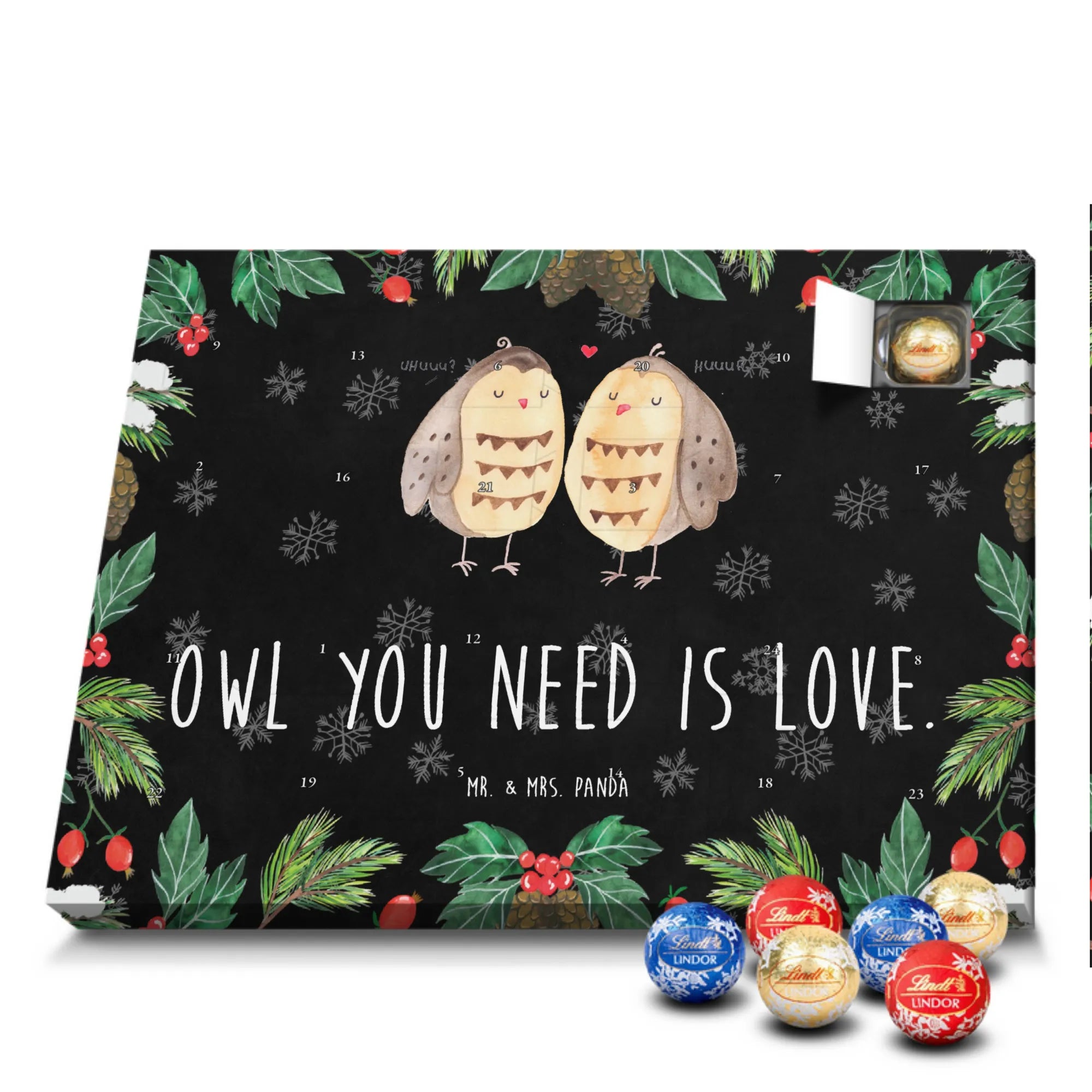 Unser zauberhafter Schoko Adventskalender von Mr. & Mrs. Panda bringt dir die süßeste Vorfreude auf Weihnachten! Dieser liebevoll gestaltete Adventskalender ist bedruckt mit wunderschönen Motiven & Sprüchen von Mr. & Mrs. Panda und ist nicht personalisierbar – dafür aber ein perfektes Geschenk für Freunde und Familie. Brillante Druckqualität mit seidenmatter Oberflächenveredelung sorgt für ein edles Finish, und die bedruckten Seitenflächen machen den Kalender von allen Seiten zu einem Hingucker. Maße: 233 mm x 178 mm x 24 mm. Besonderheit: kann aufgehängt oder aufgestellt werden, je nachdem, wie du ihn präsentieren möchtest. Gefüllt mit Lindt Lindor: 24 einzeln verpackte Markenschokoladen Kugeln in drei verschiedenen Sorten – Vollmilch, Feinherb und Weiße Schokolade – sorgen für abwechslungsreichen Genuss in der Adventszeit. Zutaten: Zucker, pflanzliches Fett (Kokosnuss, Palmkern), Kakaobutter, Vollmilchpulver, Kakaomasse, Milchzucker, Magermilchpulver, Butterreinfett, Emulgator (Sojalecithin), Gerstenmalzextrakt, Aromen. Besondere Hinweise: Kann Haselnüsse und Mandeln enthalten. Unser Schoko Adventskalender verbindet niedliches Design mit hochwertiger Füllung – ideal zum Verschenken oder selbst Naschen. Mr. & Mrs. Panda wünschen dir eine fröhliche und leckere Adventszeit!