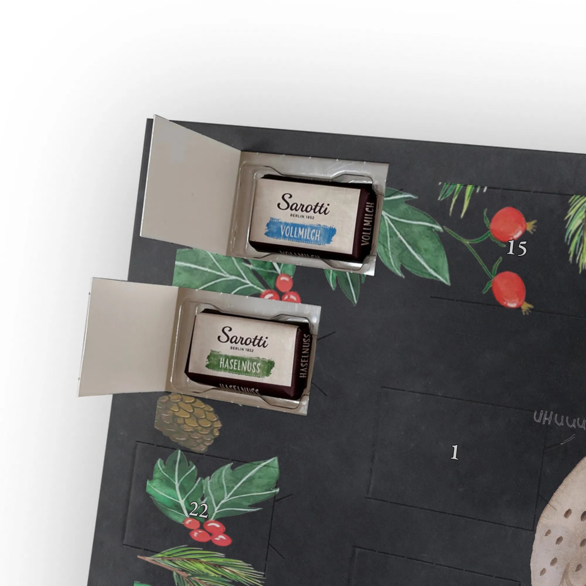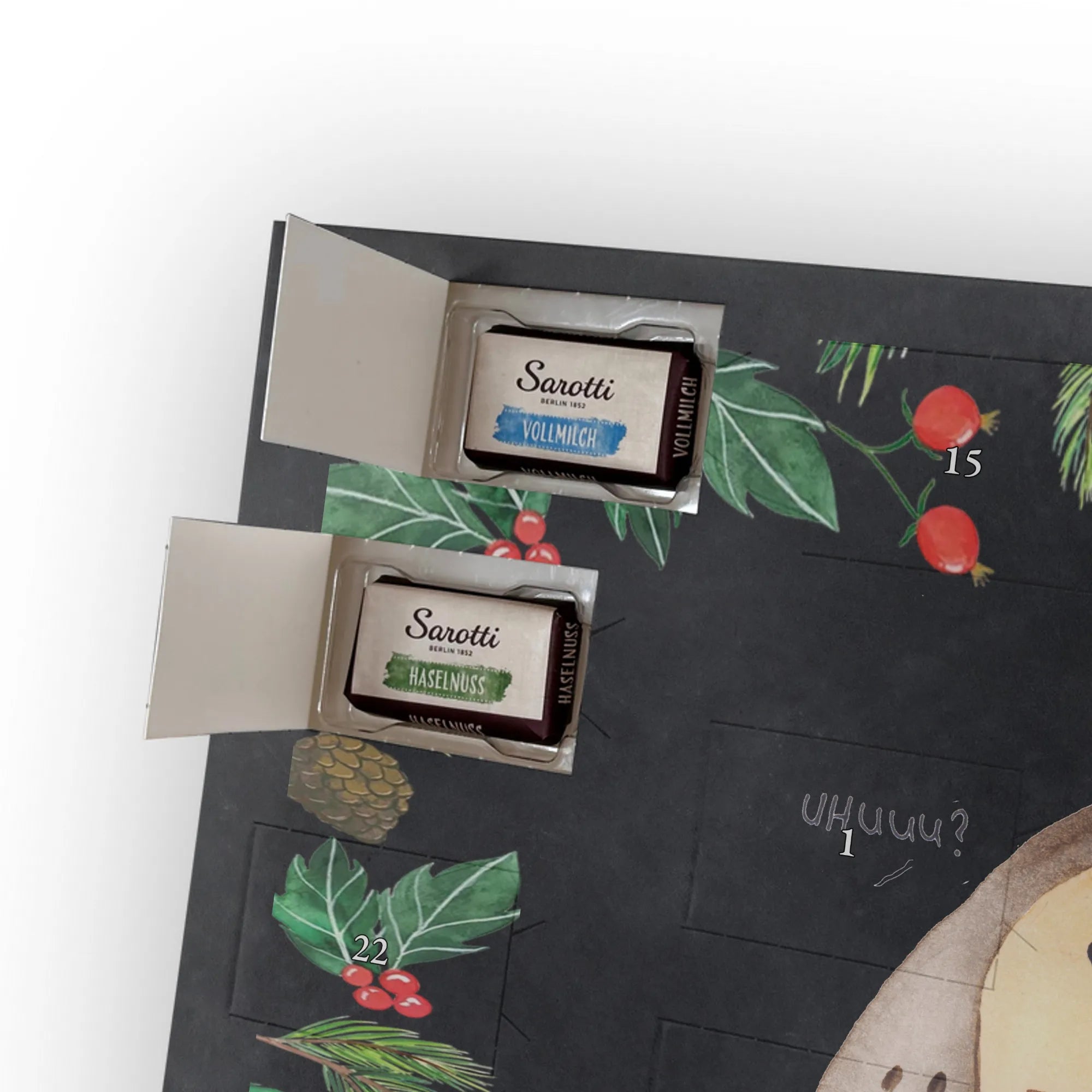 🐼 SCHOKOLADEN-ADVENTSKALENDER: Edler, seidenmatter Druck mit liebevollen Illustrationen.
