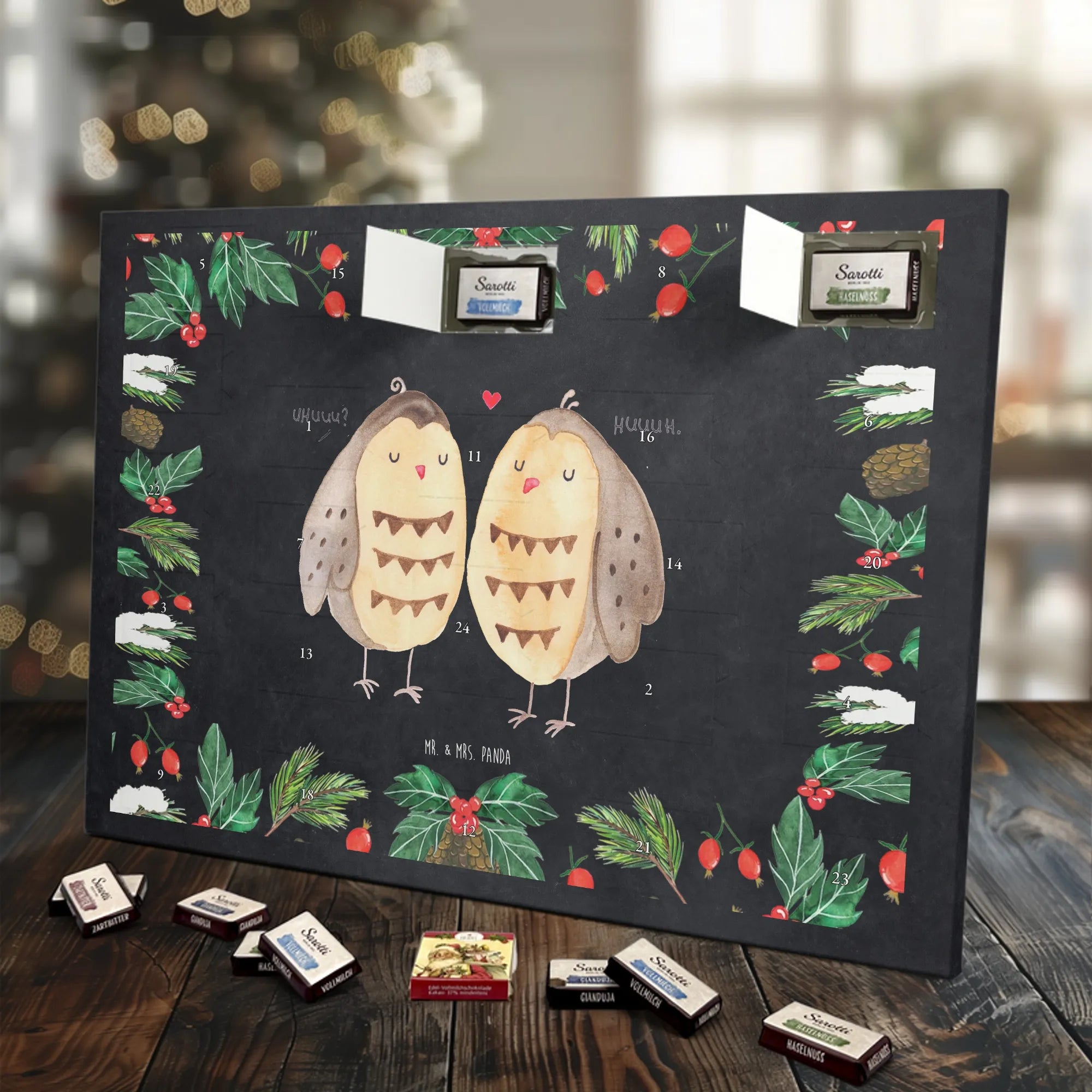 Adventskalender mit Schokolade – so schmeckt Vorfreude! Unser Mr. & Mrs. Panda Adventskalender ist liebevoll gestaltet und bedruckt mit wunderschönen Motiven & Sprüchen, die jeden Tag versüßen. Die brillante Druckqualität mit seidenmatter Oberflächenveredelung sorgt für ein edles Finish, und auch die Seitenflächen sind hübsch bedruckt. Der Kalender ist nicht personalisierbar, dafür aber vielseitig einsetzbar: Maße: 325 mm x 225 mm x 27 mm und die besondere Eigenschaft, dass du ihn aufgehängt oder aufgestellt verwenden kannst, geben dir Flexibilität bei der Dekoration. Gefüllt ist der Kalender mit Ritter Sport Schokowürfeln in beliebten Geschmacksrichtungen wie Mousse au Chocolat, Schoko Crisp, Voll-Nuss in Nougatcreme, Karamell Duo, Joghurt und Erdbeer-Joghurt. Wichtig: Es handelt sich um einen Kalender gefüllt mit Ritter Sport Schokolade, nicht um einen Kalender der Marke Ritter Sport. Ideal als Geschenk oder als Adventsdeko für dein Zuhause – kleine Schokofreuden warten hinter jedem Türchen.