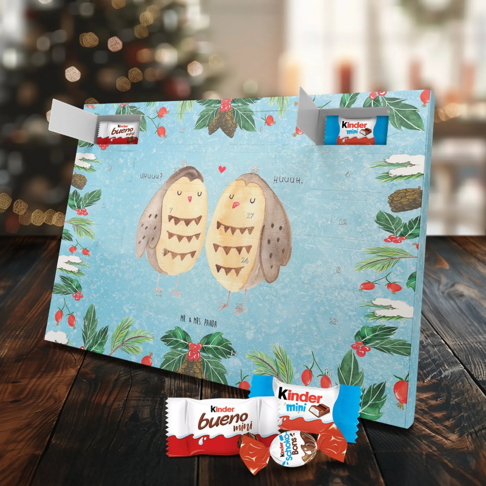Adventskalender mit Schokolade – liebevoll gestaltet von Mr. & Mrs. Panda. Dieser niedliche Kalender ist bedruckt mit wunderschönen Motiven & Sprüchen von Mr. & Mrs. Panda und trotzdem nicht personalisierbar. Du bekommst brillante Druckqualität mit seidenmatter Oberflächenveredelung sowie bedruckte Seitenflächen, die dem Kalender ein hochwertiges Finish verleihen. Maße: 355 mm x 245 mm x 11 mm. Ein tolles Extra: kann aufgehängt oder aufgestellt werden, sodass du ihn flexibel platzieren kannst. Gefüllt mit Markenname Schokolade: Adventskalender gefüllt mit kinder® Schokolade. Inhalt: kinder® Schoko-Bons, kinder® Bueno mini und kinder® Schokolade mini. Die 24 Türchen sind liebevoll befüllt und sorgen jeden Tag für ein Lächeln – ideal für Kinder, Paare oder als kleines Geschenk für Freunde. Robust und dekorativ zugleich, bringt dieser Adventskalender süße Vorfreude in dein Zuhause. Verschenke oder genieße eine adventliche Zeit voller kleiner, schokoladiger Überraschungen!