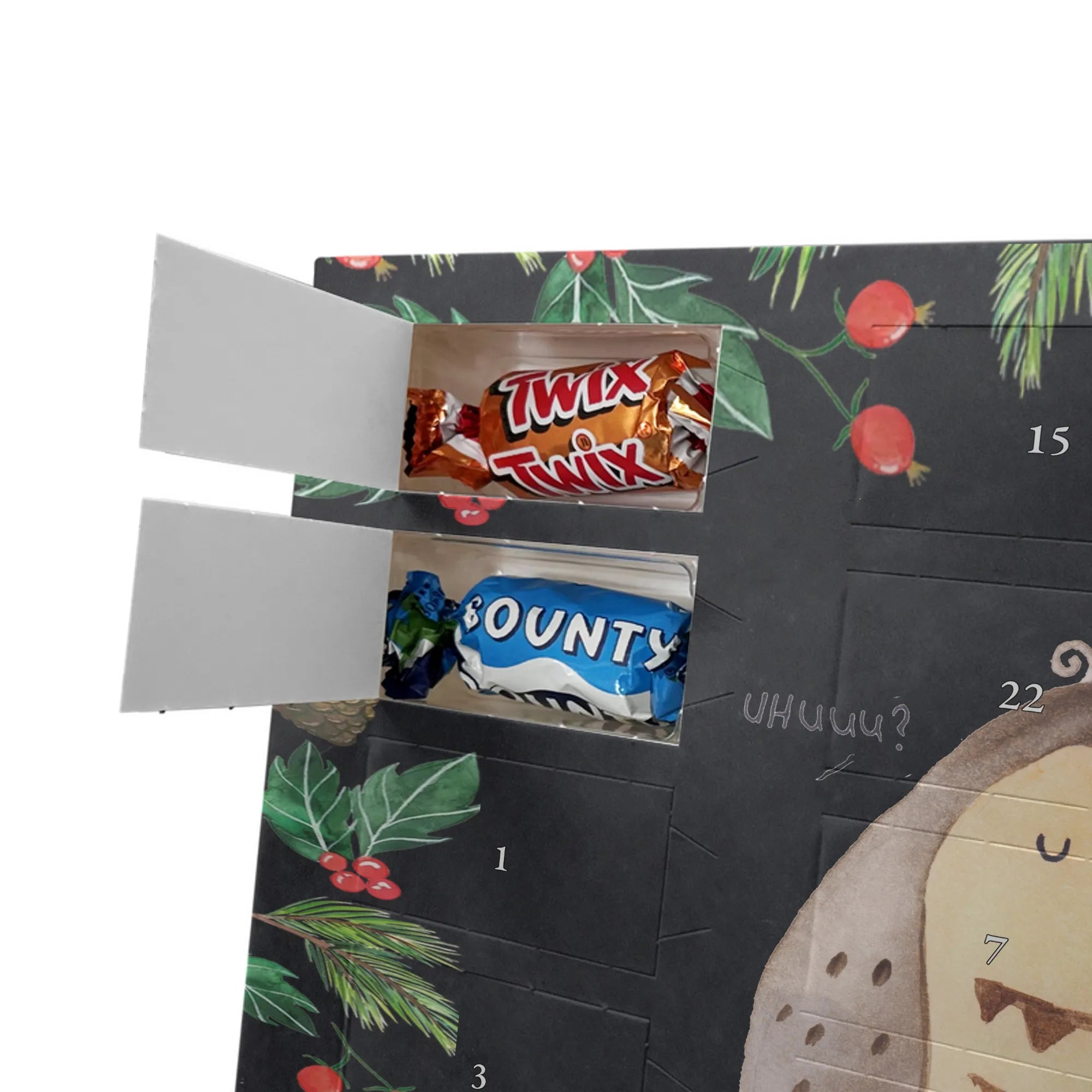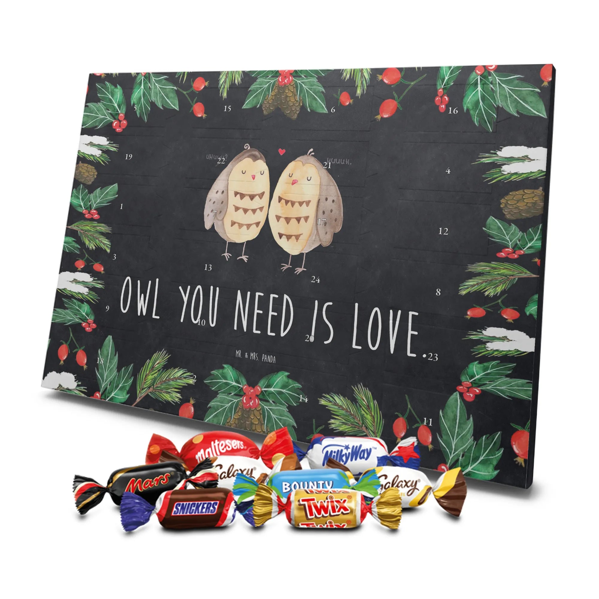 Unser Adventskalender mit Schokolade von Mr. & Mrs. Panda ist ein liebevoll gestaltetes Highlight für die Adventszeit. Die süßen Illustrationen und charmanten Sprüche sorgen für gute Stimmung bei Groß und Klein. Gedruckt in brillanter Qualität mit seidenmatter Oberflächenveredelung, wirken die Farben kräftig und edel; auch die Seitenflächen sind dekorativ bedruckt. Bitte beachten: Der Kalender ist nicht personalisierbar. Gefüllt ist er mit 24 Celebrations-Überraschungen in acht verschiedenen Sorten: Maltesers, Mars, Snickers, Twix, Milky Way, Bounty, Galaxy und Galaxy Caramel — perfekte Abwechslung für jeden Tag. Besonderheit: Du kannst den Kalender sowohl aufstellen als auch aufhängen. Maße: 325 mm x 225 mm x 27 mm. Schenke Vorfreude und kleine Genussmomente – ideal als Geschenk oder für deine eigene Adventszeit.