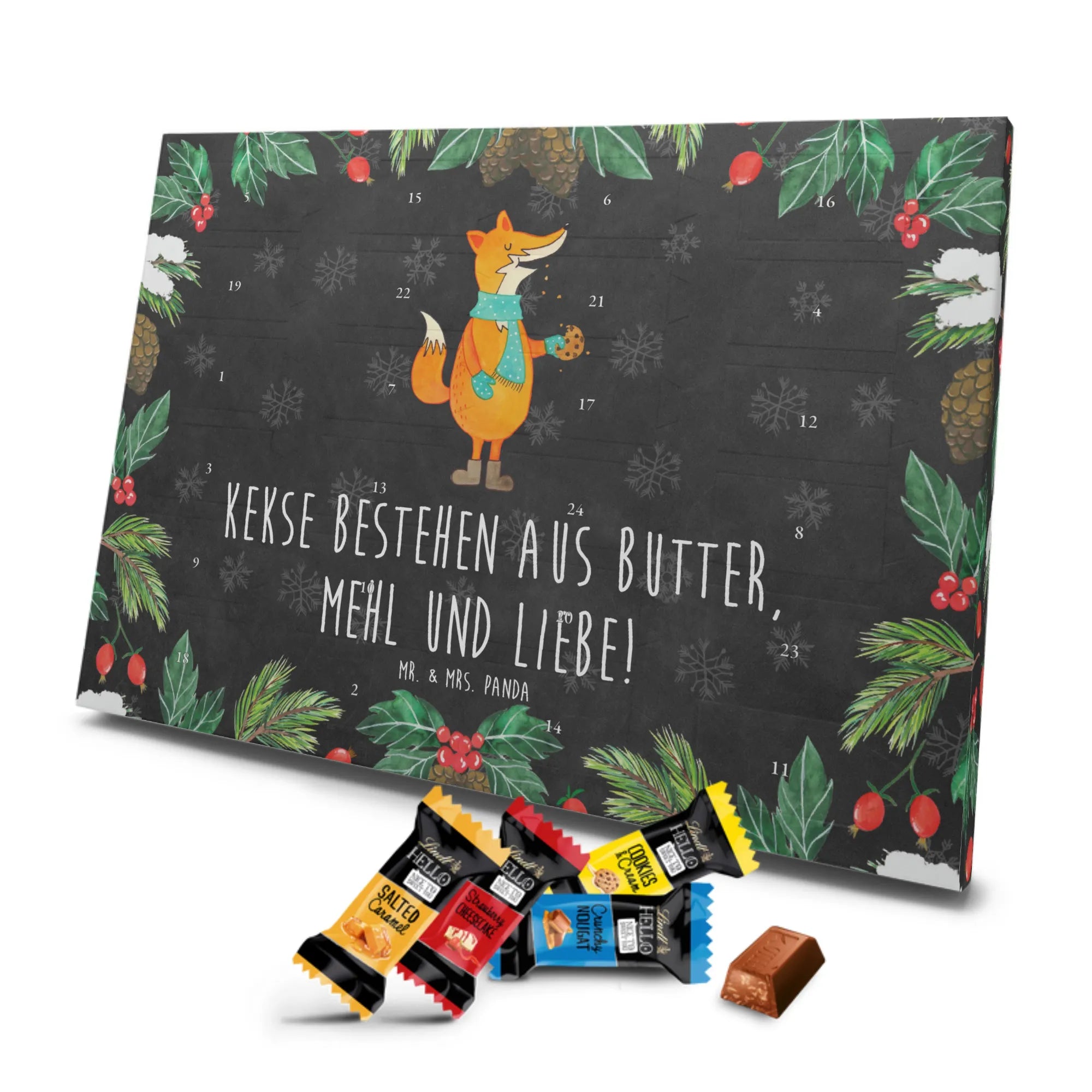 Feier die Adventszeit mit unserem liebevollen Schoko-Adventskalender von Mr. & Mrs. Panda. Jeder Kalender ist mit unseren typischen Motiven und heiteren Sprüchen bedruckt und bringt Vorfreude in dein Zuhause. Der Kalender ist nicht personalisierbar, punktet aber mit brillanter Druckqualität und einer seidenmatten Oberflächenveredelung. Auch die Seitenflächen sind gestaltet, damit das Motiv rundherum wirkt. Maße: 325 mm x 225 mm x 27 mm. Du kannst den Kalender problemlos aufhängen oder aufstellen – praktisch und dekorativ zugleich. Gefüllt mit Lindt Hello Schokolade: 24 einzeln verpackte Mini Sticks in vier beliebten Geschmacksrichtungen: Karamell-Schokoladenkuchen, Kekse, Knuspriger Nougat und Erdbeer-Cheesecake. Zutaten wie Zucker, Kakaobutter, Vollmilchpulver und Haselnüsse sind enthalten; Allergene: Milcheiweiß, Milchzucker, Soja, Weizen, Haselnüsse; kann Spuren anderer Schalenfrüchte, z. B. Mandeln, enthalten. Der Kalender ist eine tolle Geschenkidee für Erwachsene und Kinder – ein täglicher Schoko-Moment in der Adventszeit.