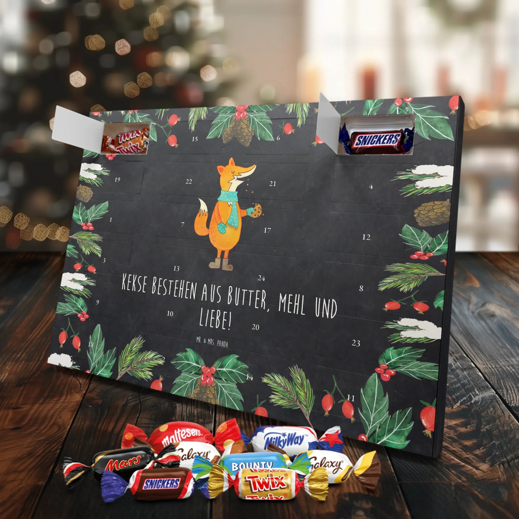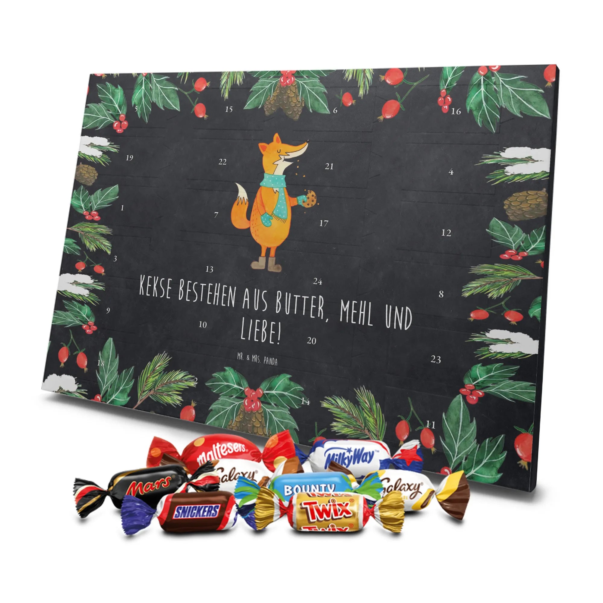 Unser Adventskalender mit Schokolade von Mr. & Mrs. Panda ist ein liebevoll gestaltetes Highlight für die Adventszeit. Die süßen Illustrationen und charmanten Sprüche sorgen für gute Stimmung bei Groß und Klein. Gedruckt in brillanter Qualität mit seidenmatter Oberflächenveredelung, wirken die Farben kräftig und edel; auch die Seitenflächen sind dekorativ bedruckt. Bitte beachten: Der Kalender ist nicht personalisierbar. Gefüllt ist er mit 24 Celebrations-Überraschungen in acht verschiedenen Sorten: Maltesers, Mars, Snickers, Twix, Milky Way, Bounty, Galaxy und Galaxy Caramel — perfekte Abwechslung für jeden Tag. Besonderheit: Du kannst den Kalender sowohl aufstellen als auch aufhängen. Maße: 325 mm x 225 mm x 27 mm. Schenke Vorfreude und kleine Genussmomente – ideal als Geschenk oder für deine eigene Adventszeit.