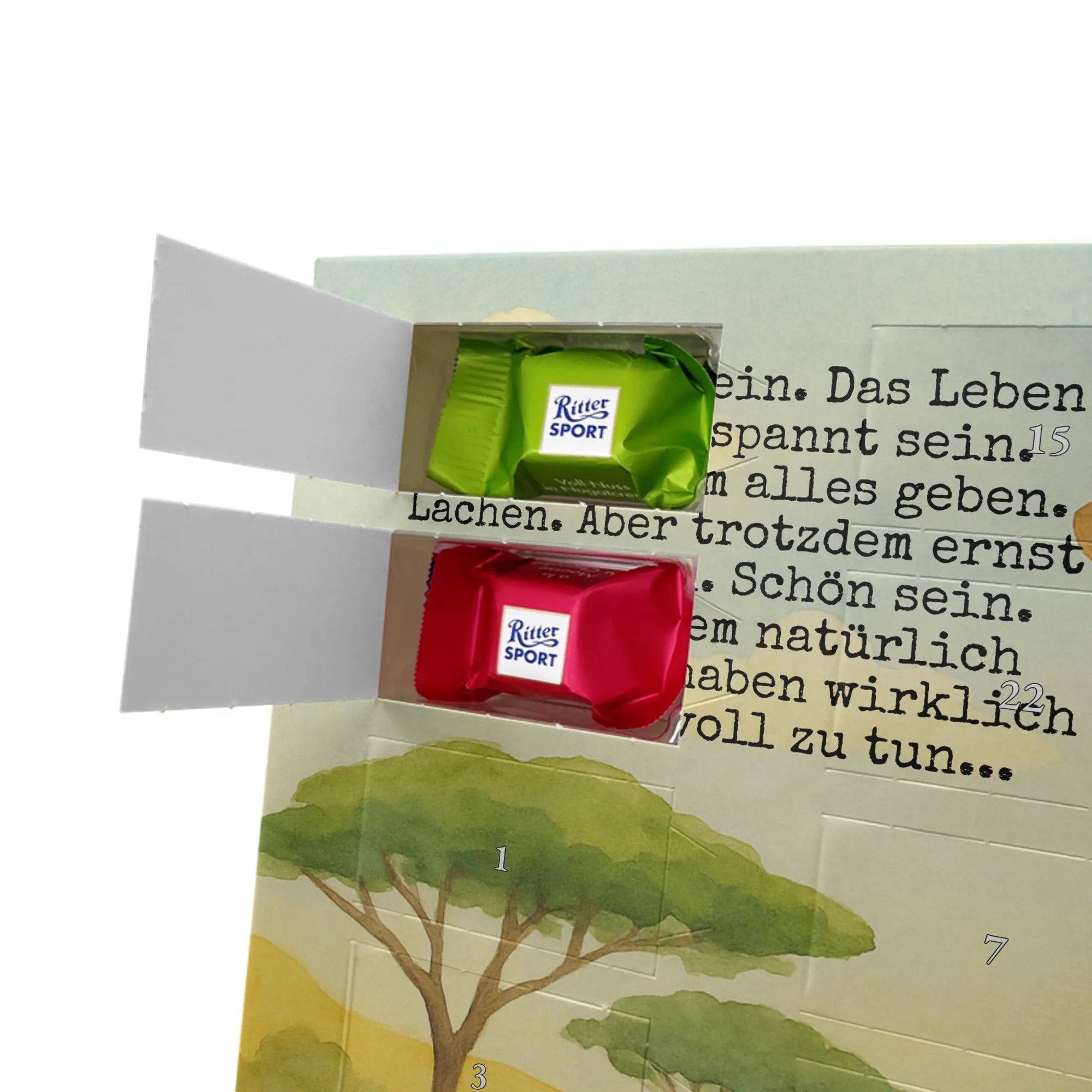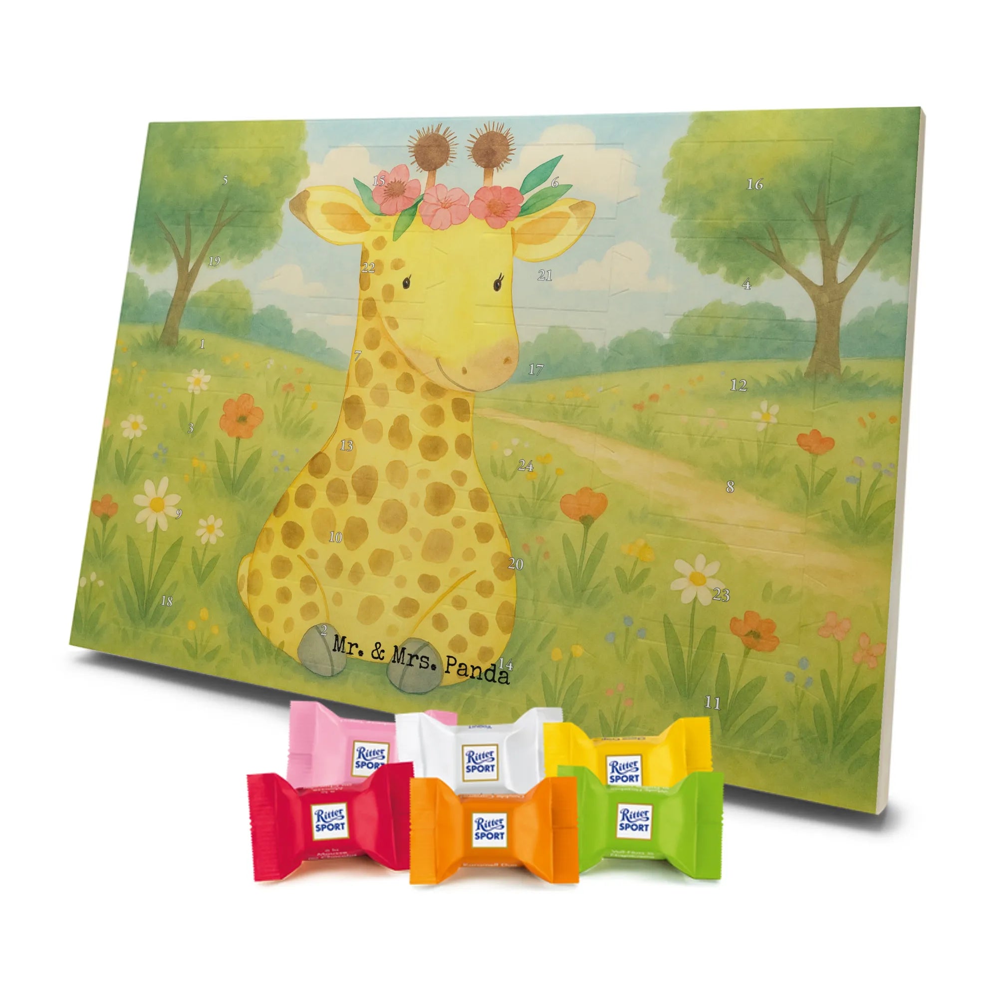 Unser entzückender Schokoladen Adventskalender von Mr. & Mrs. Panda ist das perfekte Highlight für die Adventszeit. Bedruckt mit wunderschönen Motiven & Sprüchen von Mr. & Mrs. Panda zaubert er dir ein Lächeln an jedem Tag im Dezember. Der Kalender ist nicht personalisierbar, überzeugt aber durch brillante Druckqualität mit seidenmatter Oberflächenveredelung und sorgsame bedruckte Seitenflächen. Die stabile Verarbeitung macht ihn zu einem dekorativen Hingucker. Maße: 325 mm x 225 mm x 27 mm. Besonders praktisch: Er kann aufgehängt oder aufgestellt werden, ganz nach deinem Geschmack und Platzangebot. Gefüllt ist der Adventskalender mit Ritter Sport Schokowürfeln – in verführerischen Sorten wie Mousse au Chocolat, Schoko Crisp, Voll-Nuss in Nougatcreme, Karamell Duo, Joghurt und Erdbeer-Joghurt. Wichtiger Hinweis: Es handelt sich um einen Kalender gefüllt mit Ritter Sport Schokolade, nicht um einen Kalender der Marke Ritter Sport. Schenk ihn Freunden, der Familie oder gönn dir selbst eine süße Vorfreude: kleine Schokoladenmomente, liebevoll verpackt von Mr. & Mrs. Panda.