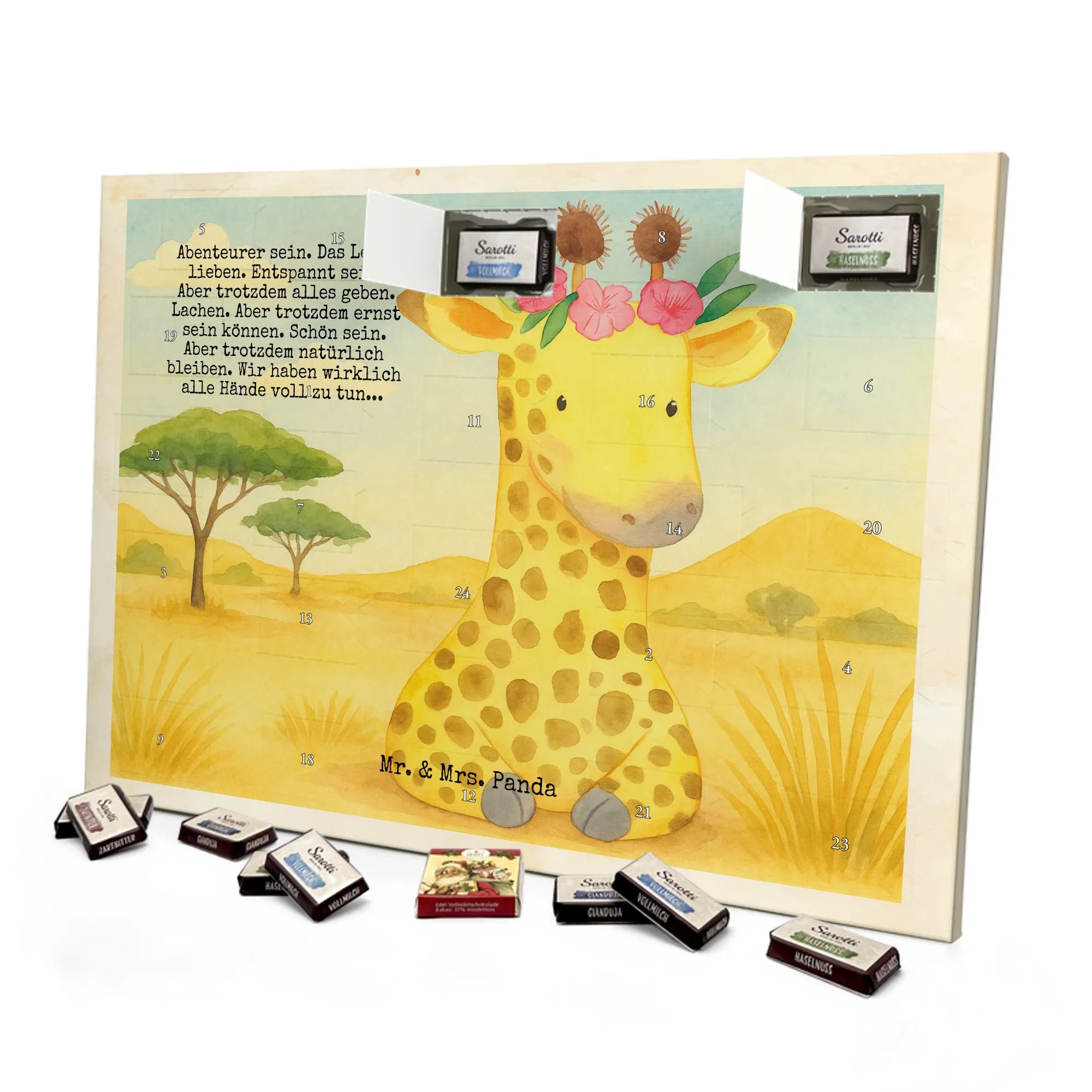 Feiere die Adventszeit mit dem liebevoll gestalteten Schoko Adventskalender von Mr. & Mrs. Panda. Mit zauberhaften Motiven und Sprüchen bedruckt, besticht der Kalender durch brillante Farben und eine seidenmatte Oberflächenveredelung. Die bedruckten Seitenflächen sorgen für ein stimmiges Gesamtbild, das sich perfekt in deine Weihnachtsdeko einfügt. Der Kalender ist nicht personalisierbar, bietet dir aber die Freiheit, ihn aufzuhängen oder aufzustellen. Hinter den Türchen findest du 24 einzeln verpackte Schokoladentäfelchen in vier beliebten Geschmacksrichtungen – Vollmilch, Nougat, Zartbitter und Haselnuss – von Sarotti® und Confiserie Heidel®. Insgesamt enthält der Kalender 107 g Markenschokolade. Maße: 355 mm x 245 mm x 11 mm – ideal dimensioniert für Regal, Tisch oder Fensterbank. Verschenke liebevolle Vorfreude und kleine Genussmomente: dieser Schoko Adventskalender vereint schönes Design mit hochwertiger Markenschokolade und ist ein tolles Mitbringsel oder Geschenk für Freunde und Familie.