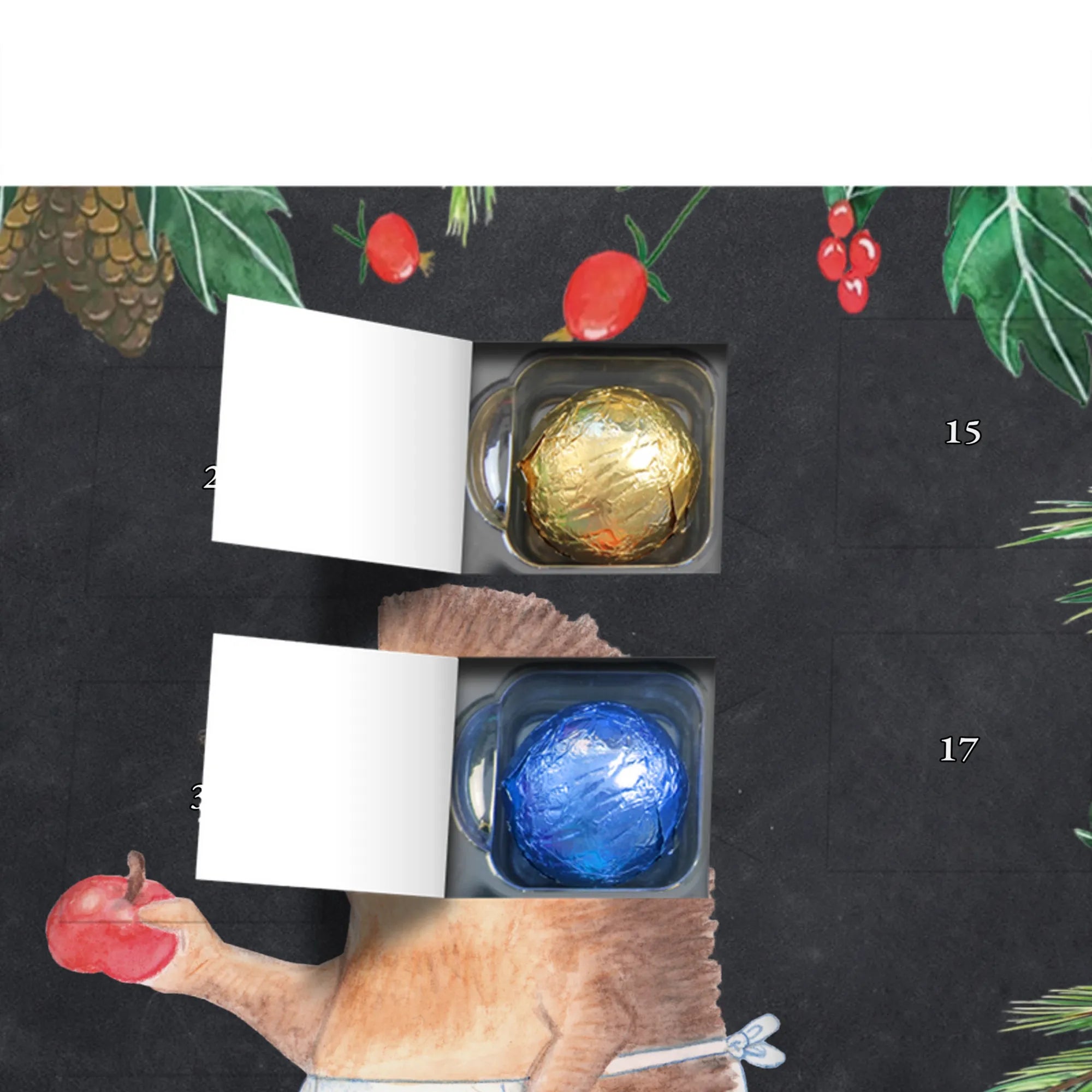Wunderschöner Schokoladen-Adventskalender von Mr. & Mrs. Panda – süßes Design trifft hochwertige Verarbeitung. Unser Schokoladen-Adventskalender ist bedruckt mit wunderschönen Motiven & Sprüchen von Mr. & Mrs. Panda und nicht personalisierbar, dafür aber mit liebevollen Details gestaltet. Die brillante Druckqualität mit seidenmatter Oberflächenveredelung verleiht dem Kalender ein edles Finish, und auch die Seitenflächen sind bedruckt für einen rundum stimmigen Look. Maße: 233 mm x 178 mm x 24 mm. Die Konstruktion erlaubt sowohl das Aufstellen als auch das Aufhängen – Besonderheit: kann aufgehängt oder aufgestellt werden. Gefüllt mit MARKENNAMEN Schokolade und mit leckeren Schokoladenkugeln bestückt, ist jeder Dezembertag eine kleine Belohnung. Bitte lies die besonderen Hinweise: (Kann Spuren von Haselnüssen, Mandeln, Gluten und Soja enthalten!), kühl und trocken lagern. Ideal als Geschenk, Adventsdekoration oder süße Überraschung für Freunde und Familie. Mr. & Mrs. Panda wünscht dir eine gemütliche und genussvolle Adventszeit!