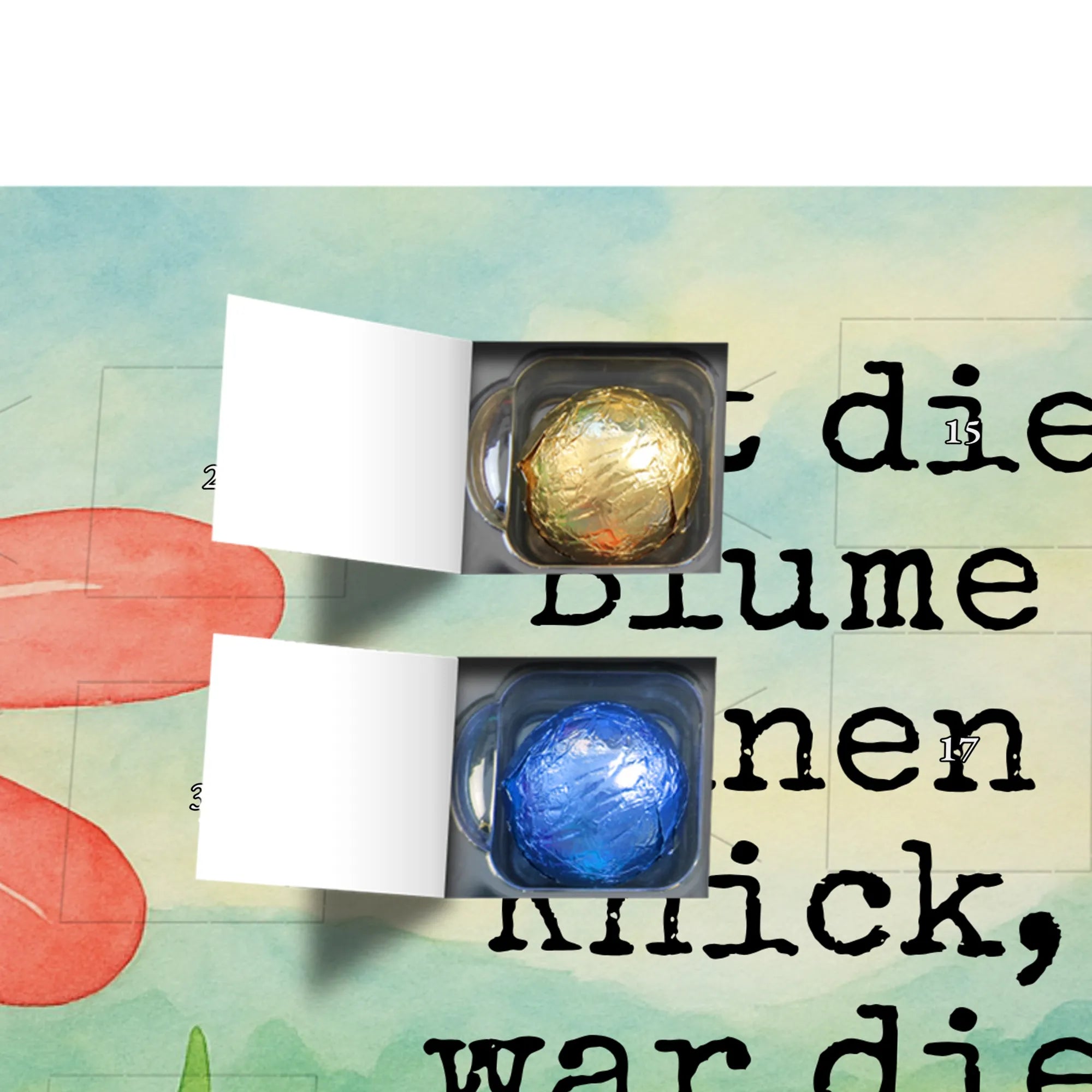 Wunderschöner Adventskalender mit Schokolade von Mr. & Mrs. Panda – für alle, die Advent und Design lieben. Dieser Adventskalender mit Schokolade ist liebevoll bedruckt mit wunderschönen Motiven & Sprüchen von Mr. & Mrs. Panda und ist nicht personalisierbar, aber mit viel Liebe zum Detail gefertigt. Brillante Druckqualität mit seidenmatter Oberflächenveredelung sorgt für einen edlen Look, und die bedruckten Seitenflächen geben dem Kalender eine besondere Optik. Maße: 233 mm x 178 mm x 24 mm. Dank seiner stabilen Verarbeitung kannst du ihn aufstellen oder ganz einfach aufhängen – Besonderheit: kann aufgehängt oder aufgestellt werden. Gefüllt mit MARKENNAMEN Schokolade und leckeren Schokoladenkugeln, bringt er jeden Tag ein kleines Glückserlebnis. Wichtige Hinweise: (Kann Spuren von Haselnüssen, Mandeln, Gluten und Soja enthalten!), bitte kühl und trocken lagern. Ob als Geschenk, Mitbringsel oder Adventsdeko – dieser Kalender zaubert ein Lächeln und sorgt für gemütliche Vorfreude. Viel Freude beim Entdecken der süßen Überraschungen wünscht dir Mr. & Mrs. Panda!