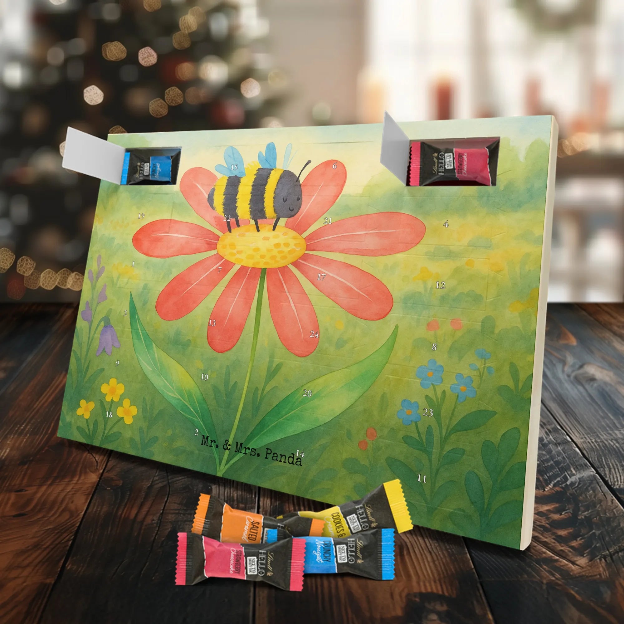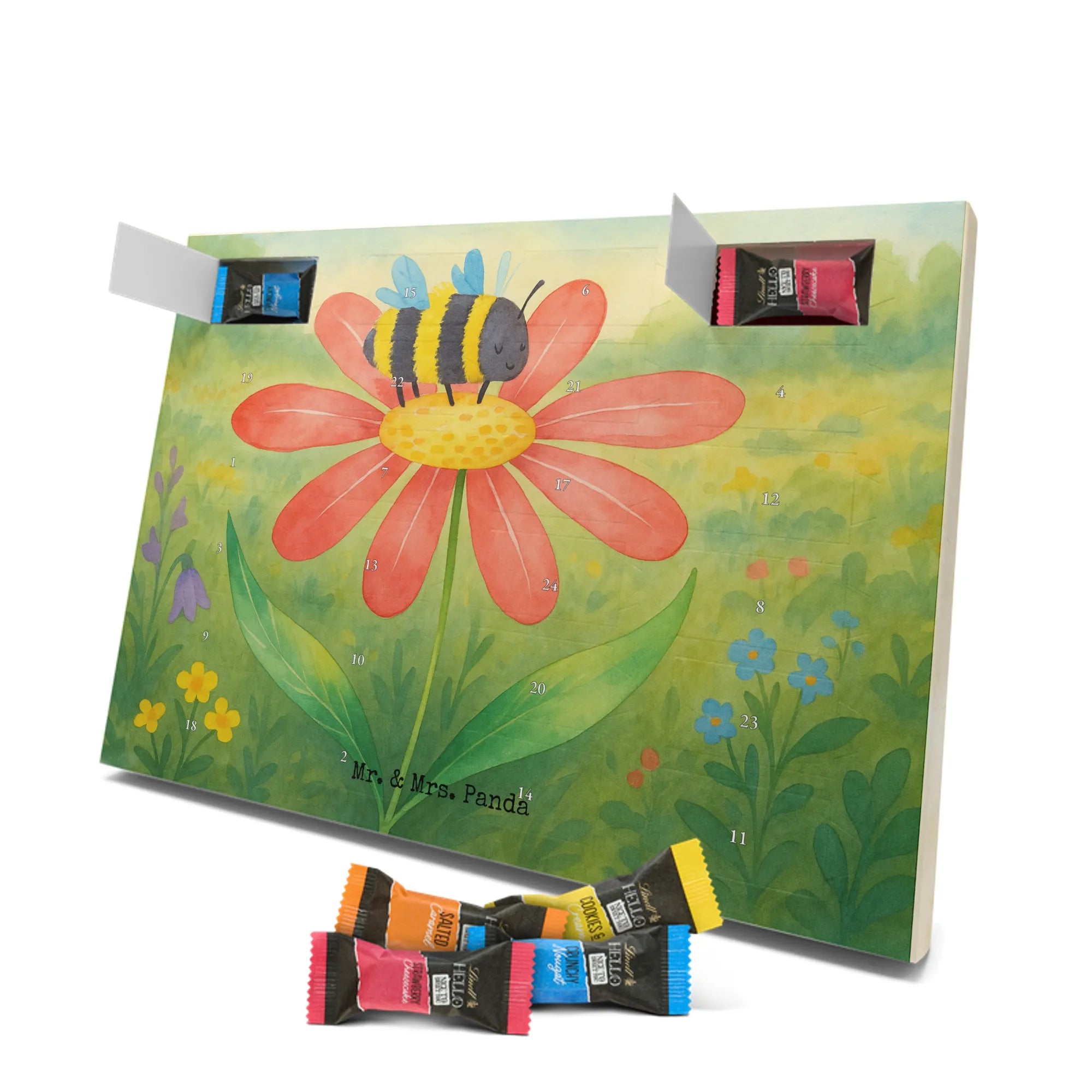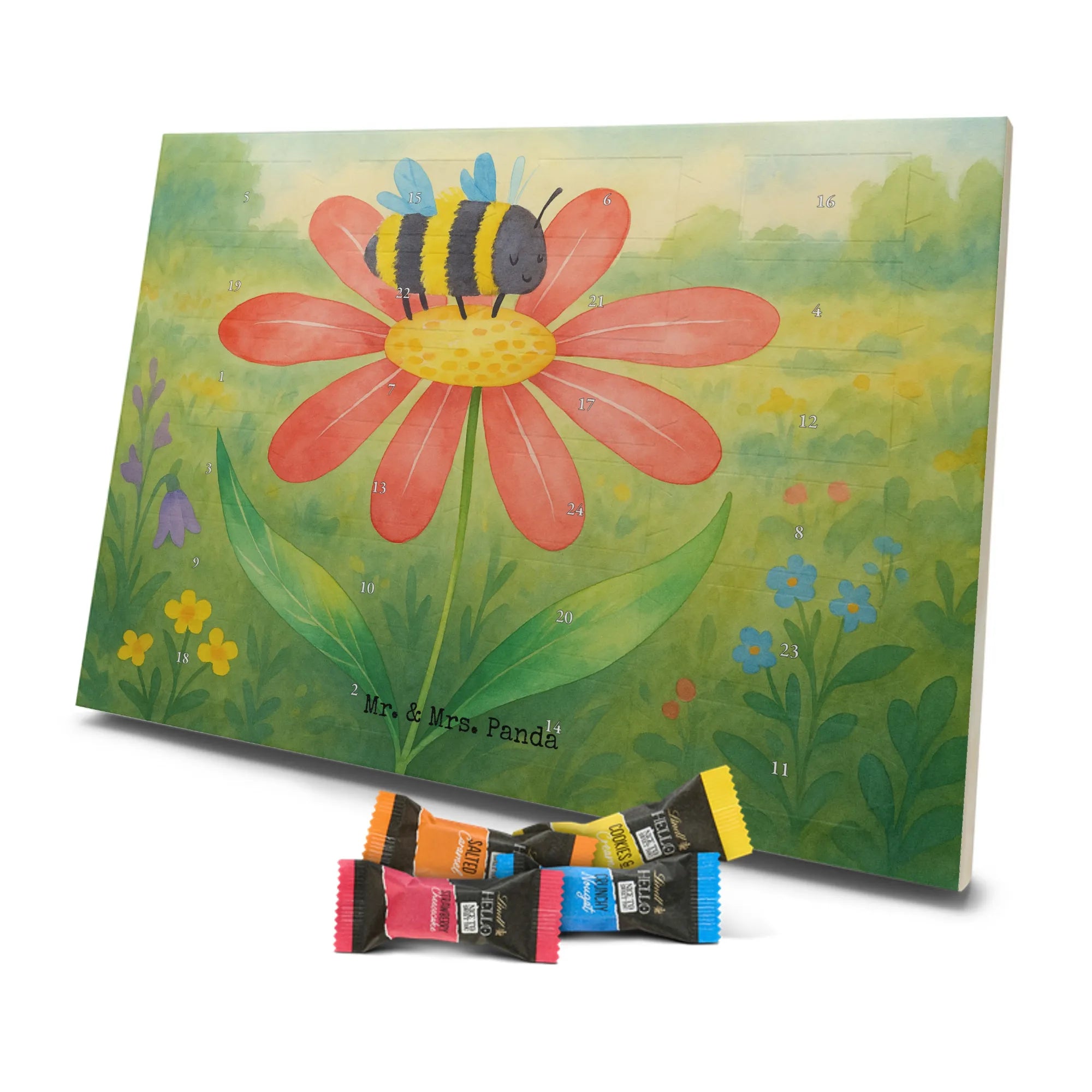 Wunderschöner Schoko Adventskalender von Mr. & Mrs. Panda – perfekt, wenn du dir oder deinen Liebsten die Adventszeit mit süßen Überraschungen versüßen willst. Unser liebevoll gestalteter Schokoladen Adventskalender ist bedruckt mit bezaubernden Motiven und frechen Sprüchen von Mr. & Mrs. Panda und sorgt jeden Tag für ein Lächeln. Der Kalender ist nicht personalisierbar, dafür aber in brillanter Druckqualität mit seidenmatter Oberflächenveredelung gefertigt. Auch die Seitenflächen sind vollständig bedruckt, was dem Design noch mehr Tiefe verleiht. Maße: 325 mm x 225 mm x 27 mm. Besonders praktisch: Der Kalender kann aufgehängt oder aufgestellt werden – so findest du immer den idealen Platz bei dir zu Hause. Gefüllt mit Lindt Hello Schokolade: 24 einzeln verpackte Schokoladen Mini Sticks in vier verschiedenen Sorten – Karamell-Schokoladenkuchen, Kekse, Knuspriger Nougat und Erdbeer-Cheesecake. Zutaten und Allergene findest du auf der Verpackung; wichtige Hinweise: enthält Milcheiweiß, Milchzucker, Soja, Weizen und Haselnüsse, kann Mandeln und andere Schalenfrüchte enthalten. Dieser Adventskalender ist eine liebevolle Geschenkidee für Freunde, Familie und alle Schoko-Fans, die jeden Tag bis Weihnachten mit feinem Schoko-Genuss feiern möchten.