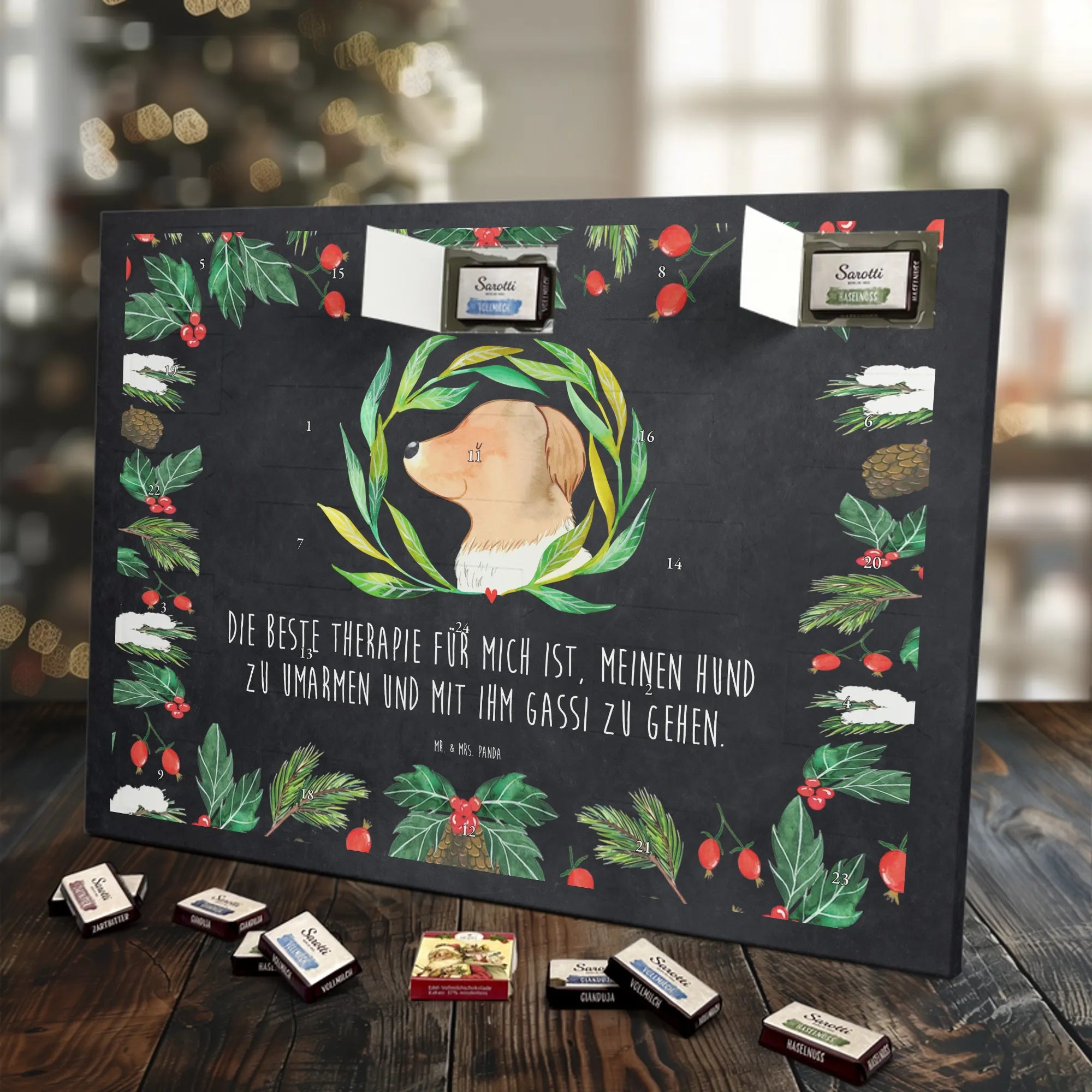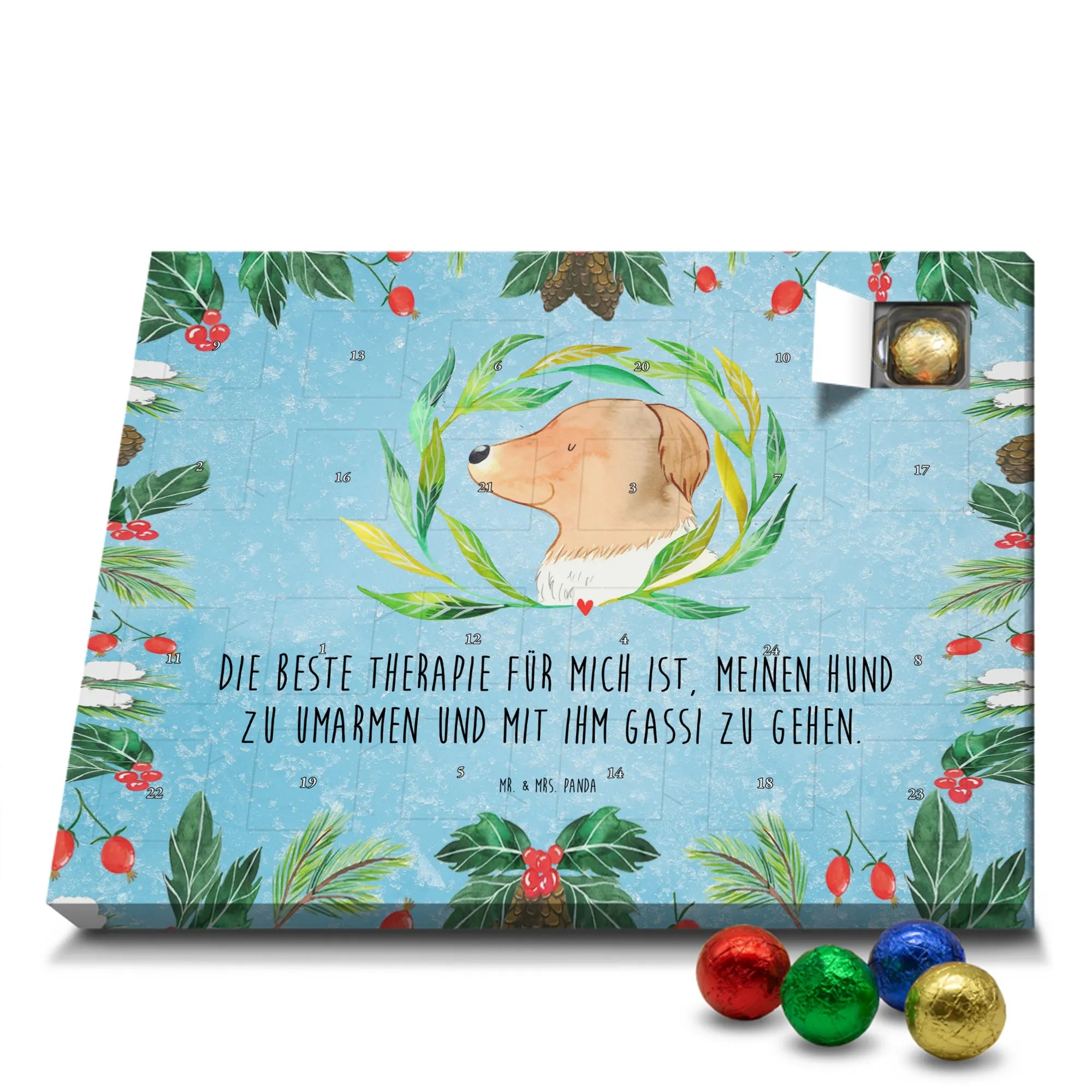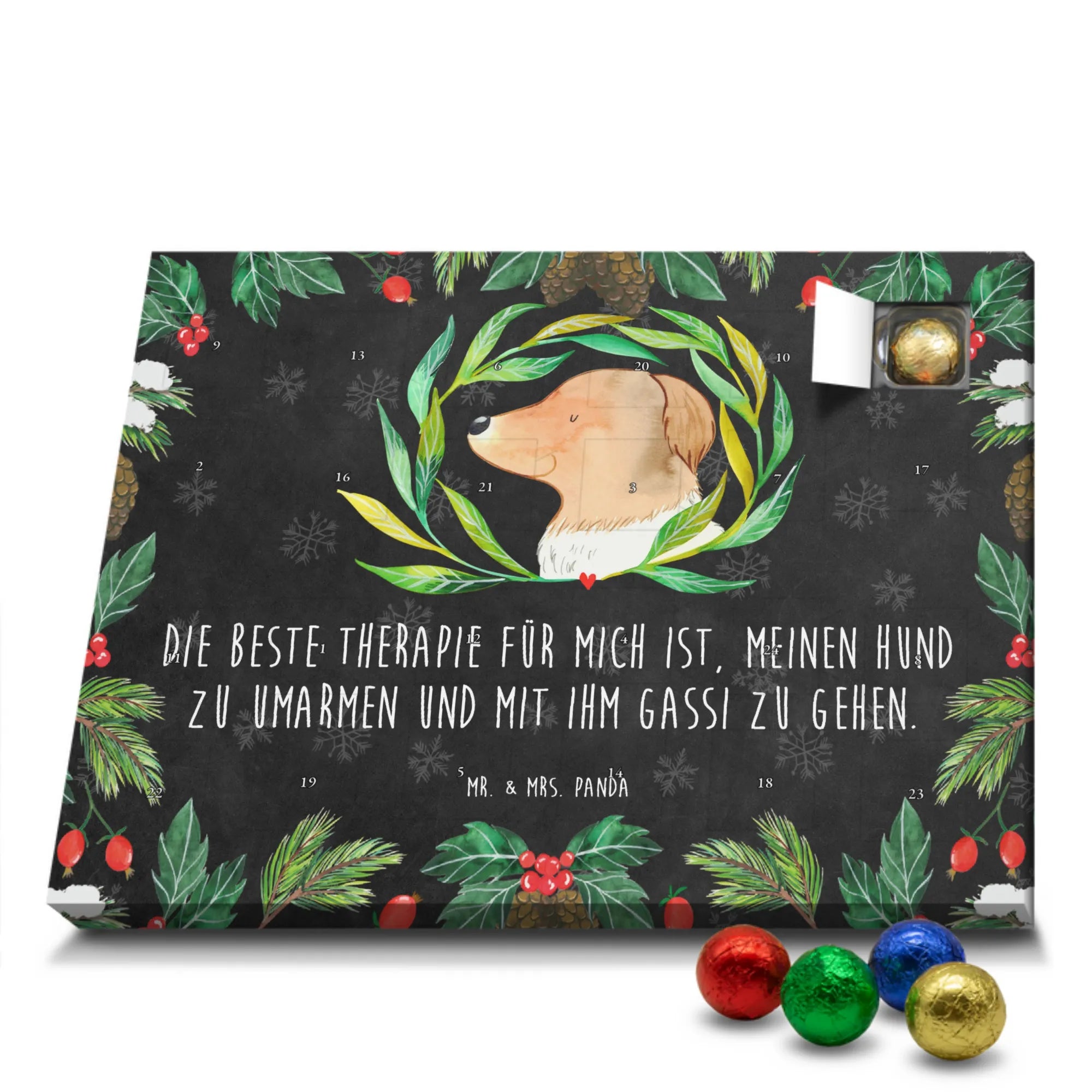 Wunderschöner Schokoladen Adventskalender von Mr. & Mrs. Panda – perfekt, um dir oder deinen Liebsten die Vorweihnachtszeit zu versüßen. Unser liebevoll gestalteter Schoko Adventskalender ist bedruckt mit wunderschönen Motiven & Sprüchen von Mr. & Mrs. Panda und bleibt ein fröhlicher Blickfang auf dem Tisch oder an der Wand. Er ist nicht personalisierbar, dafür aber mit viel Herz und Details gestaltet. Brillante Druckqualität mit seidenmatter Oberflächenveredelung sorgt dafür, dass die Farben strahlen und die Motive besonders edel wirken. Die Seitenflächen sind ebenfalls bedruckt, sodass der Kalender von allen Seiten hübsch aussieht. Maße: 233 mm x 178 mm x 24 mm und durch seine stabile Bauweise kannst du ihn sowohl aufstellen als auch an die Wand hängen – Besonderheit: kann aufgehängt oder aufgestellt werden. Gefüllt mit MARKENNAMEN Schokolade und leckeren Schokoladenkugeln, bietet jeder Tag eine kleine, köstliche Überraschung. Bitte beachte die besonderen Hinweise: (Kann Spuren von Haselnüssen, Mandeln, Gluten und Soja enthalten!), kühl und trocken lagern. Der Kalender eignet sich toll als Geschenk, als Adventsdekoration oder als liebevolle Aufmerksamkeit für Freunde und Familie. Mr. & Mrs. Panda wünscht dir eine süße und gemütliche Vorweihnachtszeit!