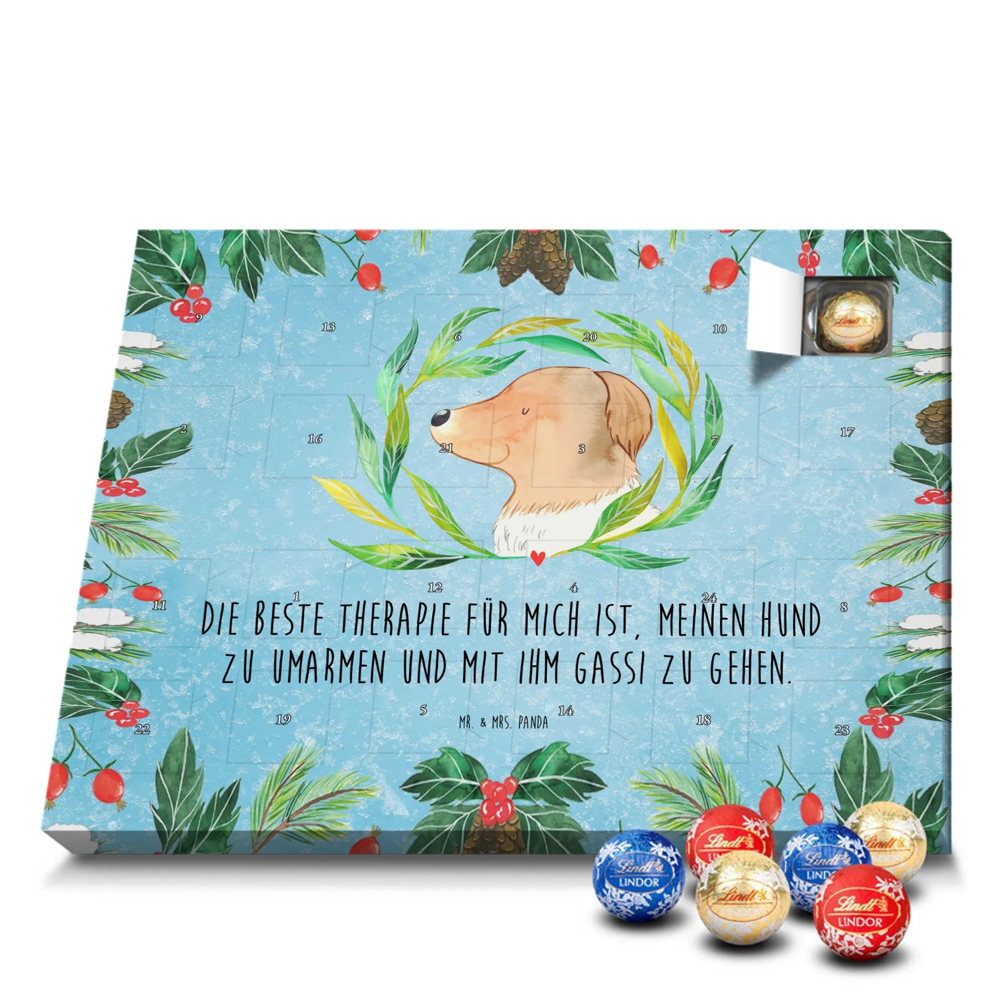 Unser zauberhafter Schoko Adventskalender von Mr. & Mrs. Panda bringt dir die süßeste Vorfreude auf Weihnachten! Dieser liebevoll gestaltete Adventskalender ist bedruckt mit wunderschönen Motiven & Sprüchen von Mr. & Mrs. Panda und ist nicht personalisierbar – dafür aber ein perfektes Geschenk für Freunde und Familie. Brillante Druckqualität mit seidenmatter Oberflächenveredelung sorgt für ein edles Finish, und die bedruckten Seitenflächen machen den Kalender von allen Seiten zu einem Hingucker. Maße: 233 mm x 178 mm x 24 mm. Besonderheit: kann aufgehängt oder aufgestellt werden, je nachdem, wie du ihn präsentieren möchtest. Gefüllt mit Lindt Lindor: 24 einzeln verpackte Markenschokoladen Kugeln in drei verschiedenen Sorten – Vollmilch, Feinherb und Weiße Schokolade – sorgen für abwechslungsreichen Genuss in der Adventszeit. Zutaten: Zucker, pflanzliches Fett (Kokosnuss, Palmkern), Kakaobutter, Vollmilchpulver, Kakaomasse, Milchzucker, Magermilchpulver, Butterreinfett, Emulgator (Sojalecithin), Gerstenmalzextrakt, Aromen. Besondere Hinweise: Kann Haselnüsse und Mandeln enthalten. Unser Schoko Adventskalender verbindet niedliches Design mit hochwertiger Füllung – ideal zum Verschenken oder selbst Naschen. Mr. & Mrs. Panda wünschen dir eine fröhliche und leckere Adventszeit!