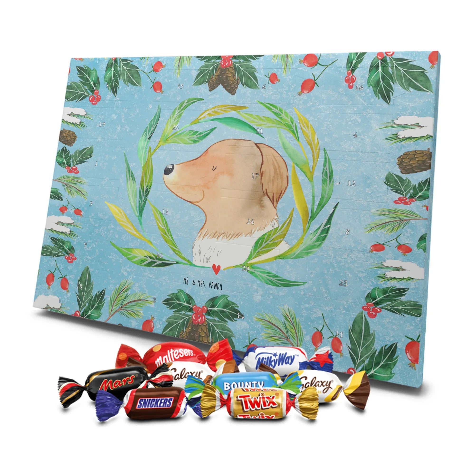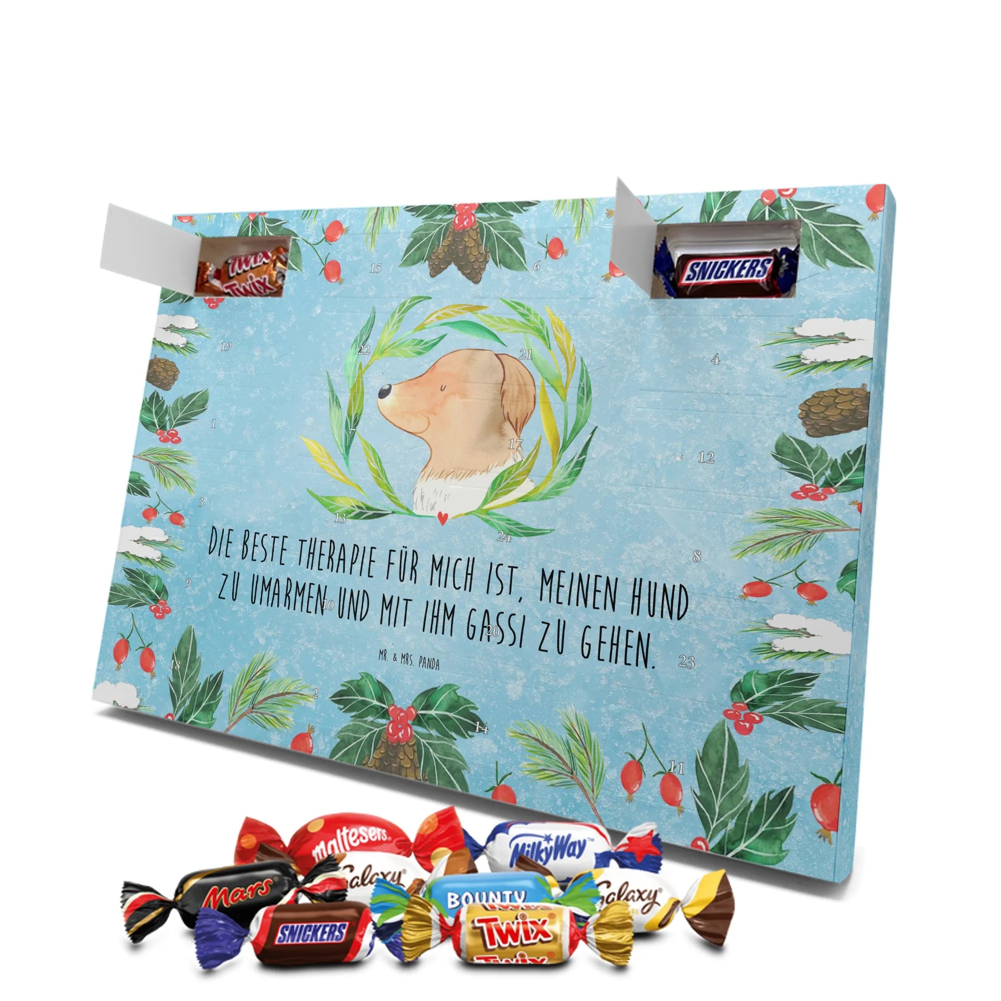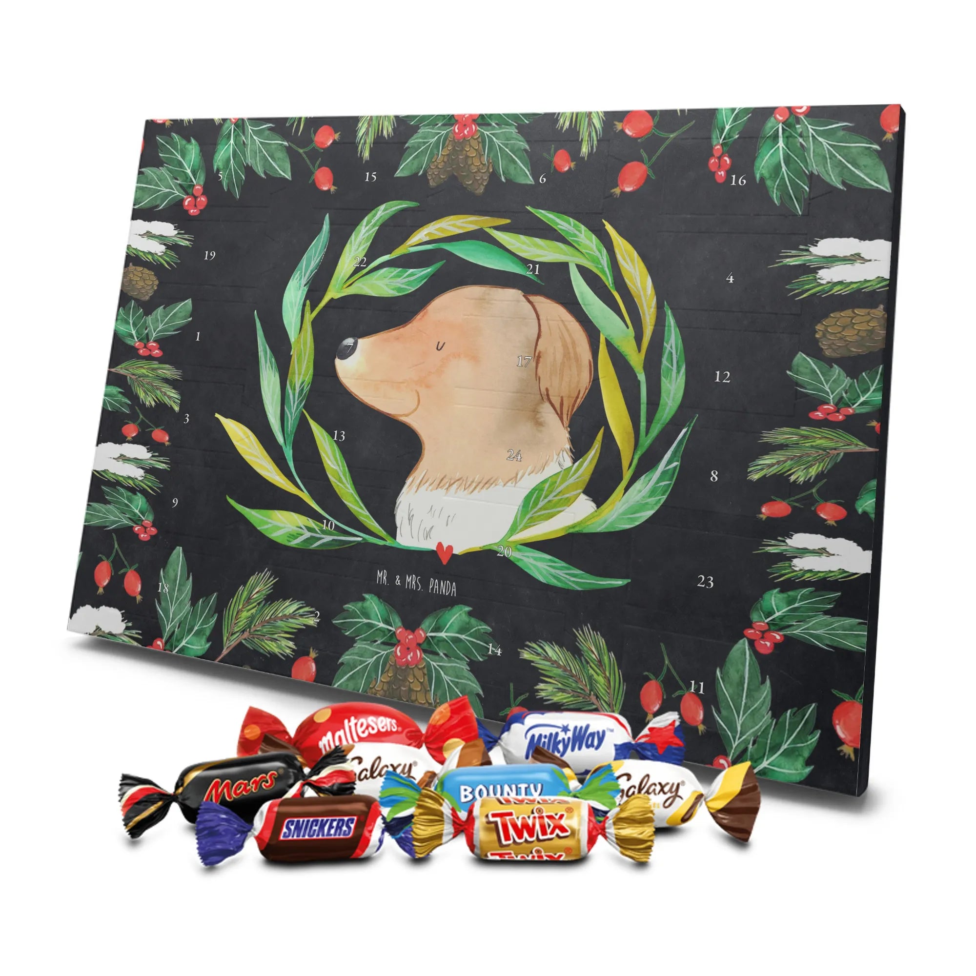 Unser Adventskalender mit Schokolade von Mr. & Mrs. Panda ist ein liebevoll gestaltetes Highlight für die Adventszeit. Die süßen Illustrationen und charmanten Sprüche sorgen für gute Stimmung bei Groß und Klein. Gedruckt in brillanter Qualität mit seidenmatter Oberflächenveredelung, wirken die Farben kräftig und edel; auch die Seitenflächen sind dekorativ bedruckt. Bitte beachten: Der Kalender ist nicht personalisierbar. Gefüllt ist er mit 24 Celebrations-Überraschungen in acht verschiedenen Sorten: Maltesers, Mars, Snickers, Twix, Milky Way, Bounty, Galaxy und Galaxy Caramel — perfekte Abwechslung für jeden Tag. Besonderheit: Du kannst den Kalender sowohl aufstellen als auch aufhängen. Maße: 325 mm x 225 mm x 27 mm. Schenke Vorfreude und kleine Genussmomente – ideal als Geschenk oder für deine eigene Adventszeit.