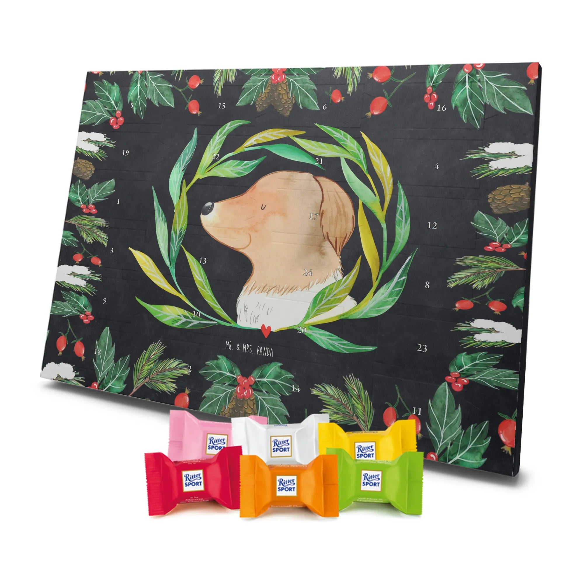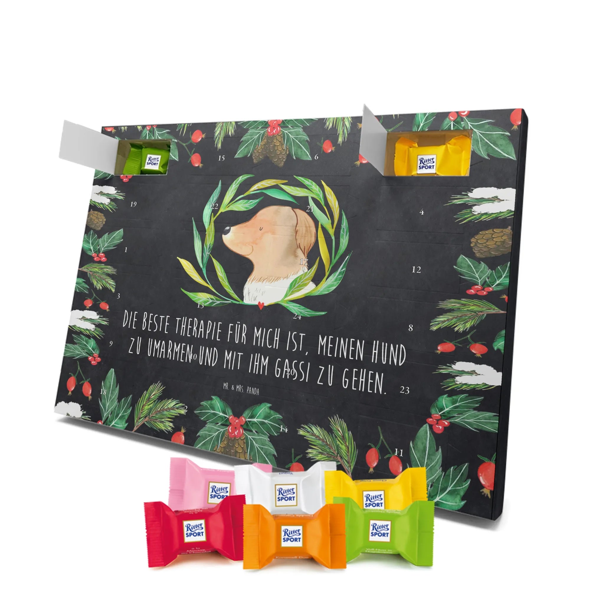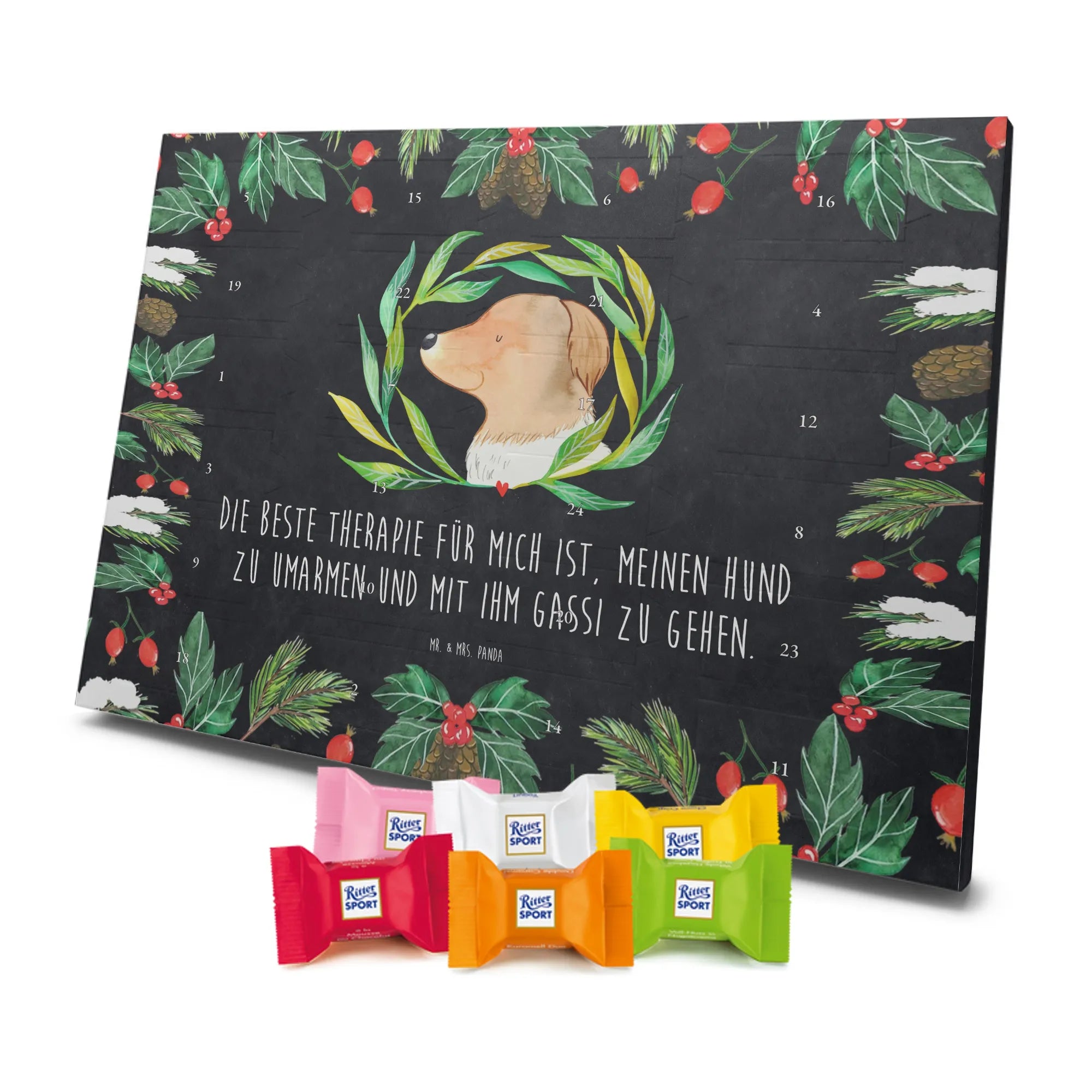 Unser zauberhafter Schoko Adventskalender von Mr. & Mrs. Panda bringt dir die Vorweihnachtszeit mit Liebe und Charme. Der Kalender ist bedruckt mit wunderschönen Motiven & Sprüchen von Mr. & Mrs. Panda und überrascht dich hinter jedem Türchen. Er ist nicht personalisierbar und kommt in brillanter Druckqualität mit seidenmatter Oberflächenveredelung – so sehen die Illustrationen einfach himmlisch aus. Die Seitenflächen sind ebenfalls bedruckt, sodass sich der Kalender von allen Seiten hübsch präsentiert. Maße: 325 mm x 225 mm x 27 mm. Eine besondere Eigenschaft: Du kannst ihn aufgehängt oder aufgestellt verwenden, je nachdem, wo er bei dir am besten zur Geltung kommt. Gefüllt ist der Kalender mit Ritter Sport Schokowürfeln in leckeren Geschmacksrichtungen: Mousse au Chocolat, Schoko Crisp, Voll-Nuss in Nougatcreme, Karamell Duo, Joghurt und Erdbeer-Joghurt. Bitte beachte: Es handelt sich um einen Kalender gefüllt mit Ritter Sport Schokolade, nicht um einen Kalender der Marke Ritter Sport. Perfekt als Geschenk für Freunde, Familie oder einfach als süße Belohnung für dich selbst – dieser Schoko Adventskalender macht die Adventszeit jeden Tag ein bisschen süßer.