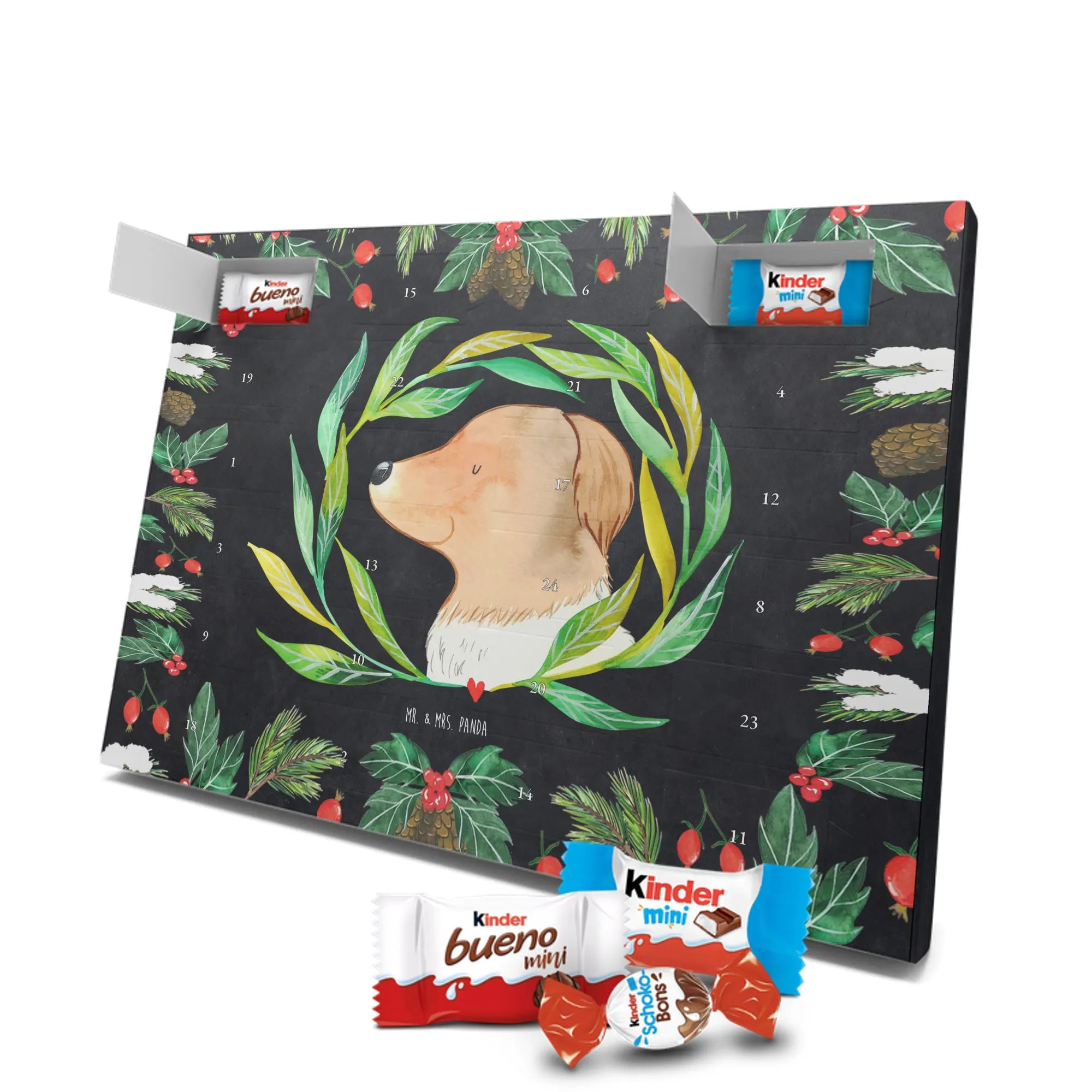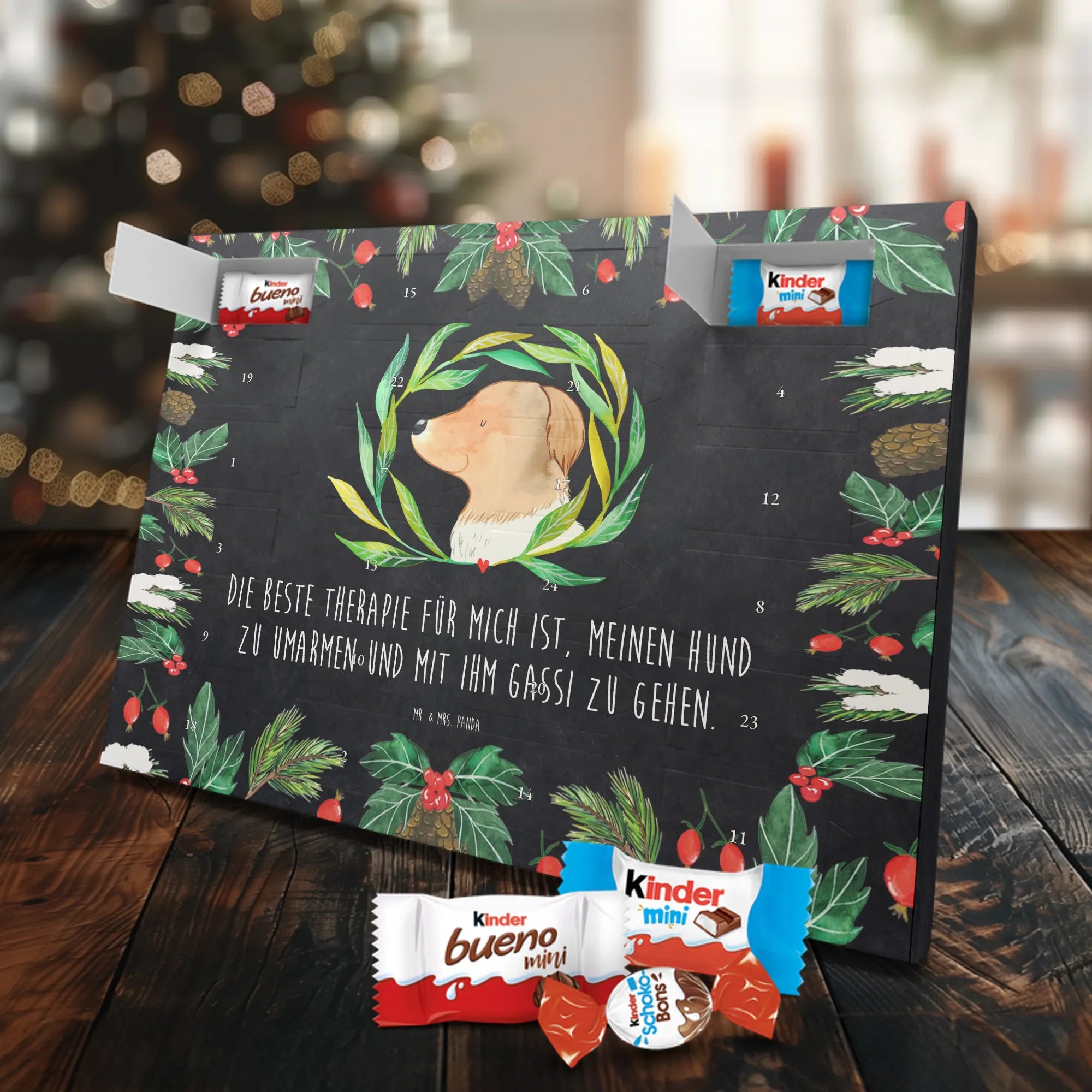 Entdecke unseren liebevoll gestalteten Schoko-Adventskalender von Mr. & Mrs. Panda – eine zauberhafte Idee, um die Tage bis Weihnachten zu versüßen. Der Kalender ist bedruckt mit wunderschönen Motiven & Sprüchen von Mr. & Mrs. Panda und ist nicht personalisierbar. Wir setzen auf brillante Druckqualität mit seidenmatter Oberflächenveredelung und bedruckte Seitenflächen für ein rundum schönes Erscheinungsbild. Maße: 355 mm x 245 mm x 11 mm. Die clevere Bauweise erlaubt es, den Kalender entweder aufzuhängen oder freistehend aufzustellen – so bist du flexibel bei der Dekoration. Gefüllt mit Markenname Schokolade: Adventskalender gefüllt mit kinder® Schokolade. Inhalt: kinder® Schoko-Bons, kinder® Bueno mini und kinder® Schokolade mini. Jeder Tag bringt eine kleine Freude und eignet sich perfekt als Geschenk oder als dekoratives Highlight in deinem Zuhause. Die stabile Verarbeitung sorgt dafür, dass der Kalender die ganze Adventszeit über Freude bereitet. Hol dir diesen Schoko-Adventskalender und lade die Vorweihnachtszeit mit süßen Überraschungen auf!
