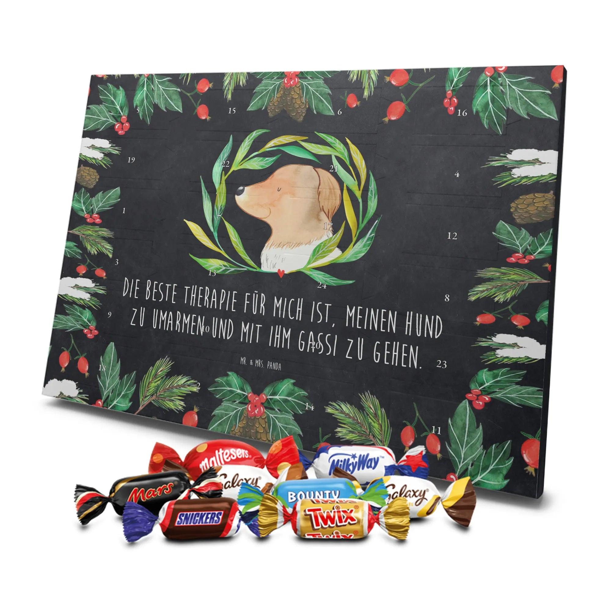 Unser Adventskalender Schokolade von Mr. & Mrs. Panda ist perfekt für alle, die die Adventszeit mit hübschen Bildern und süßen Momenten füllen wollen. Die Motive und Sprüche sind typisch verspielt und sorgen für Lächeln an jedem Dezembertag. Die brillante Druckqualität und die seidenmatte Oberflächenveredelung verleihen dem Kalender eine edle Haptik; auch die Seiten sind liebevoll bedruckt. Achtung: Der Kalender ist nicht personalisierbar. Gefüllt wird er mit 24 hochwertigen Celebrations-Füllungen in insgesamt acht Sorten: Maltesers, Mars, Snickers, Twix, Milky Way, Bounty, Galaxy und Galaxy Caramel — für abwechslungsreiche Genussmomente. Praktisch: Der Kalender lässt sich aufstellen oder aufhängen und passt wunderbar auf Kommode, Fensterbank oder an die Küchenwand. Maße: 325 mm x 225 mm x 27 mm. Ein ideales Geschenk für Freund:innen, Kolleg:innen oder die eigene Familie.