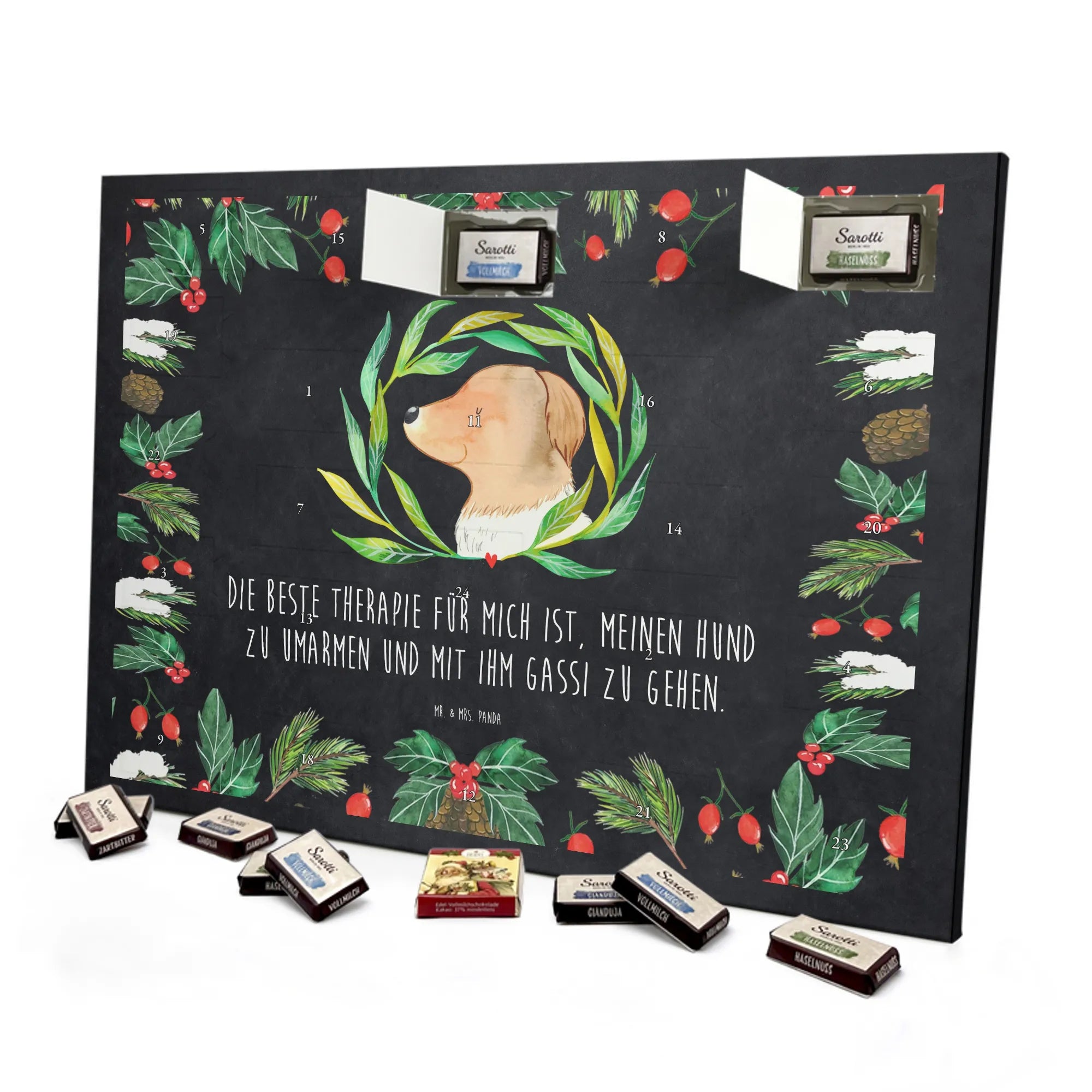 Mach die Vorweihnachtszeit besonders süß mit unserem Schoko-Adventskalender von Mr. & Mrs. Panda. Fröhliche Illustrationen und liebe Sprüche schmücken Vorder- und Seitenflächen, gedruckt in brillanter Qualität und veredelt mit einer seidenmatten Oberfläche für ein warmes, elegantes Finish. Der Kalender ist nicht personalisierbar, überzeugt dafür durch praktische Nutzung: zum Aufhängen oder Aufstellen geeignet. Hinter den 24 Türchen verbergen sich einzeln verpackte Schokoladentäfelchen in vier köstlichen Geschmacksrichtungen – Vollmilch, Nougat, Zartbitter und Haselnuss – von Sarotti® und Confiserie Heidel®. Insgesamt liefert der Kalender 107 g Markenschokolade. Maße: 355 mm x 245 mm x 11 mm – ideal, um Adventsfreude dekorativ zu präsentieren. Verschenke Liebe und Genuss in einem schönen Design, das sich wunderbar in jede Weihnachtsecke einfügt. Mr. & Mrs. Panda wünscht dir eine gemütliche Adventszeit voller kleiner, süßer Überraschungen.