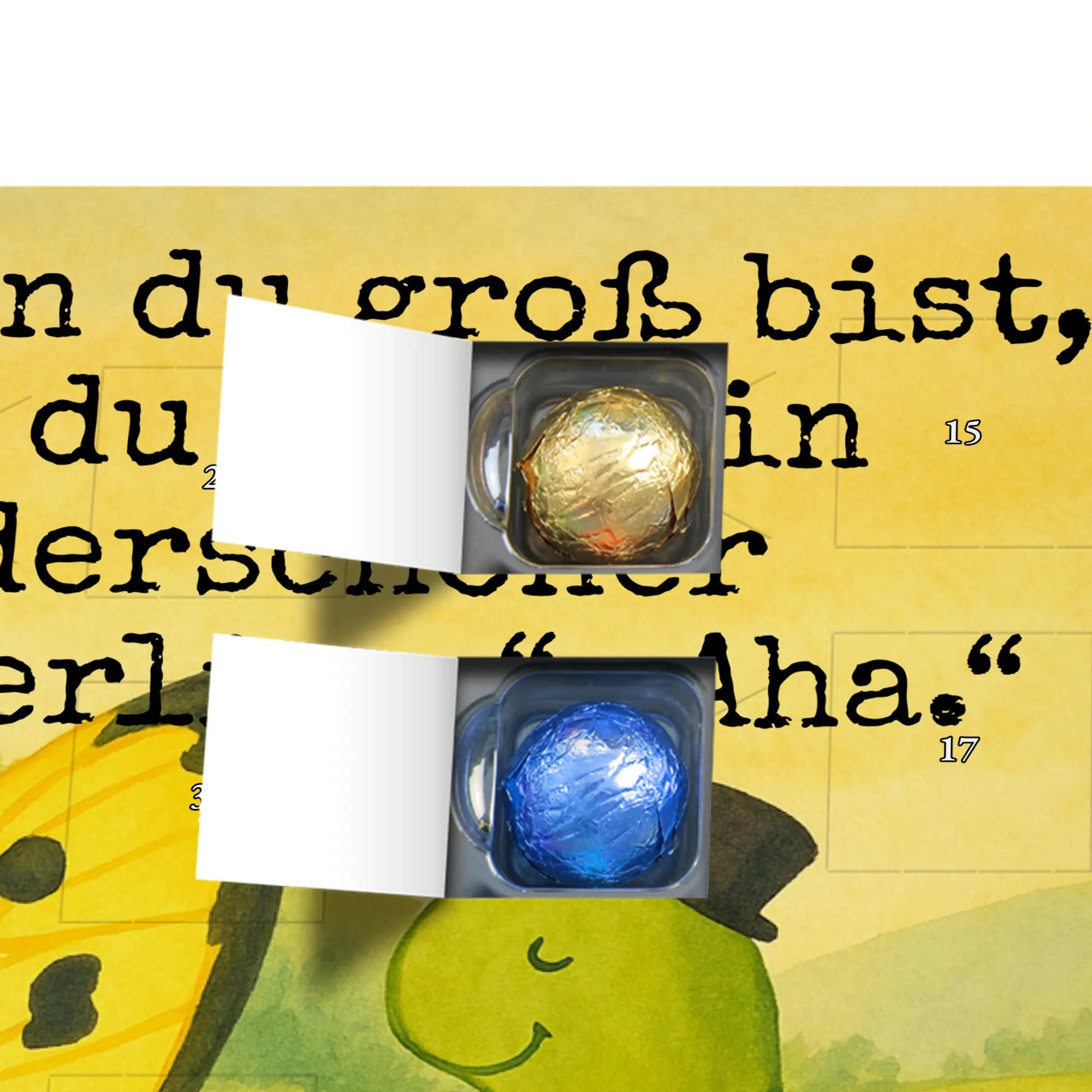 Unser Schoko Adventskalender von Mr. & Mrs. Panda bringt dir und deinen Lieben jede Menge Vorfreude und zauberhafte Momente in die Adventszeit. Der Kalender ist liebevoll bedruckt mit wunderschönen Motiven und frechen Sprüchen im typischen Mr. & Mrs. Panda Stil – ein echter Blickfang auf dem Tisch oder an der Wand. Die brillante Druckqualität kombiniert mit einer seidenmatten Oberflächenveredelung sorgt für edle Farben und ein angenehmes Gefühl beim Anfassen. Auch die Seitenflächen sind bedruckt, sodass der Kalender von allen Seiten hübsch aussieht. Er ist nicht personalisierbar, dafür aber in seiner Gestaltung rundum stimmig. Gefüllt ist der Adventskalender mit 24 hochwertigen Celebrations-Füllungen in acht verschiedenen Sorten: Maltesers, Mars, Snickers, Twix, Milky Way, Bounty, Galaxy und Galaxy Caramel — so ist für jede Naschkatze etwas dabei. Die Besonderheit: Du kannst den Kalender entweder aufstellen oder dank rückseitiger Aufhängung an die Wand hängen. Maße: 325 mm x 225 mm x 27 mm. Ein liebevolles Geschenk für Familie, Freunde oder einfach für dich selbst, das kleine tägliche Glücksmomente schenkt und die Adventszeit versüßt.