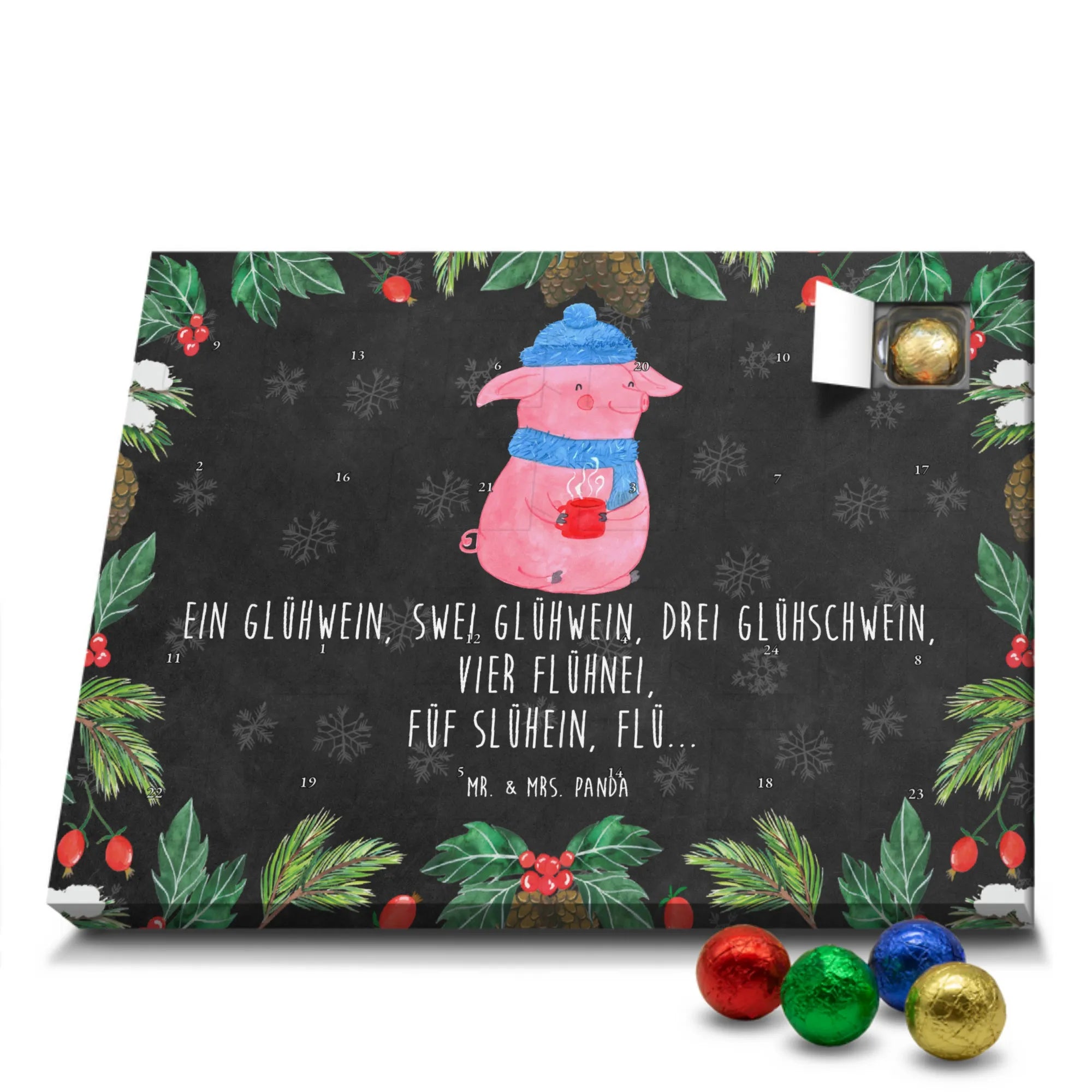 Juhuu — die schönste Zeit im Jahr beginnt! Unser Schoko Adventskalender „Lallelndes Glühschwein“ aus der Winter Kollektion von Mr. & Mrs. Panda bringt Weihnachtsmarkt-Feeling direkt zu dir nach Hause. Das fröhliche, rosafarbene Glühschwein mit blauer Mütze und Schal hält eine dampfende rote Tasse und zaubert mit dem lustigen Spruch „Ein Glühwein, Swei Glühwein, drei Glühschwein, vier Flühnei, Füf Slühein, Flü...“ ein tägliches Lächeln in die Adventszeit. 🎄