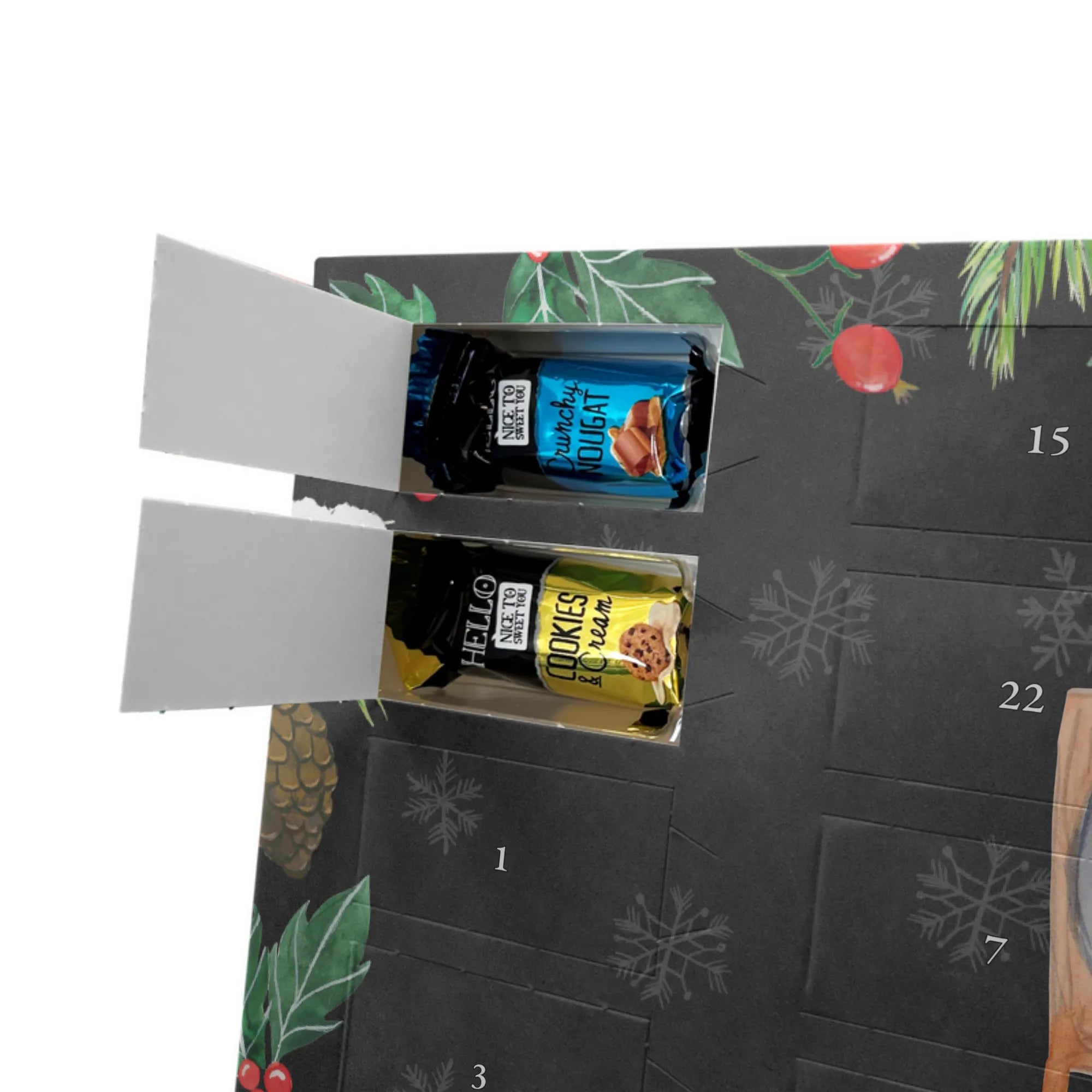 Wunderschöner Schokoladen-Adventskalender von Mr. & Mrs. Panda – süßes Design trifft hochwertige Verarbeitung. Unser Schokoladen-Adventskalender ist bedruckt mit wunderschönen Motiven & Sprüchen von Mr. & Mrs. Panda und nicht personalisierbar, dafür aber mit liebevollen Details gestaltet. Die brillante Druckqualität mit seidenmatter Oberflächenveredelung verleiht dem Kalender ein edles Finish, und auch die Seitenflächen sind bedruckt für einen rundum stimmigen Look. Maße: 233 mm x 178 mm x 24 mm. Die Konstruktion erlaubt sowohl das Aufstellen als auch das Aufhängen – Besonderheit: kann aufgehängt oder aufgestellt werden. Gefüllt mit MARKENNAMEN Schokolade und mit leckeren Schokoladenkugeln bestückt, ist jeder Dezembertag eine kleine Belohnung. Bitte lies die besonderen Hinweise: (Kann Spuren von Haselnüssen, Mandeln, Gluten und Soja enthalten!), kühl und trocken lagern. Ideal als Geschenk, Adventsdekoration oder süße Überraschung für Freunde und Familie. Mr. & Mrs. Panda wünscht dir eine gemütliche und genussvolle Adventszeit!