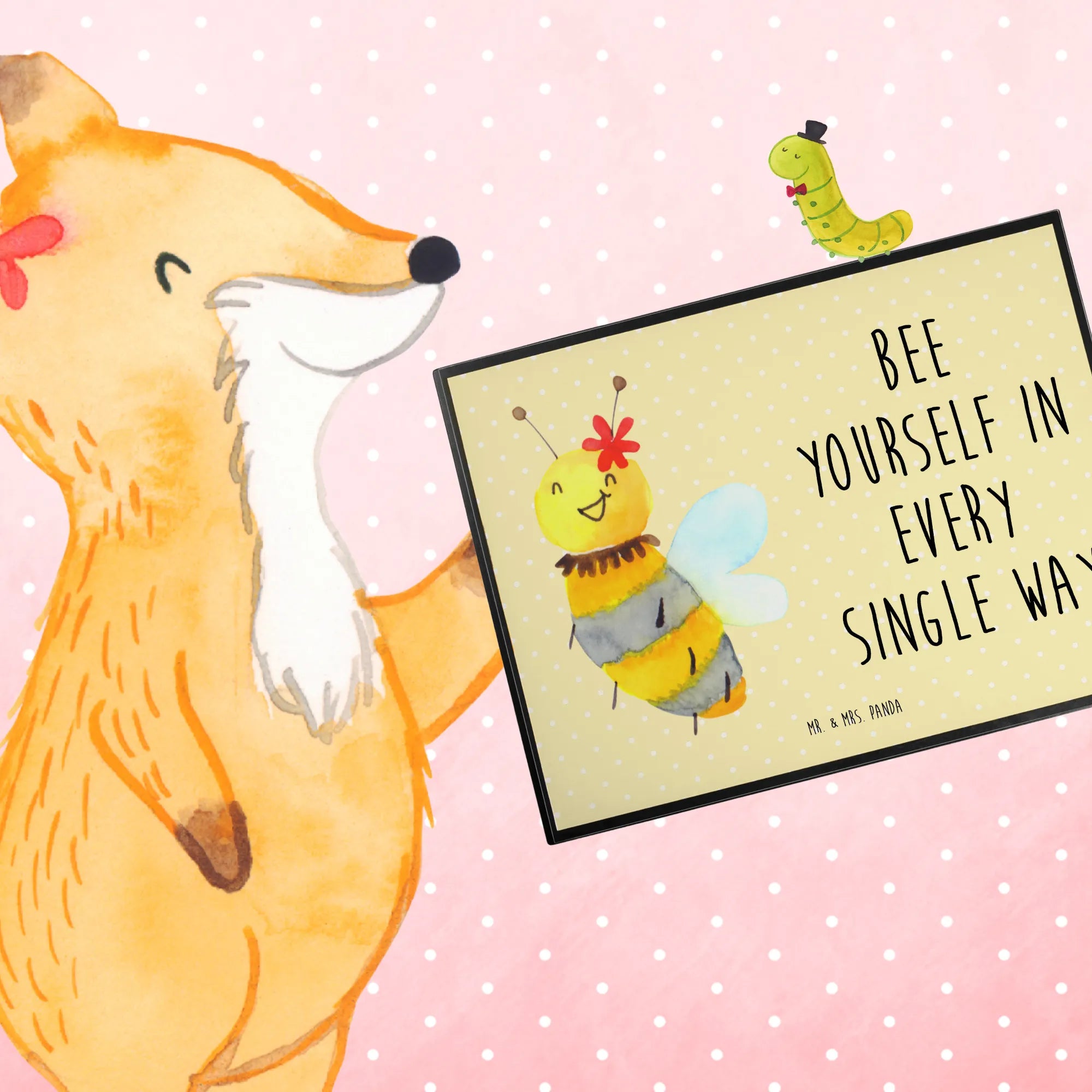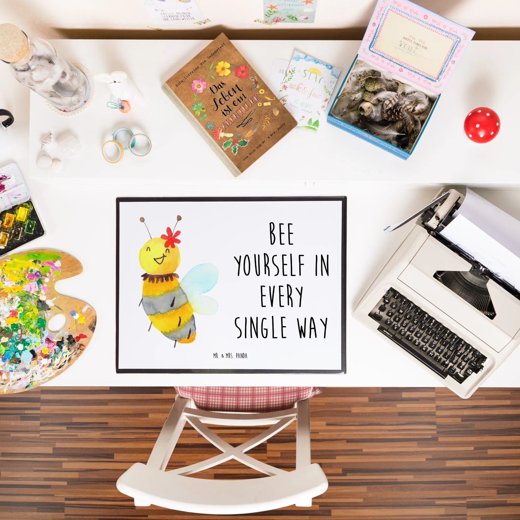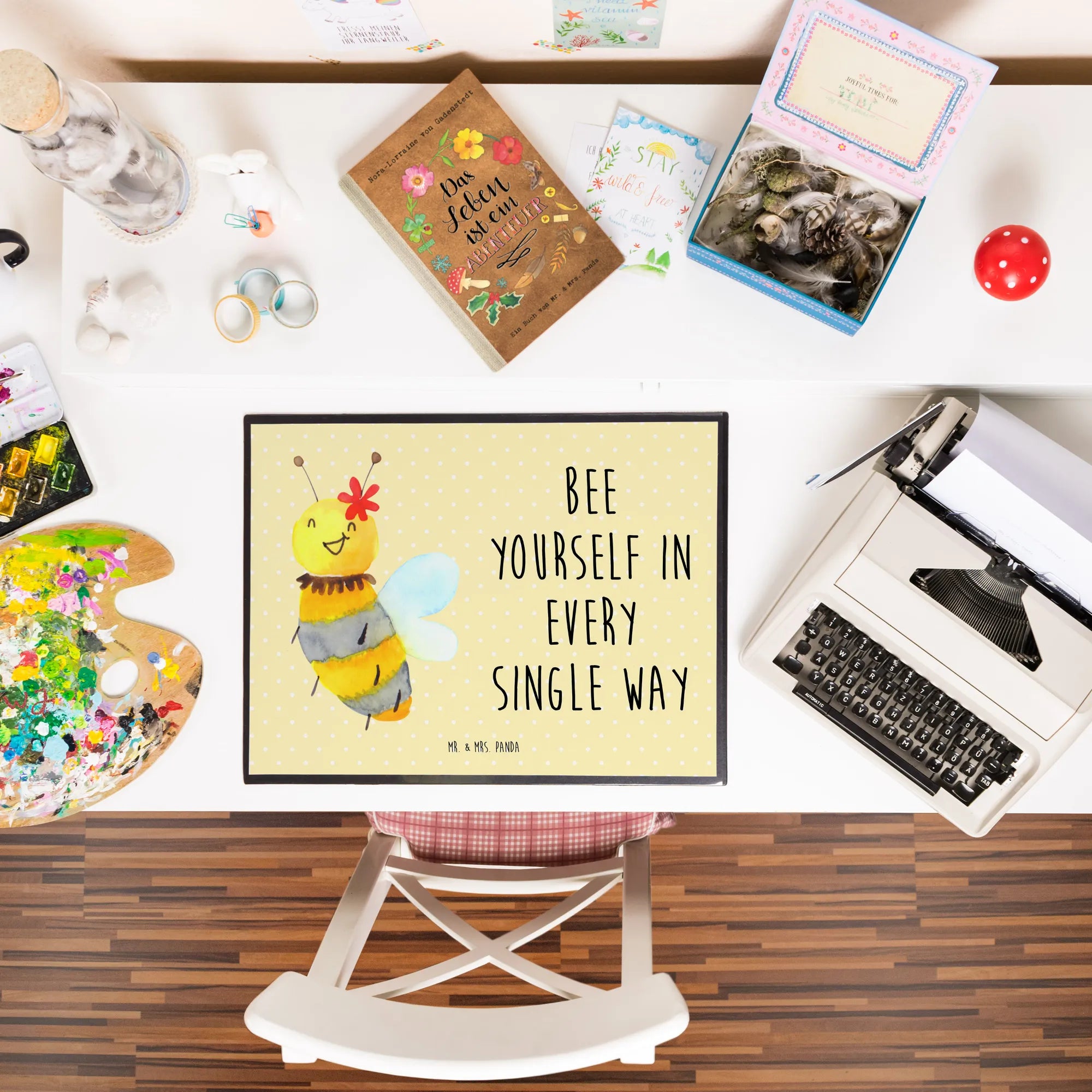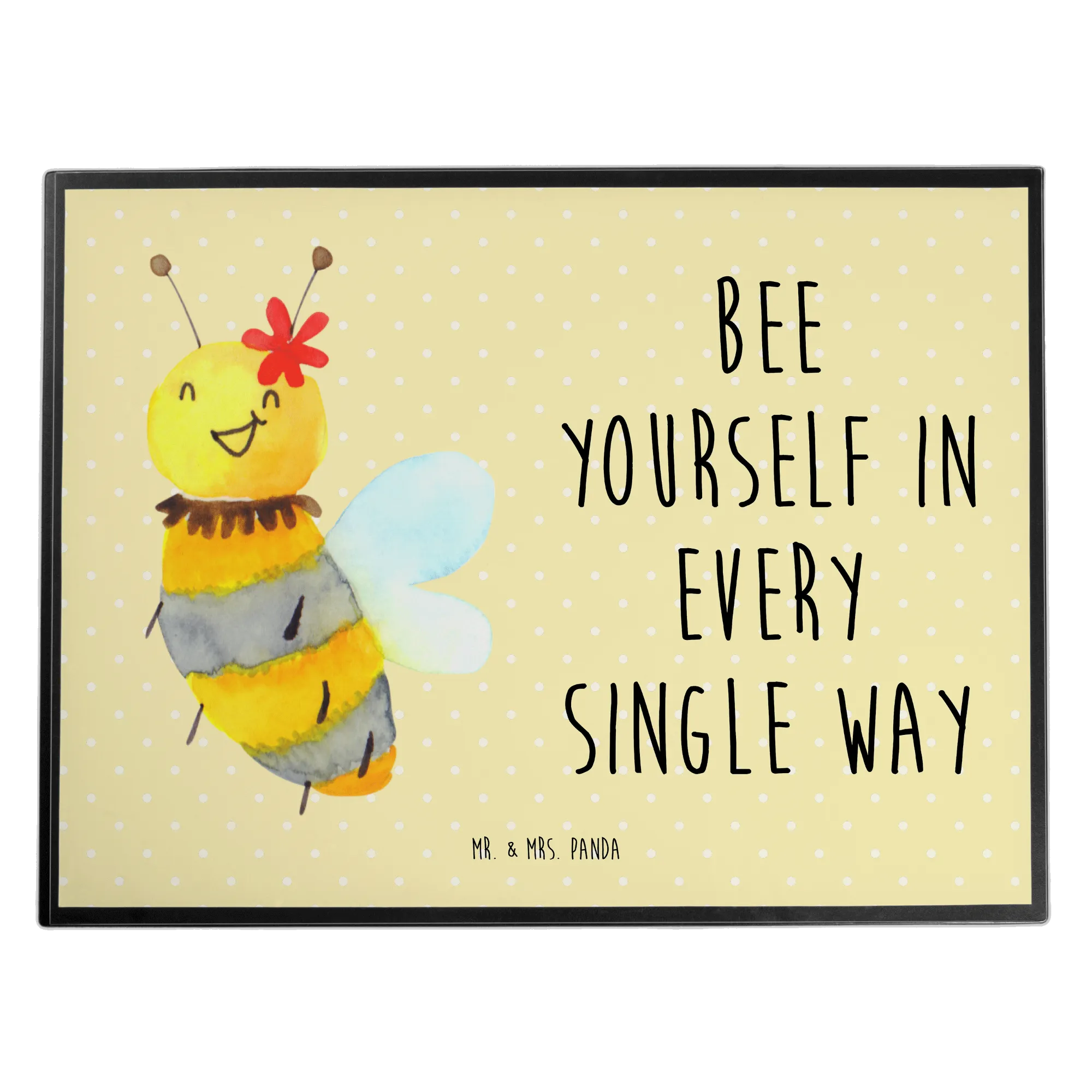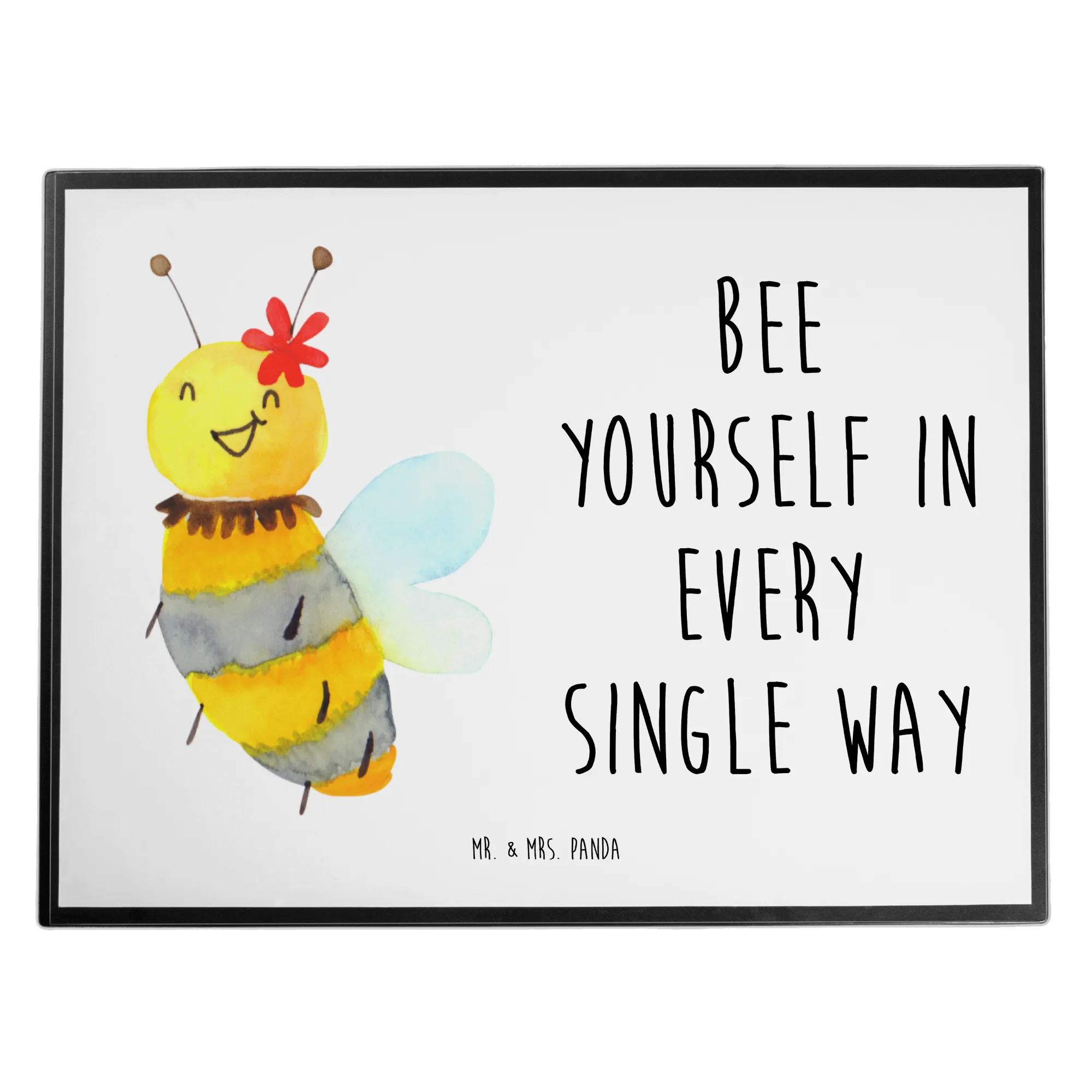 Die Schreibtischunterlage Biene Blume von Mr. & Mrs. Panda ist der perfekte Begleiter für alle, die den Schreibtisch mit einem Hauch von Natur und Fröhlichkeit verschönern wollen. Mit dem liebevollen Motiv einer süßen Biene, die auf einer zarten Blume sitzt, und dem inspirierenden Slogan 'Bee yourself in every single way', wird das Arbeiten gleich viel kreativer.