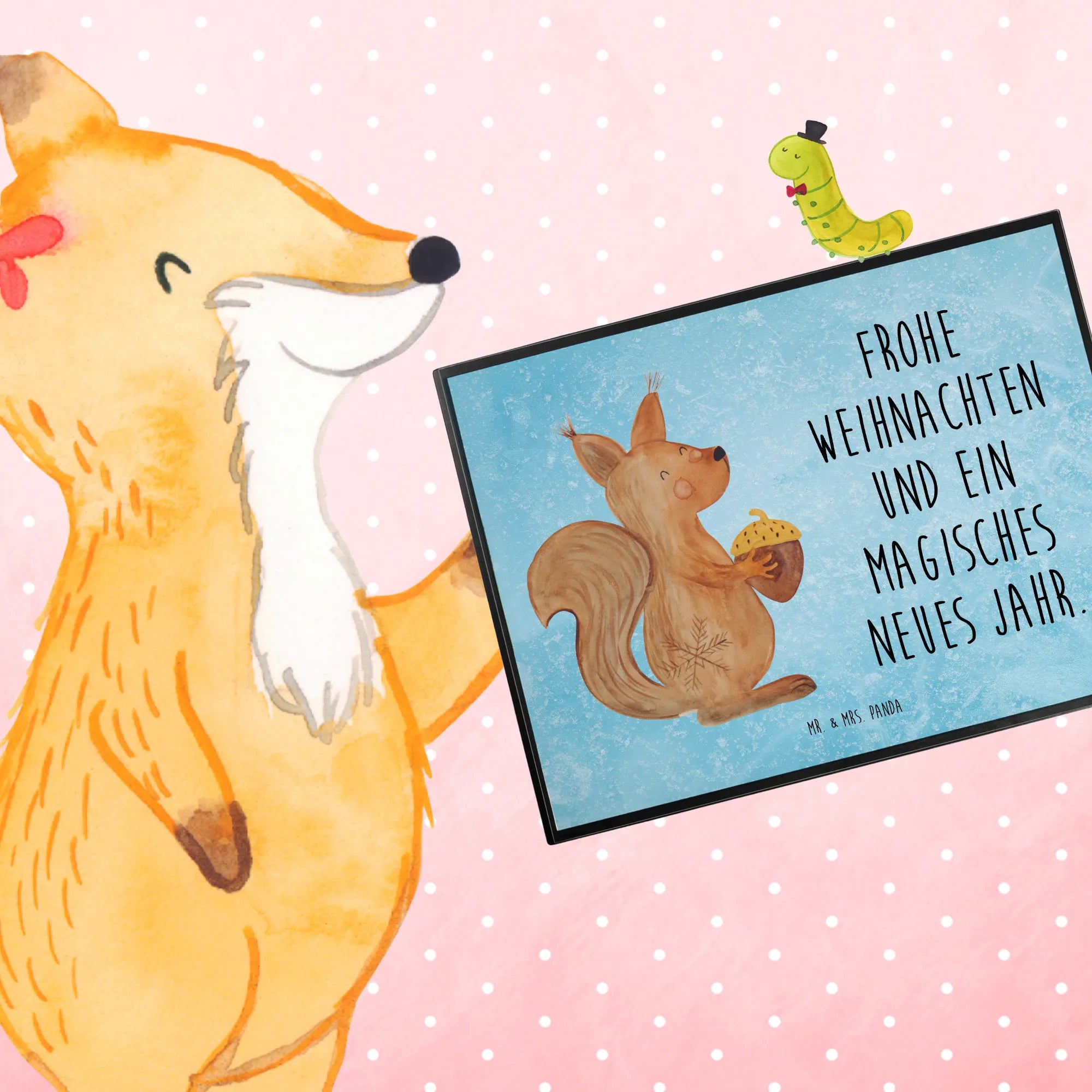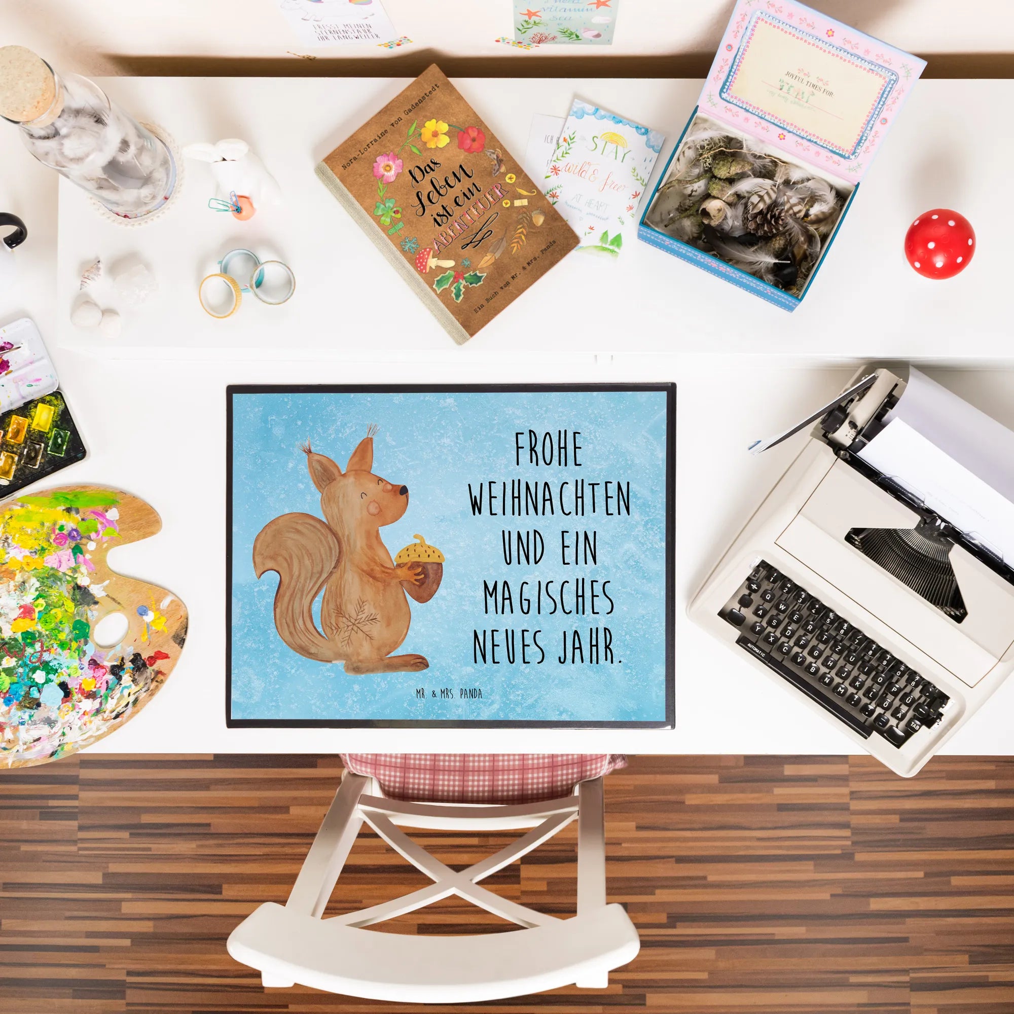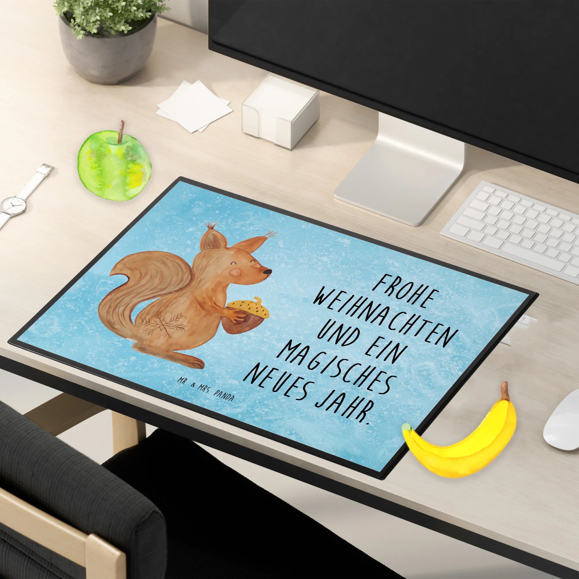 Die Schreibtischunterlage "Eichhörnchen Weihnachtszeit" aus der Winter Kollektion von Mr. & Mrs. Panda ist der perfekte Begleiter für alle, die die kalte Jahreszeit lieben! Mit ihrem charmanten Design zaubert sie direkt ein Lächeln auf dein Gesicht. Das niedliche Eichhörnchen mit den großen, freundlichen Augen und dem flauschigen Schwanz bringt den zauberhaften Glanz der Winterzeit auf deinen Schreibtisch. Dieses liebevoll gestaltete Motiv – gepaart mit dem Spruch "Frohe Weihnachten und ein magisches neues Jahr" – sorgt für eine fröhliche Atmosphäre während der festlichen Zeit.