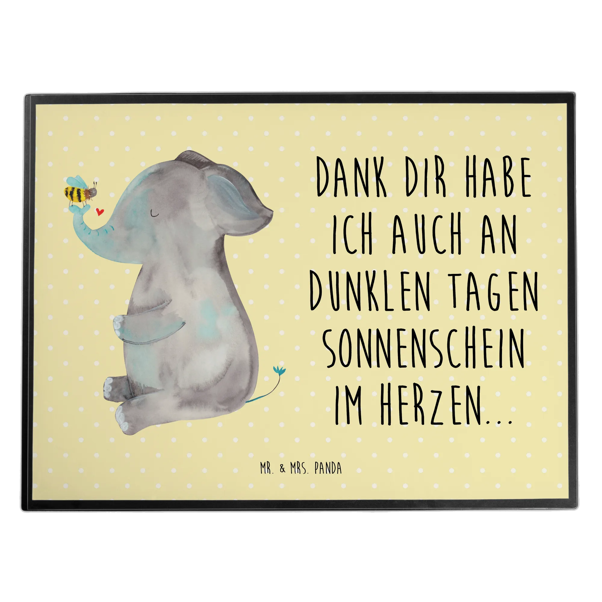 Der Elefant steht für Stärke und Schutz, während die Biene Fleiß und Zusammenarbeit symbolisiert. Die inspirierende Botschaft "Dank dir habe ich auch an dunklen Tagen Sonnenschein im Herzen..." bringt ein Lächeln auf jedes Gesicht, insbesondere an stressigen Arbeitstagen.