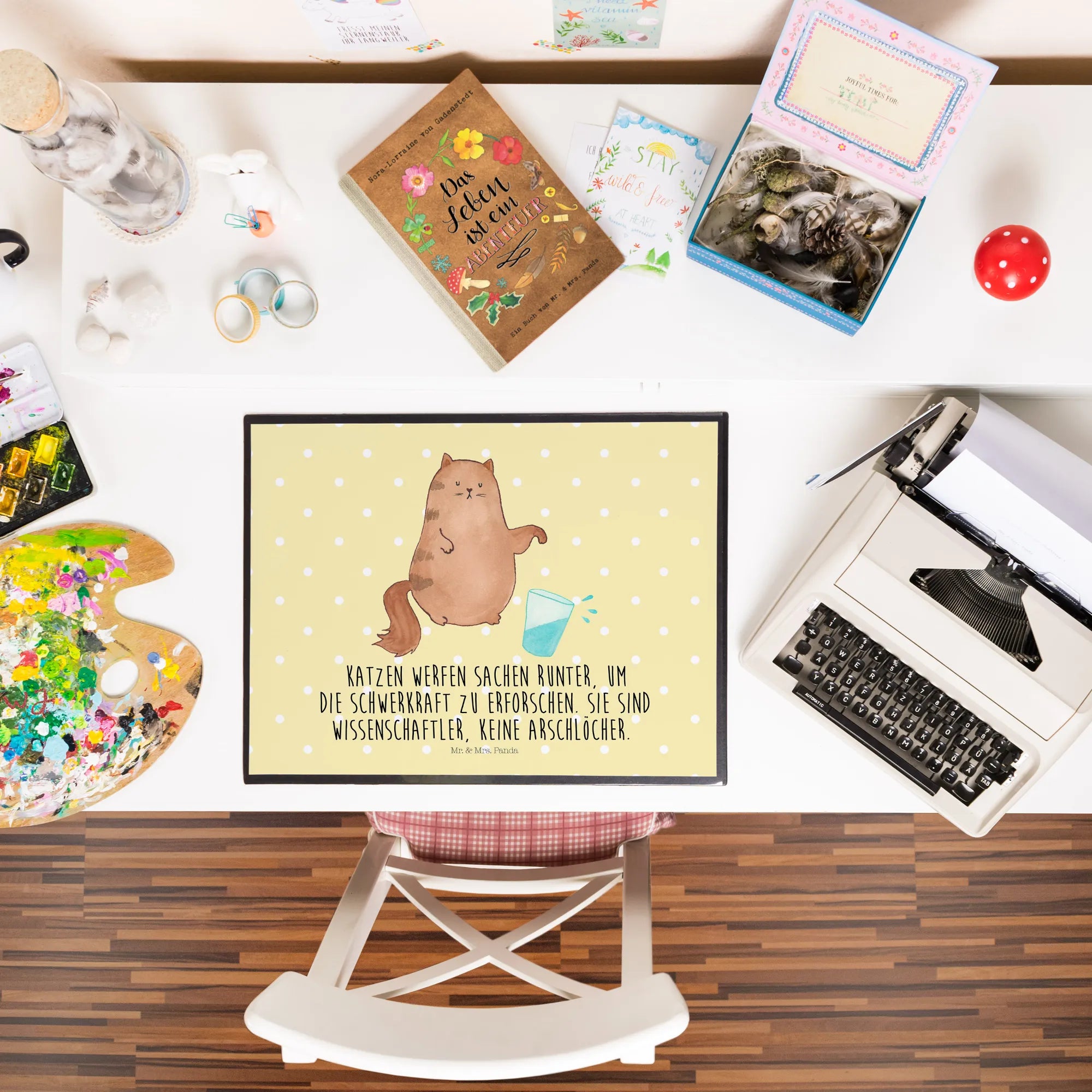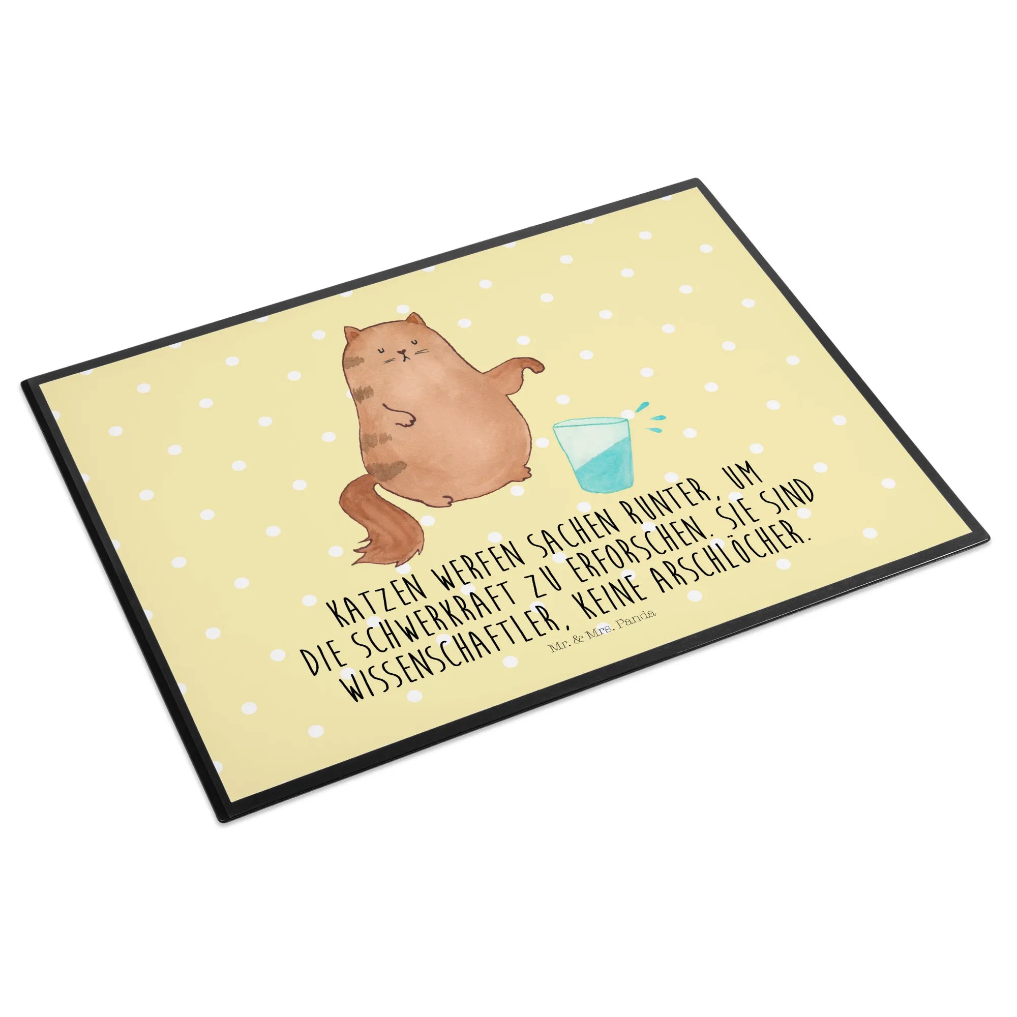 Entdecke die perfekte Schreibtischunterlage aus der Katzen-Kollektion von Mr. & Mrs. Panda! Diese Schreibtischauflage mit dem süßen Motiv einer kleinen Katze, die ein Wasserglas umstößt, ist nicht nur ein echter Hingucker, sondern auch ultra praktisch.