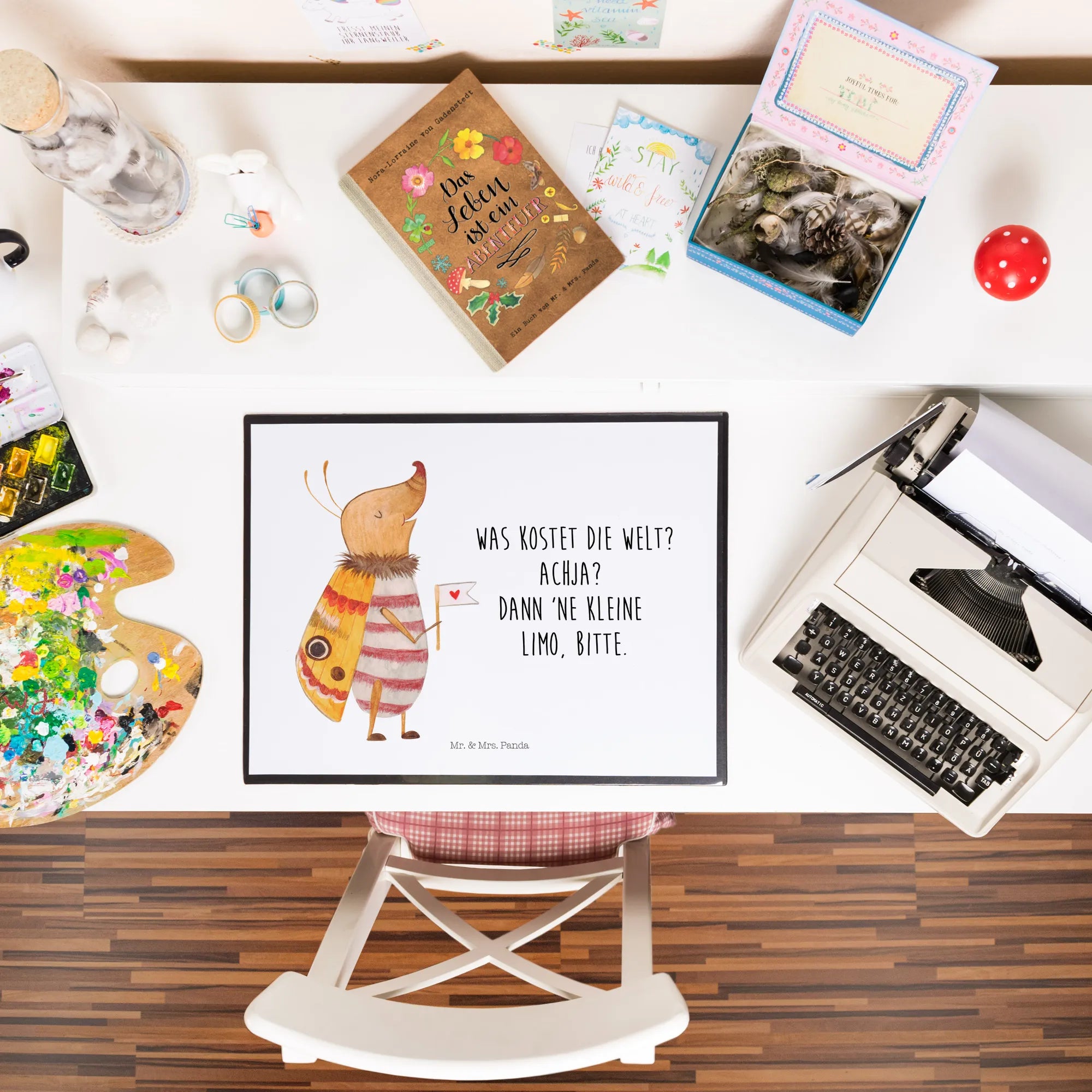 Stell dir vor, in der sanften Abenddämmerung, unter einem sternklaren Himmel, entdeckst du einen kleinen, glücklich aussehenden Nachtfalter. In seinen zarten Fühlern hält er stolz eine Fahne, auf der ein liebevoll gezeichnetes Herz prangt. Sein Blick ist neugierig und voller Freude, als würde er die ganze Welt umarmen wollen. Der Spruch 'Was kostet die Welt? Achja? Dann ne kleine Limo, bitte.' klingt wie ein fröhliches Lachen in der Stille der Nacht. Dieses Motiv von Mr. & Mrs. Panda fängt ein Gefühl von Unbeschwertheit und Glück ein, das uns im Alltag oft abhandenkommt. Es erinnert uns daran, dass die einfachen Freuden im Leben, wie die Neugier und die Freude an kleinen Dingen, unermesslich wertvoll sind. Die liebevolle Darstellung des Nachtfalters, gepaart mit dem humorvollen Spruch, ist eine Ode an die Leichtigkeit des Seins. Es ist eine Einladung, sich wieder an den kleinen Wundern des Lebens zu erfreuen, sie zu umarmen und mit einem Lächeln im Herzen durch die Welt zu gehen.