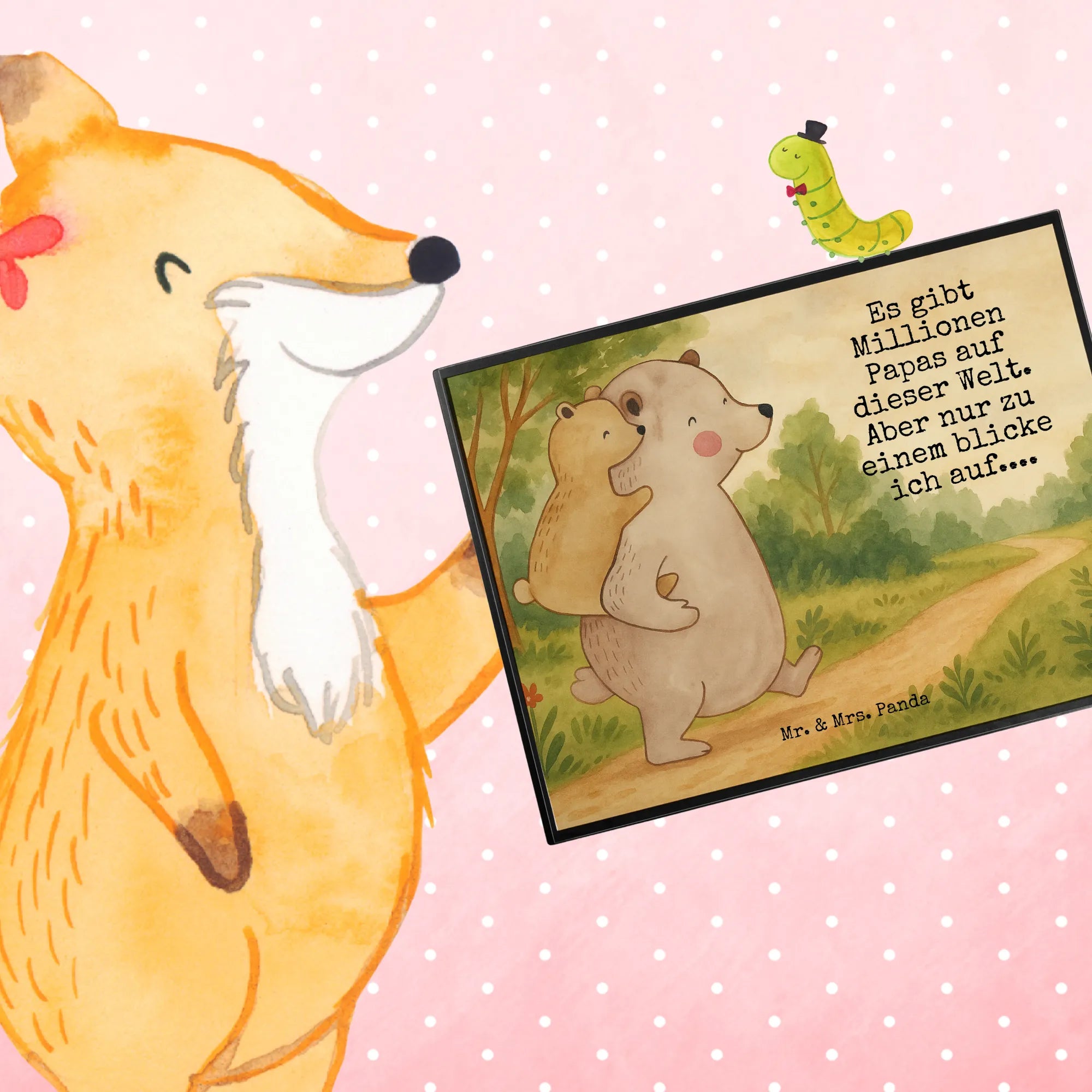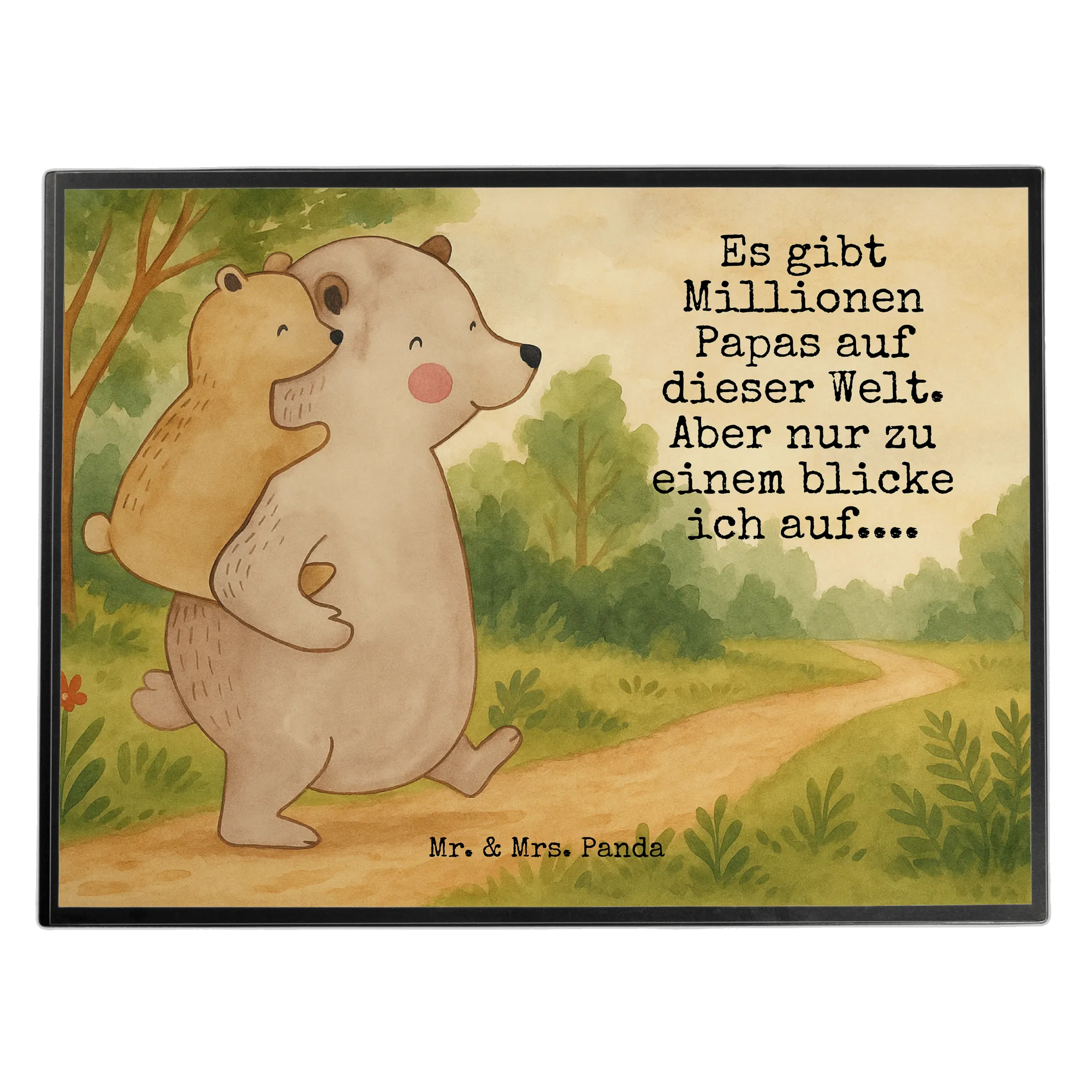 Auf diesem Motive sehen wir einen großen Bären, der stolz seinen kleinen Bären trägt. Der große Papa-Bär zeigt mit einem weit ausschreitenden Schritt die Freude des Lebens und die Verbundenheit, während der kleine Bär voller Vertrauen auf seinem Rücken sitzt. Ihr Lächeln spricht Bände über die innige Beziehung zwischen Vater und Kind, und das Zitat, "Es gibt Millionen Papas auf dieser Welt. Aber nur zu einem blicke ich auf", spiegelt diese unverwechselbare Liebe wider. Ein bezauberndes Geschenk für jeden Vatertag oder Geburtstag, das zeigt, wie besonders Papas in unserem Leben sind.