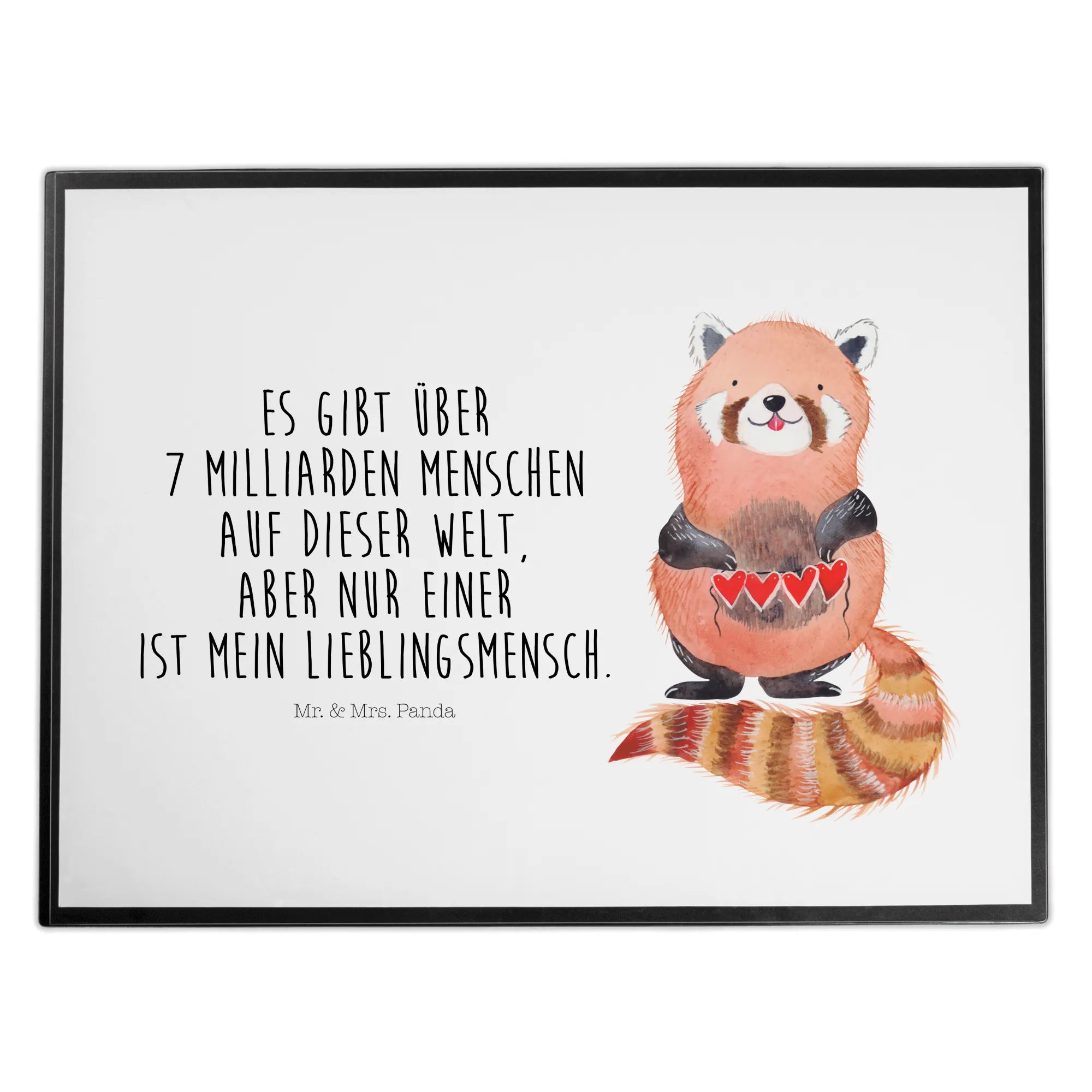 Das Universum von Mr. & Mrs. Panda ist voller Charme und Liebe, so auch das entzückende Motiv des Roten Pandas, der liebevoll eine Herzgirlande präsentiert. 'Es gibt über 7 Milliarden Menschen auf dieser Welt, aber nur einer ist mein Lieblingsmensch', lautet der herzerwärmende Spruch, der jene unbeschreibliche Verbindung zu unserem Lieblingsmenschen unterstreicht. Dieses Motiv feiert die Einzigartigkeit jener Beziehung, die Tiefe der Gefühle, die wir teilen, und die Schönheit, jemanden gefunden zu haben, der unser Leben mit Licht füllt. Der Rote Panda steht als Symbol für Liebe, Fürsorge und die Freude, einen Menschen zu haben, der unser Alltägliches außergewöhnlich macht. Mit seiner sanften Ausstrahlung und den liebevollen Details lädt das Motiv uns ein, denjenigen zu ehren, der für uns mehr als nur ein Mensch ist - unser Lieblingsmensch.