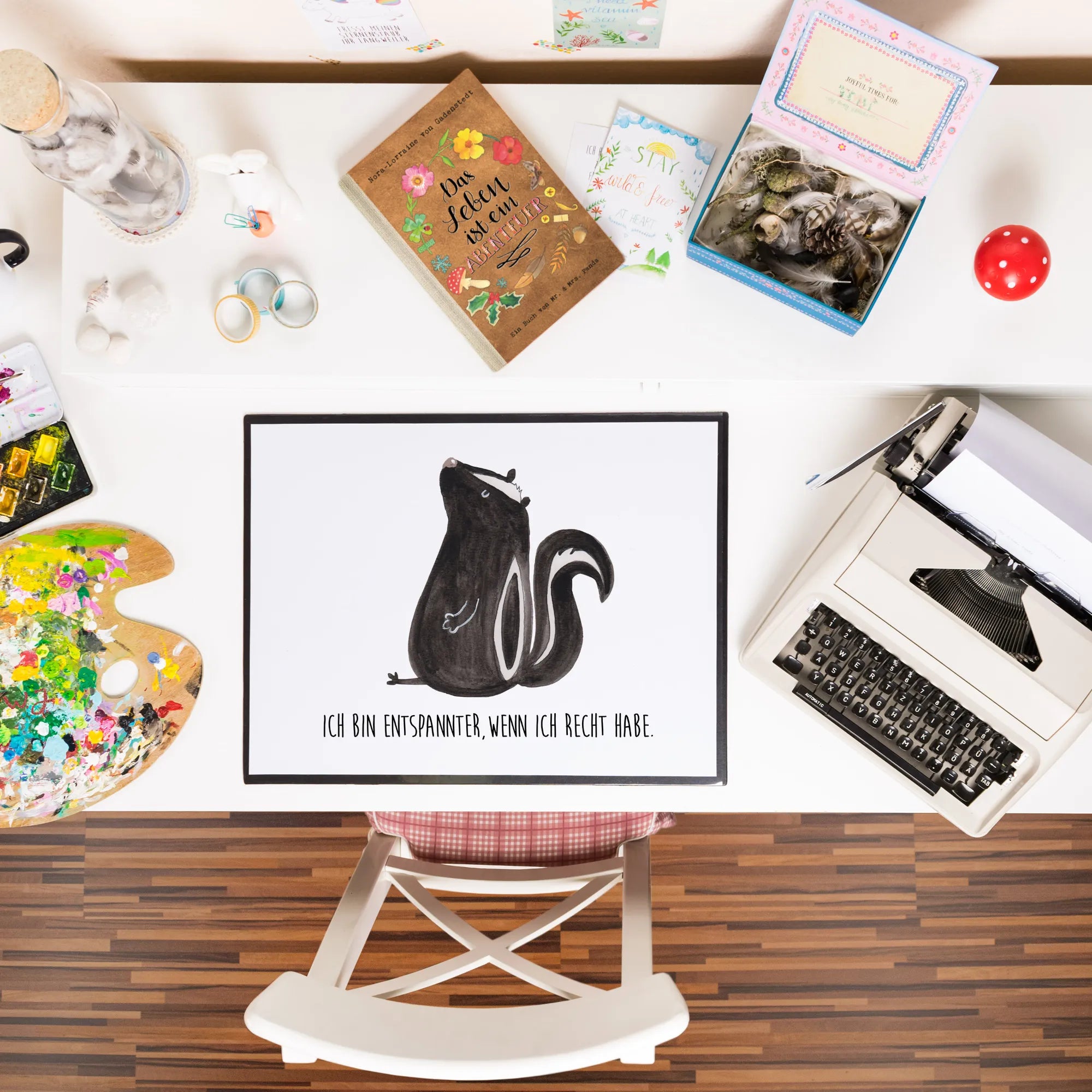 Erlebe mit der Stinktier-Kollektion von Mr. & Mrs. Panda ein Stück lebendige Erinnerung. Jedes Design, liebevoll handgezeichnet von Mrs. Panda, erzählt eine Geschichte von Herrn Blume – dem treuen Stinktier, das nicht nur durch seine Persönlichkeit, sondern auch durch seine besonderen Momente mit Mrs. Panda in Erinnerung bleibt. Diese Kollektion ist eine Hommage an die Zeiten des Lachens, der Ruhe und des einfachen Beisammenseins. Ob als Dekoration für dein Zuhause oder als Geschenk für einen lieben Menschen, jedes Stück bringt Wärme und Freude in den Alltag. Lass dich von dieser Kollektion inspirieren, den Charme und die Leichtigkeit in deinem Leben zu umarmen – dank der zauberhaften Motive und Sprüche, die auf vielfältige Produkte gedruckt werden.