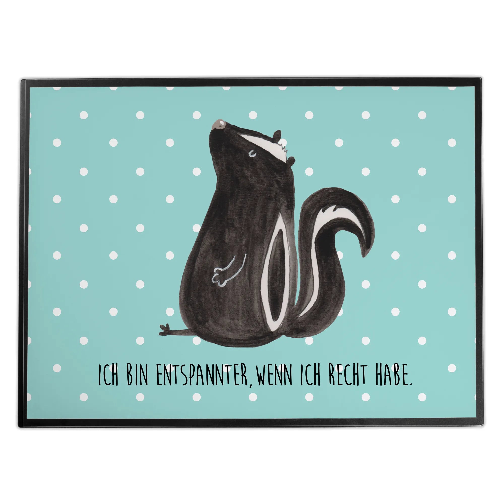 Das süße sitzende Stinktier, liebevoll in Aquarell gemalt und auf einer pastelblauen Fläche gestaltet, wird Dich stets daran erinnern, entspannt zu bleiben und das Beste aus jeder Situation zu machen. Die Besonderheit dieser Schreibtischunterlage ist die Einlegelasche an der Seite, mit der Du das Motiv ganz einfach wechseln kannst – so wird es nie langweilig!