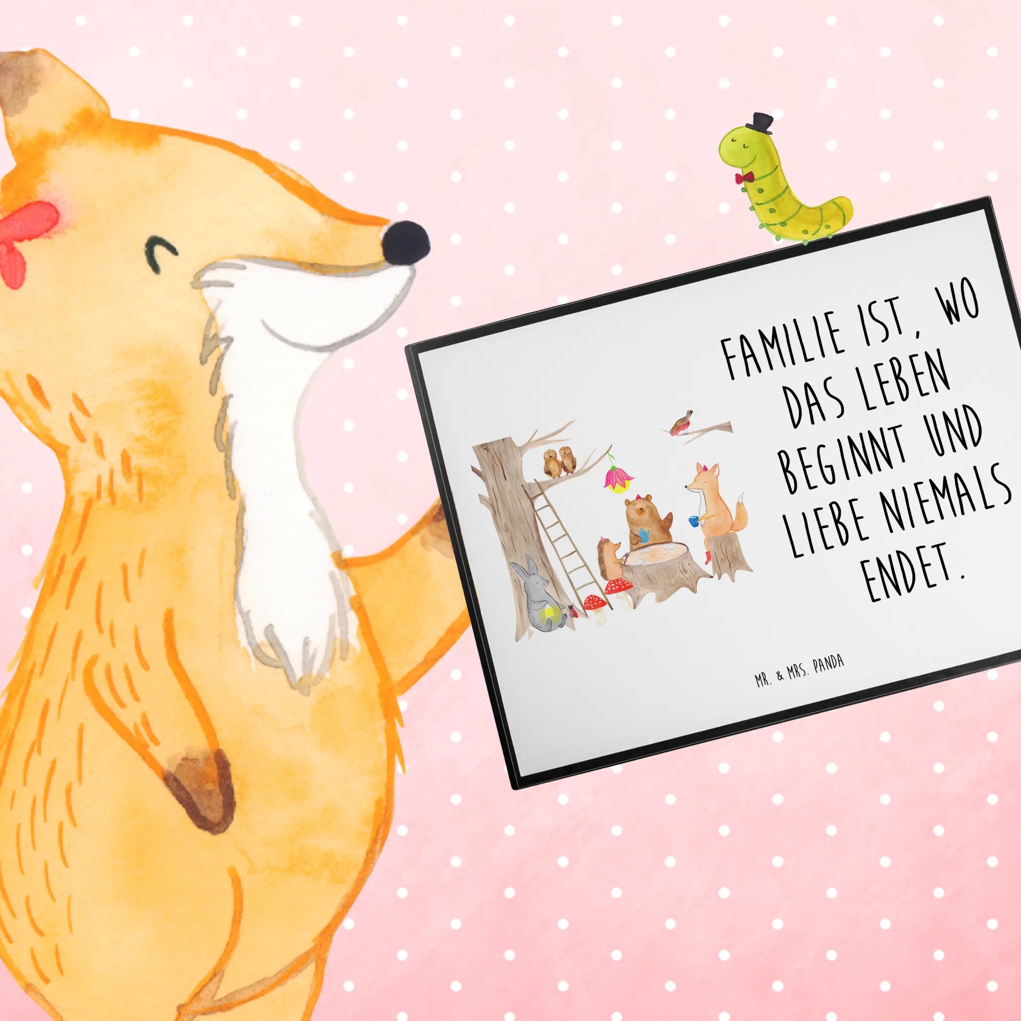 Stell dir vor, tief im Wald, unter dem dichten Blätterdach, versammeln sich die Waldtiere zu einem herzlichen Picknick. Ein Fuchs, ein Hase, ein Igel, eine Maus und ein Eichhörnchen teilen liebevoll zubereitete Leckereien aus den Gaben des Waldes. Sie lauschen den Geschichten des Windes, während sie sich in der Wärme der Gemeinschaft sonnen. Dieses Bild ist eine Hommage an die Familie – die Wurzel unseres Seins, wo das Leben beginnt und die Liebe niemals endet. Es erinnert uns daran, wie wichtig es ist, Zeit miteinander zu verbringen und die kleinen Momente zu schätzen. Das Motto „Familie ist, wo das Leben beginnt und Liebe niemals endet“ zieht sich wie ein roter Faden durch dieses zauberhafte Motiv von Mr. & Mrs. Panda. Es versprüht Freude, Liebe und das tiefe Gefühl von Zugehörigkeit, das in jeder Familie wurzelt.